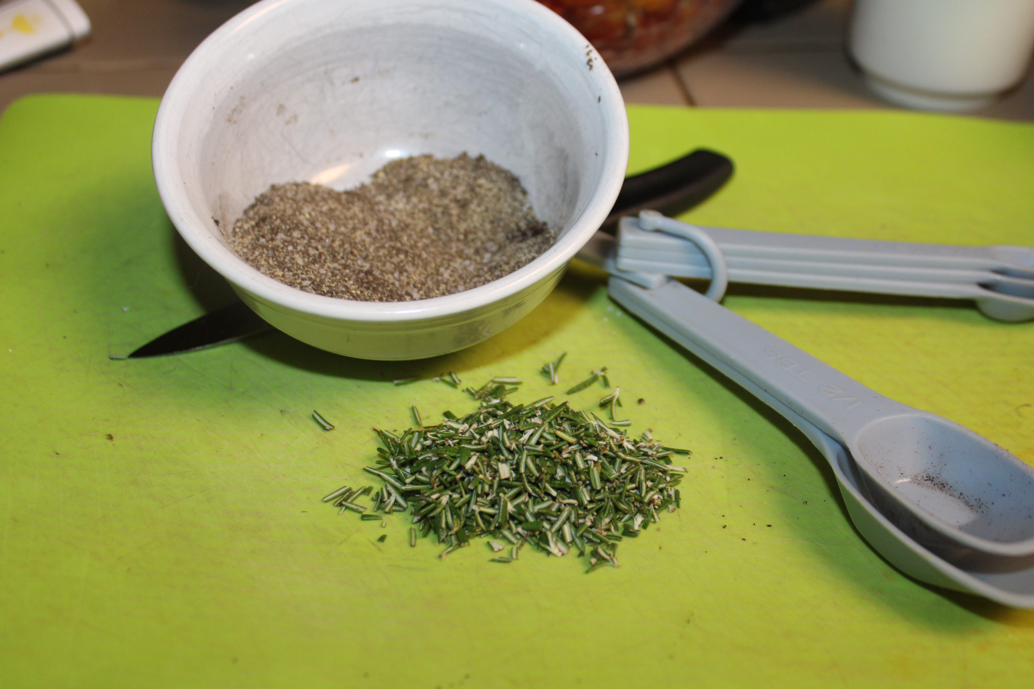 Strip needles from the rosemary sprigs. Finely mince, place in a small bowl. Add salt, pepper, ground coffee and garlic powder. Mix well.