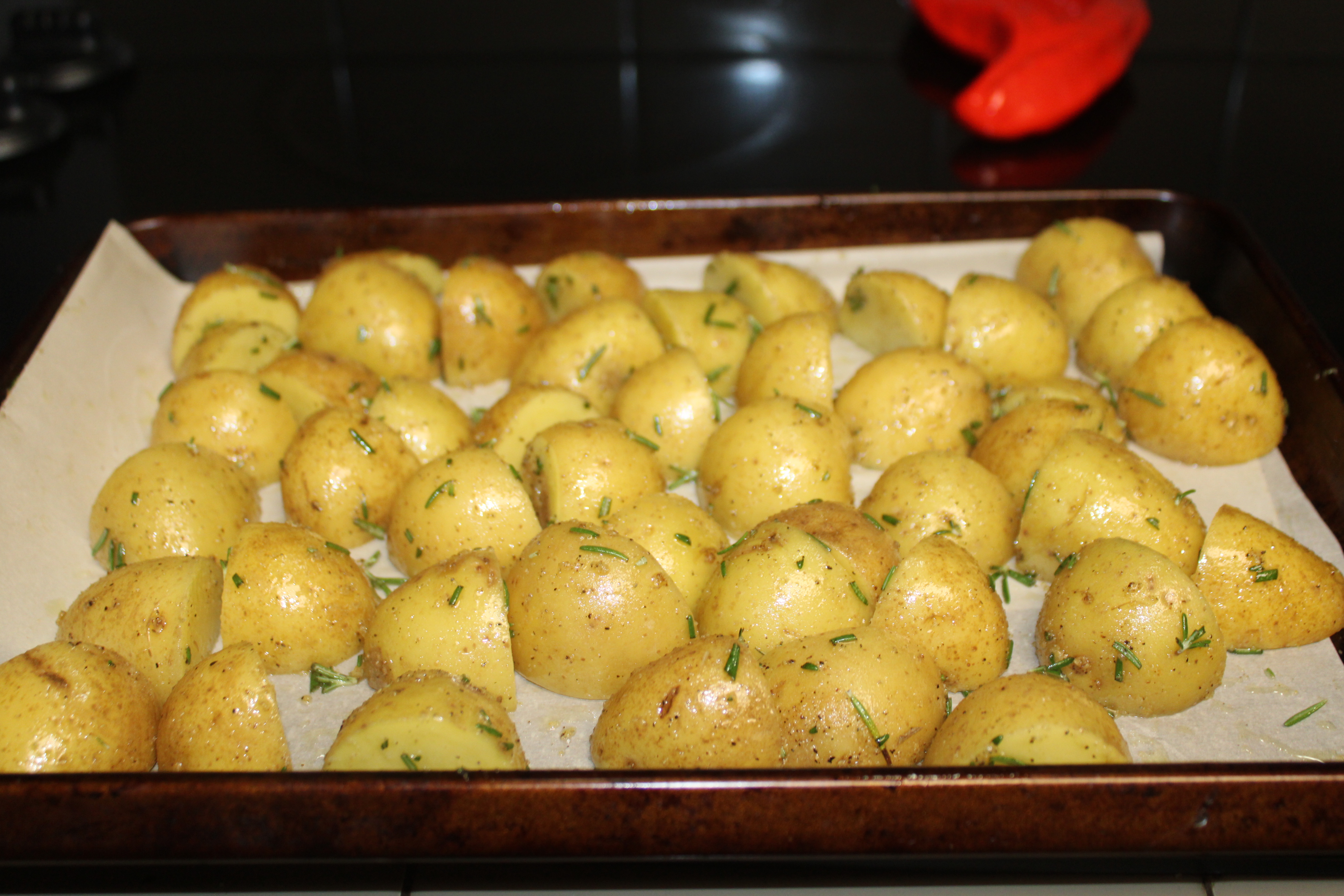 Cut potatoes in half, place in a bowl. Drizzle with olive oil. Season with garlic powder, salt and pepper. Strip Rosemary needles from sprigs, finely dice and scatter over the potatoes. Toss to blend.