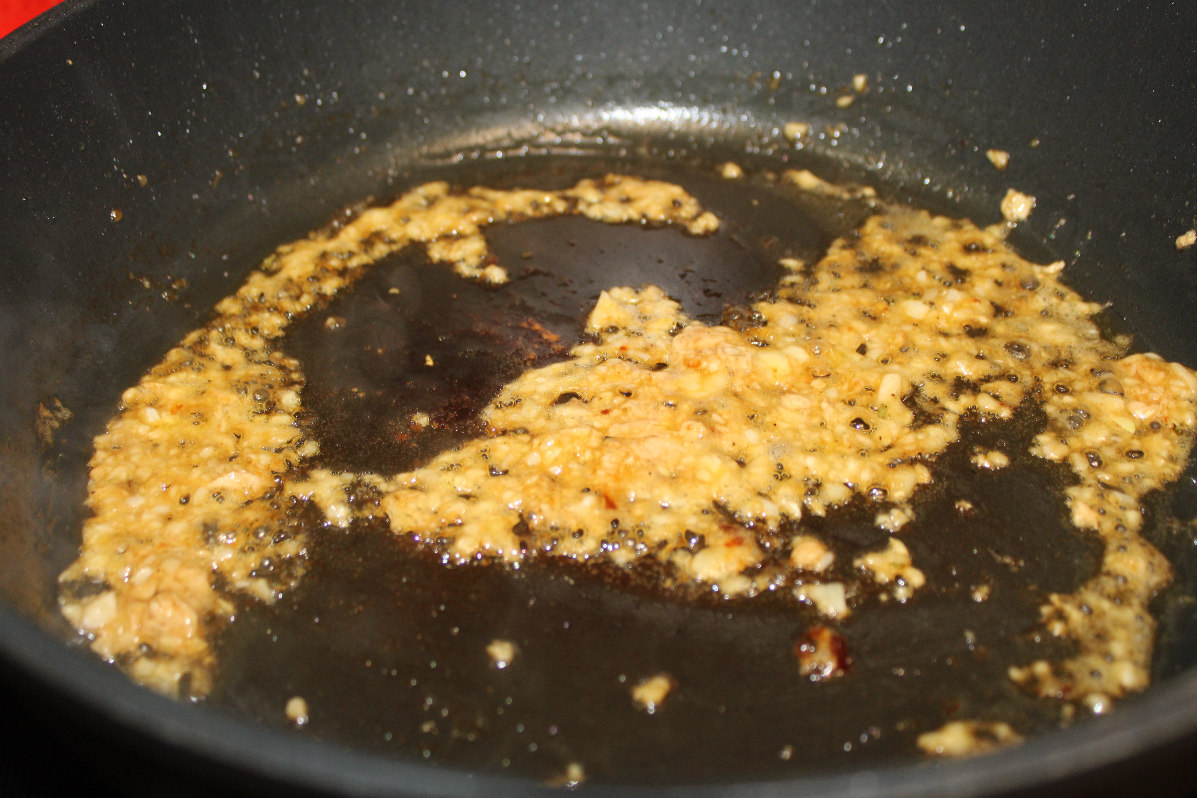 Lower the heat under the now empty skillet to medium. Add minced garlic, sauté for a minutes. Stir in chicken stock; simmer for about 3 minutes, scraping up any browned bits at the bottom of the pan.