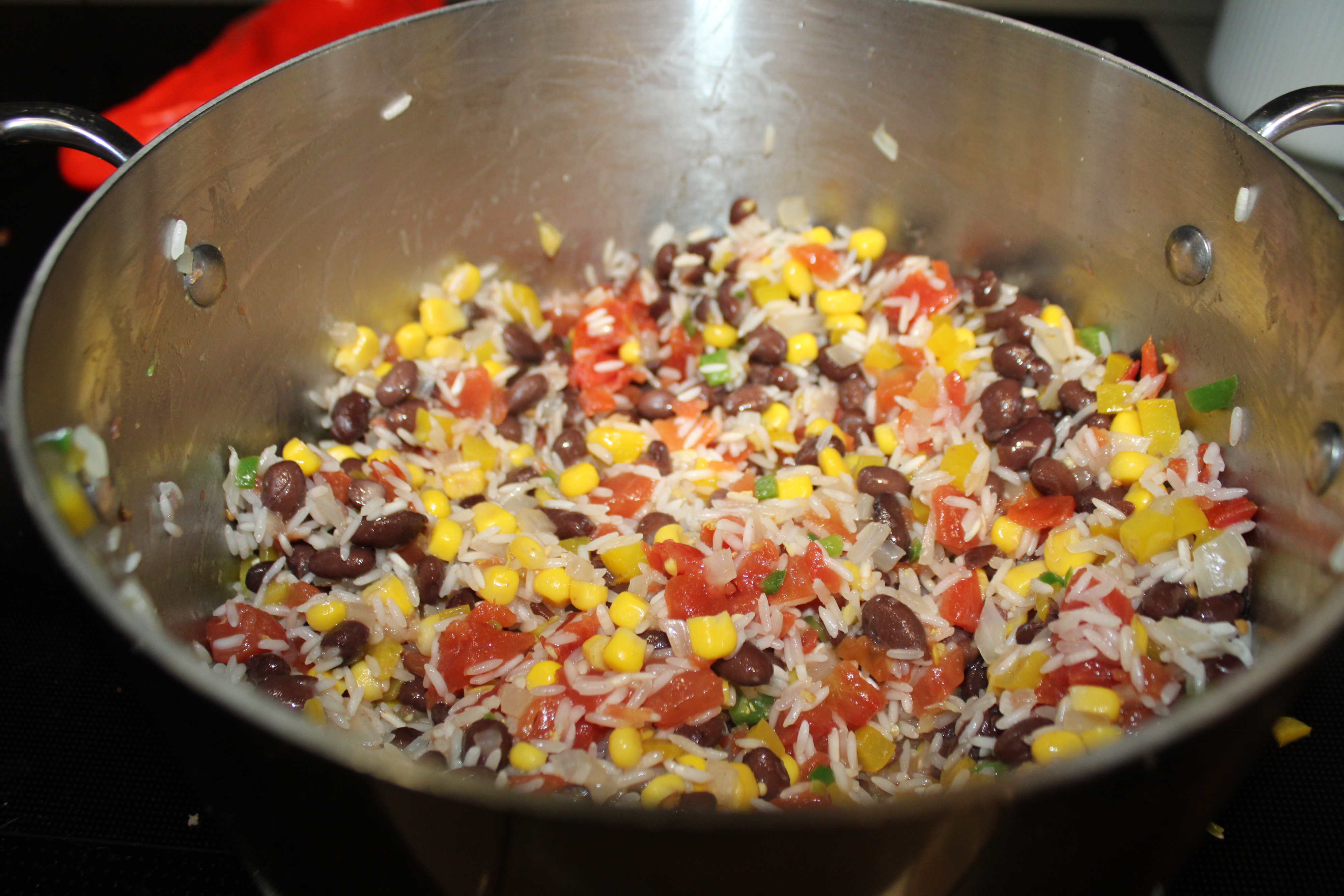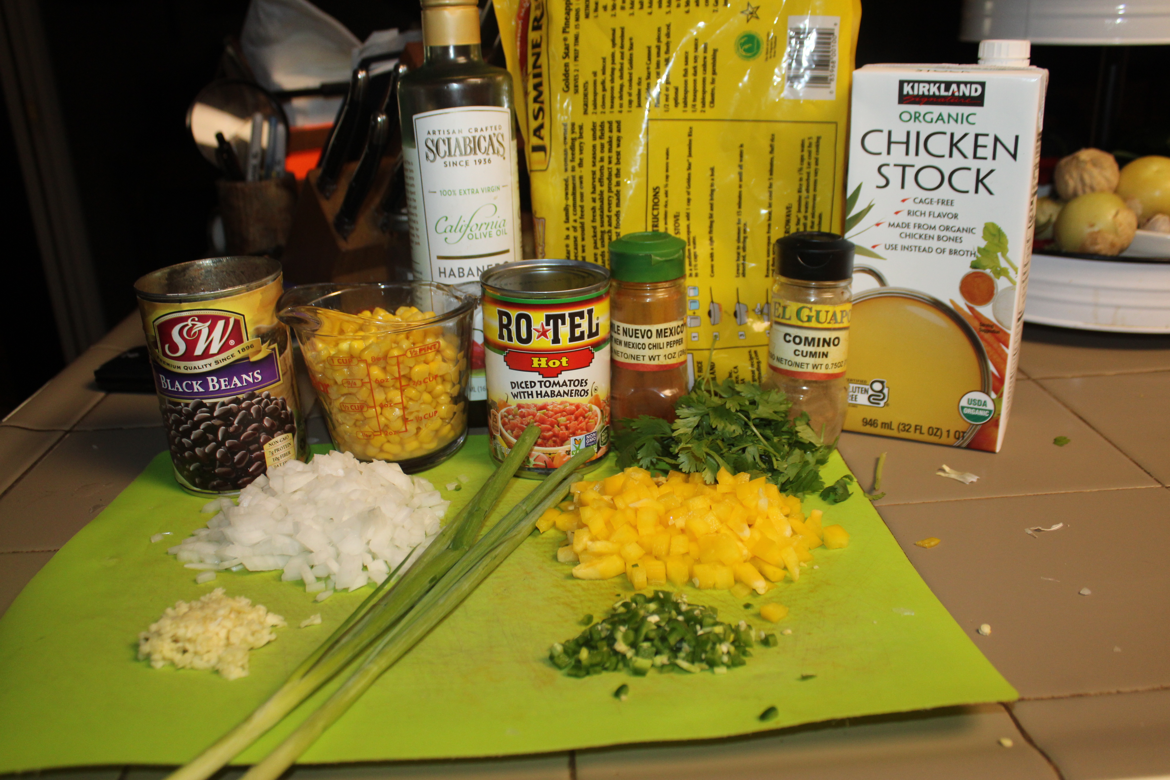Peel and dice onion, set aside. Stem, core and dice bell pepper. Stem hot peppers. Peel and mince garlic. Rinse corn and black beans.