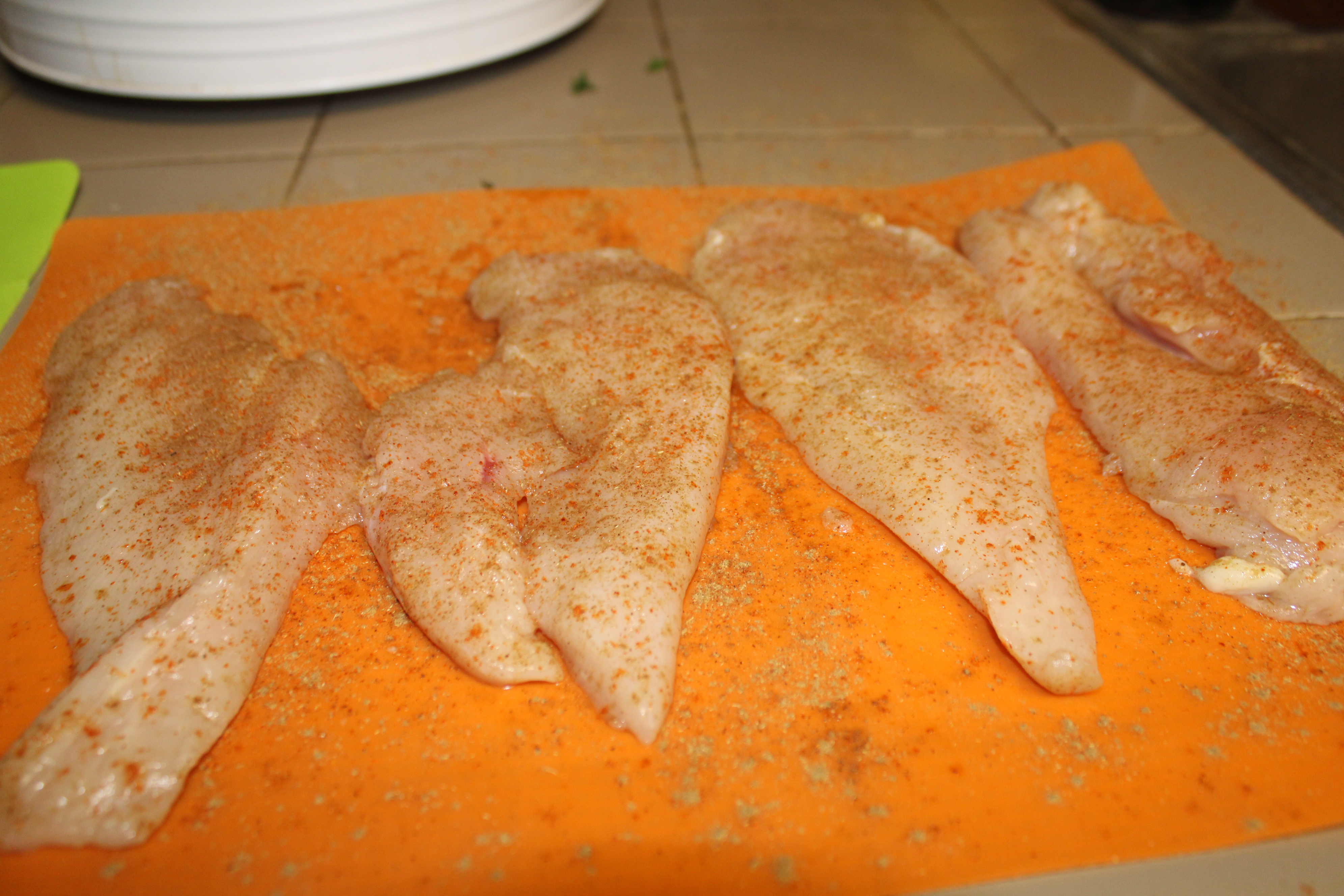 Slice each breasts in half lengthwise to create for thinner breasts. Sprinkle both sides with cumin and cayenne seasonings.