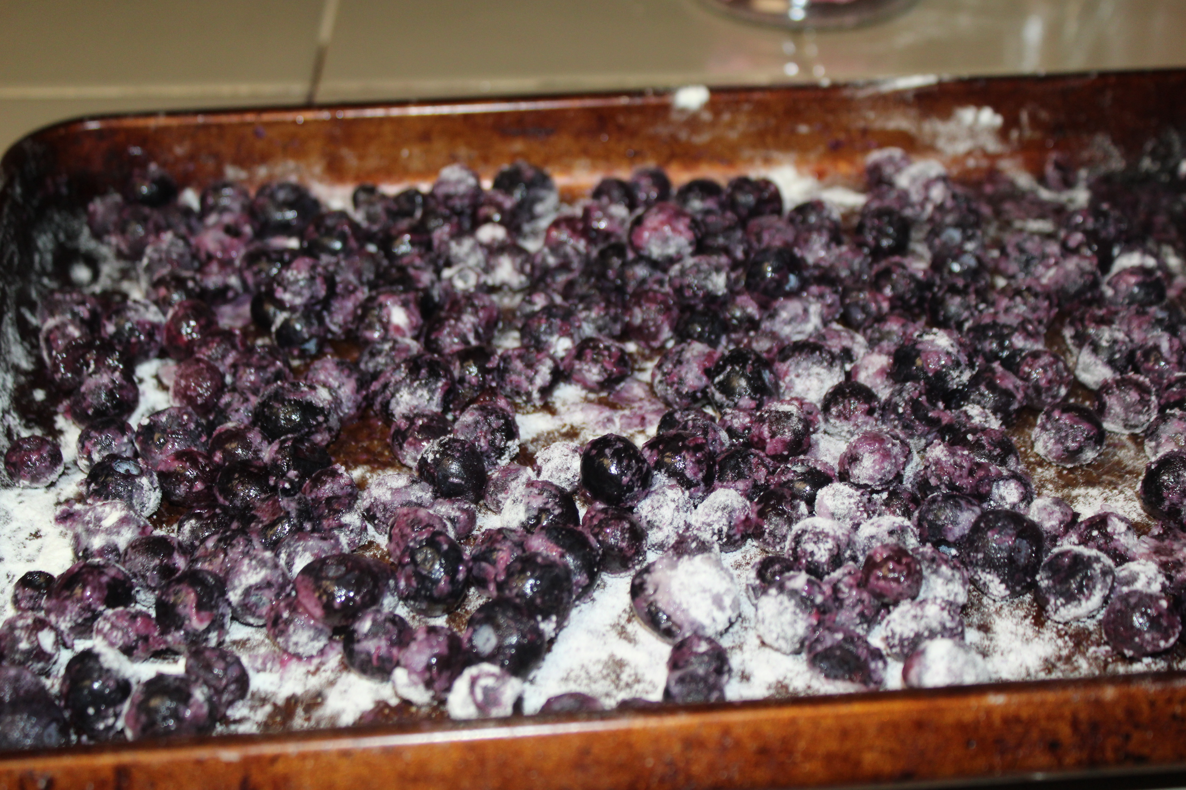 Spread blueberries out onto a rimmed baking pan. Pat dry with paper towels. Sprinkle with a quarter cup of the flour, toss to coat and set aside.