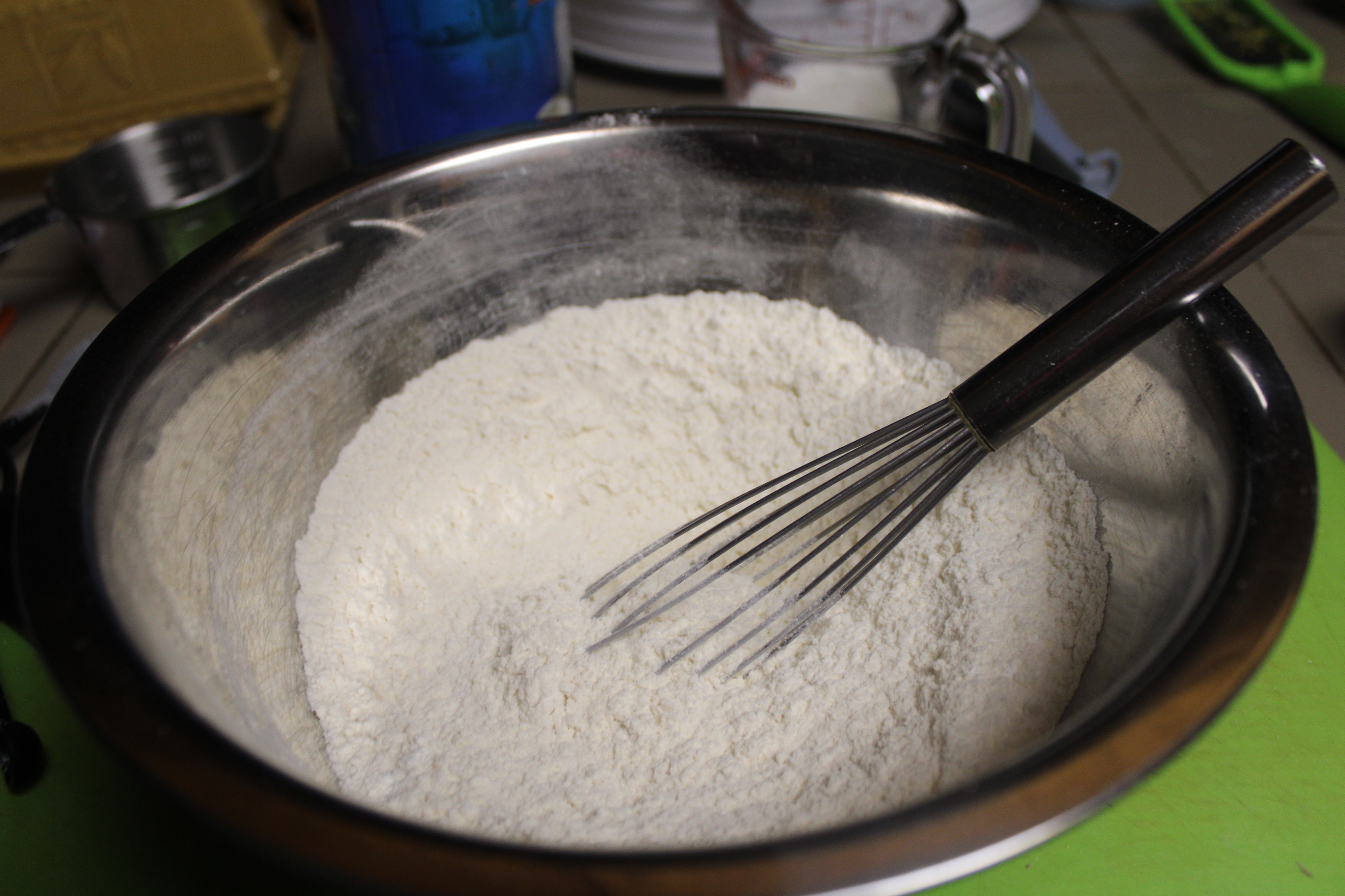 In a separate bowl wish together remaining 1-3/4 cup flour, the baking powder and salt. Add half of the dry ingredients into the bowl of the stand mixer. Give the mixing paddle a few turns to slowly incorporate the flour. Add the coagulated milk, blend well. By hand stir in the remaining flour mixture just until moistened and there are no dry spots remaining.
