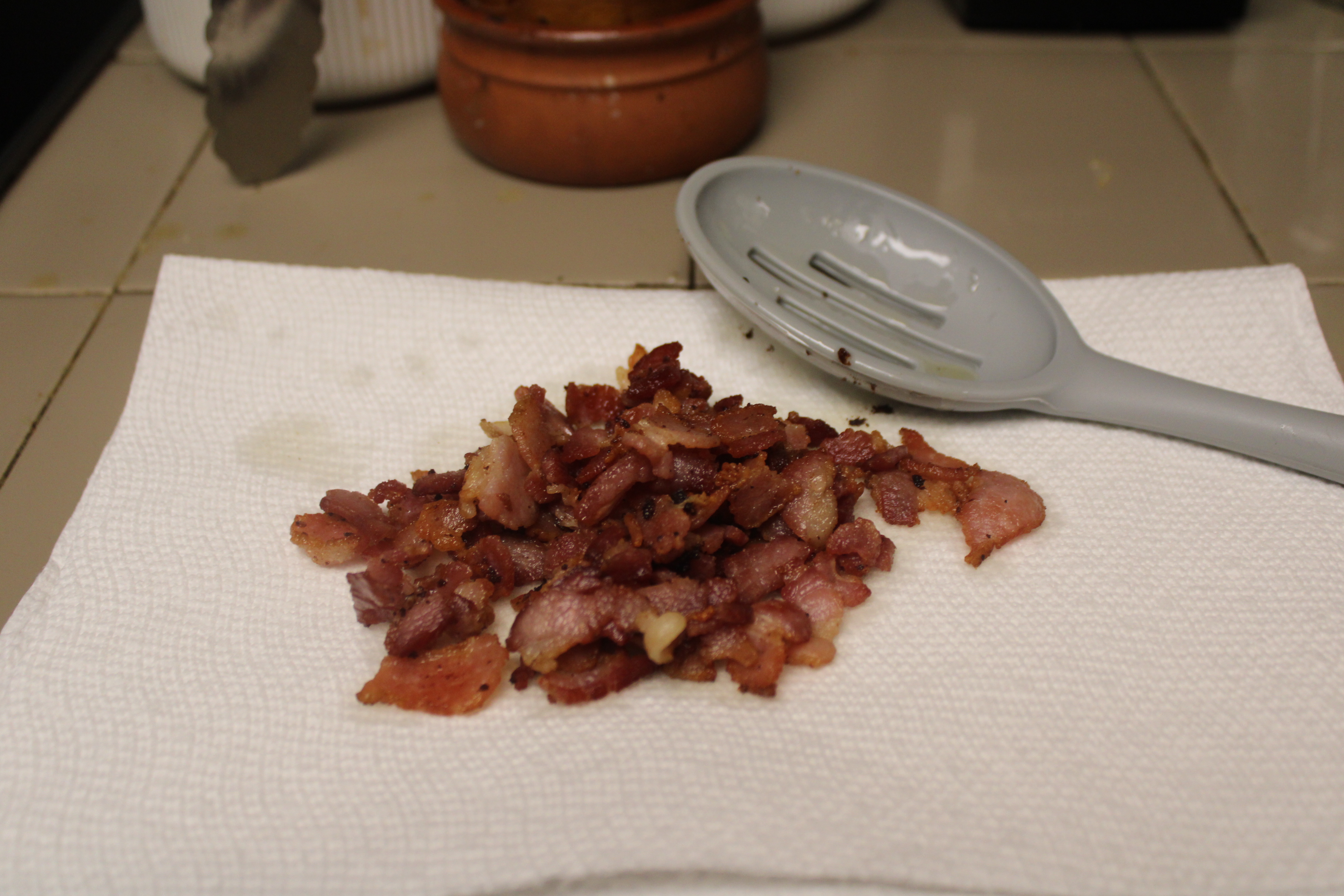 In a large saucepan over medium heat cook bacon, stirring often, until it starts to brown and has rendered some of its fat, about 3 minutes. Using a slotted spoon, transfer the bacon bits to paper towels to drain. Reserve the bacon until the end.