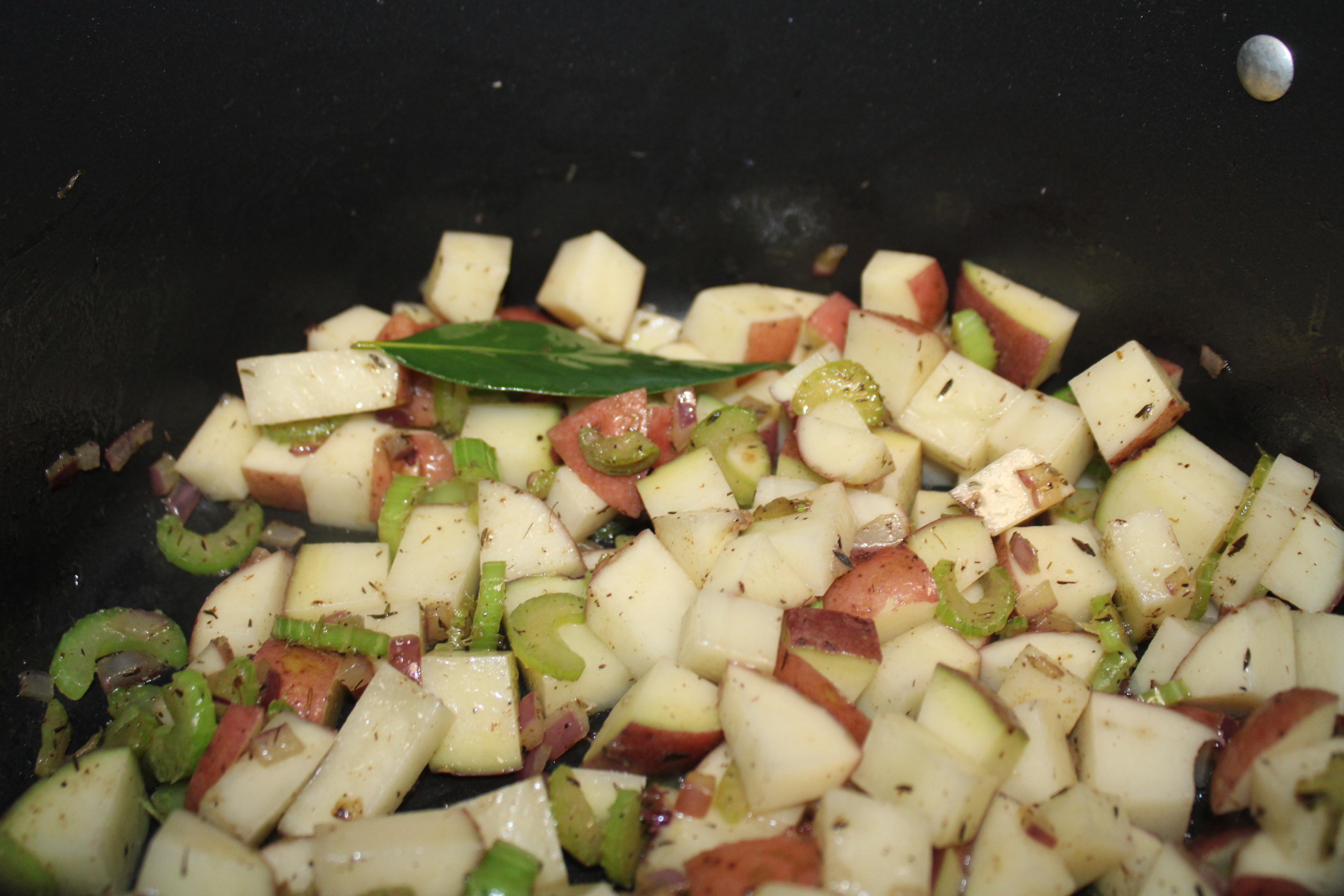 Add the butter to the bacon drippings in the pan. When the butter has melted, add celery, onions,. Thyme and bay leaf. Gently sauté until the onions are translucent, about 2 minutes. Add the potatoes, stir well. Add reserved clam liquid, stock of choice and water. Bring the chowder to a boil. Reduce heat to low; cover and simmer until the potatoes are tender, about 15 to 20 minutes.