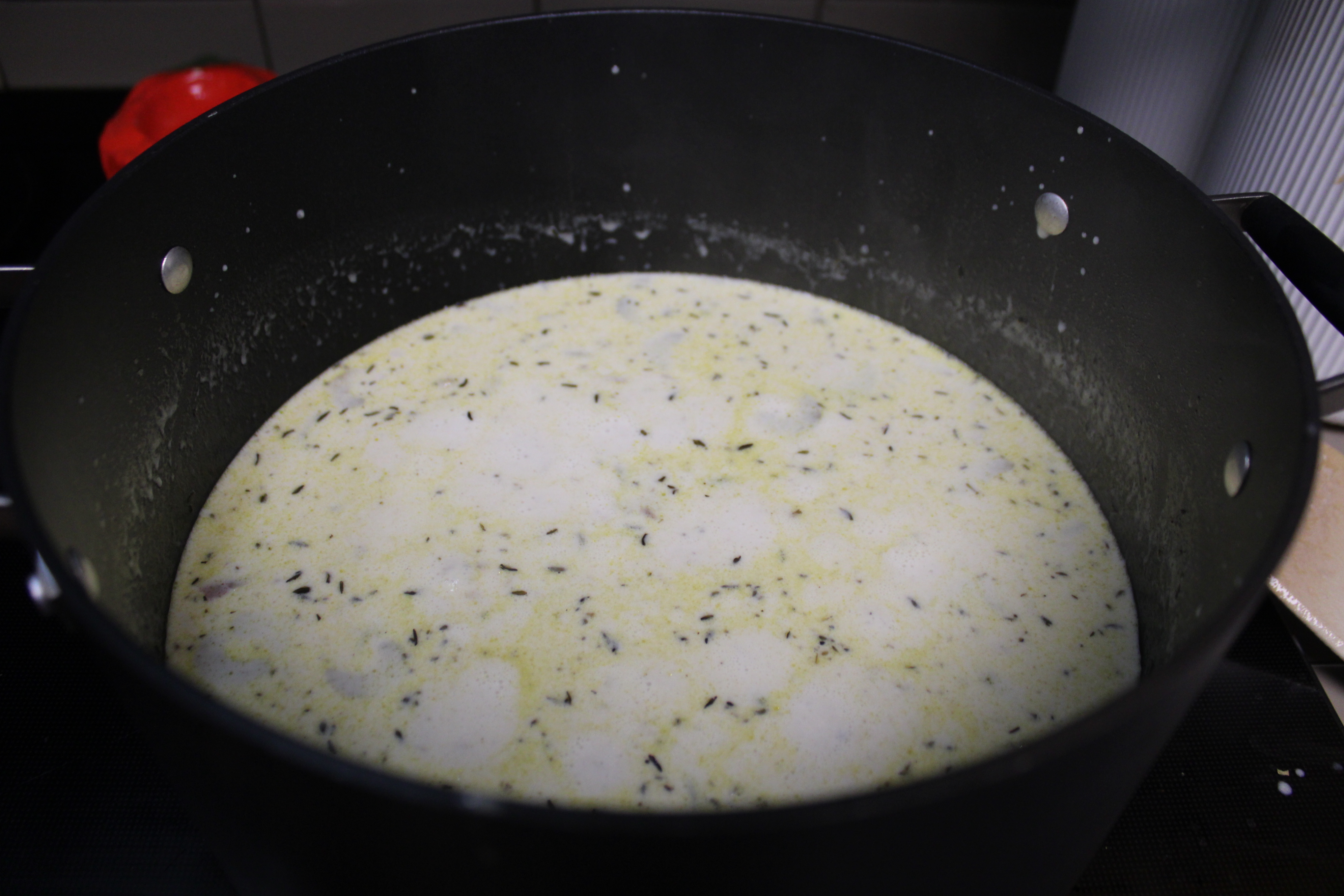 This all brings me to today’s Clam Chowder. I love clam chowder. I especially love the smoky, salty goodness that bacon brings to the dish. However; as a Catholic that would be a no-no. So this is truly an acceptable “cheat” if you will. On Fridays we can cook with chicken stocks or beef stocks, eggs, butter and other animal byproducts, just not the cow. The bacon itself in this recipe is used as a garnish, optional. Kiddo does not observe the abstinence practice. (I pray for him) while Hubby and I do. So while Kiddo will have bacon in his chowder, Hubby and I will have the essence of bacon without the meat itself. Yeah, it’s cheating. Maybe we’ll need to say an extra prayer or two. Never hurts to pray.