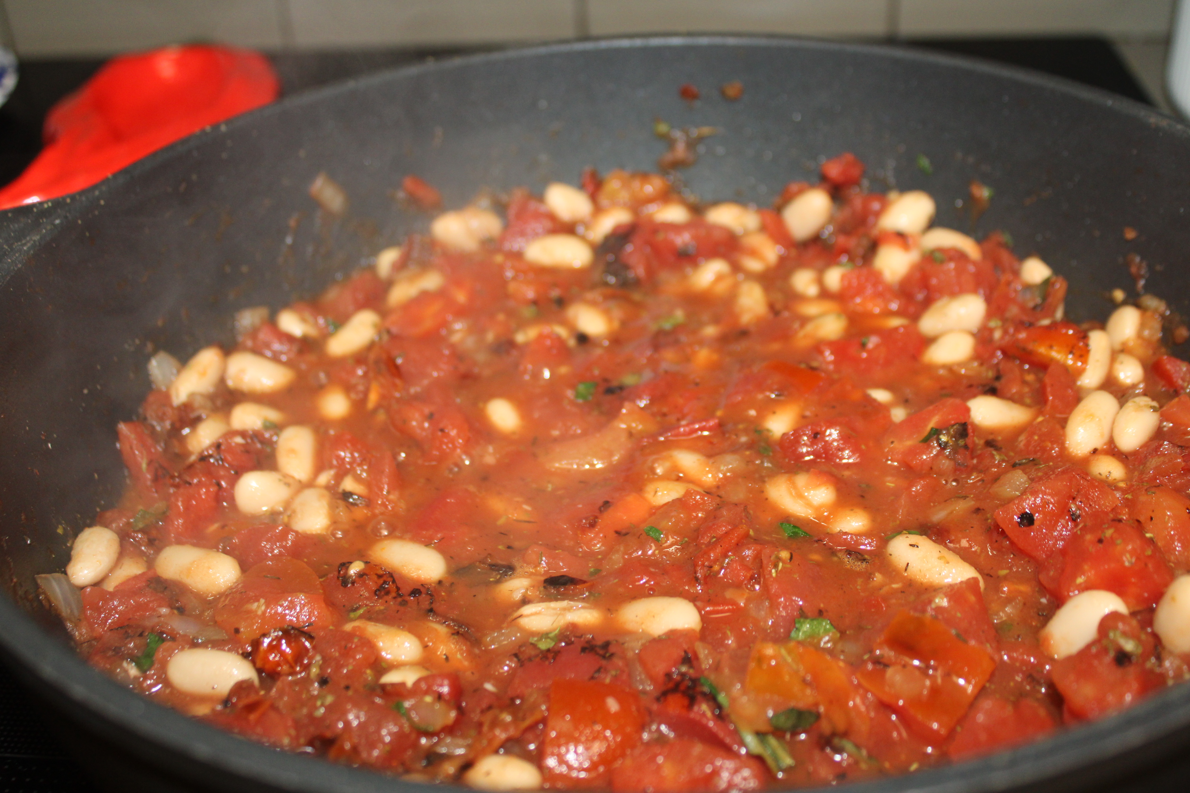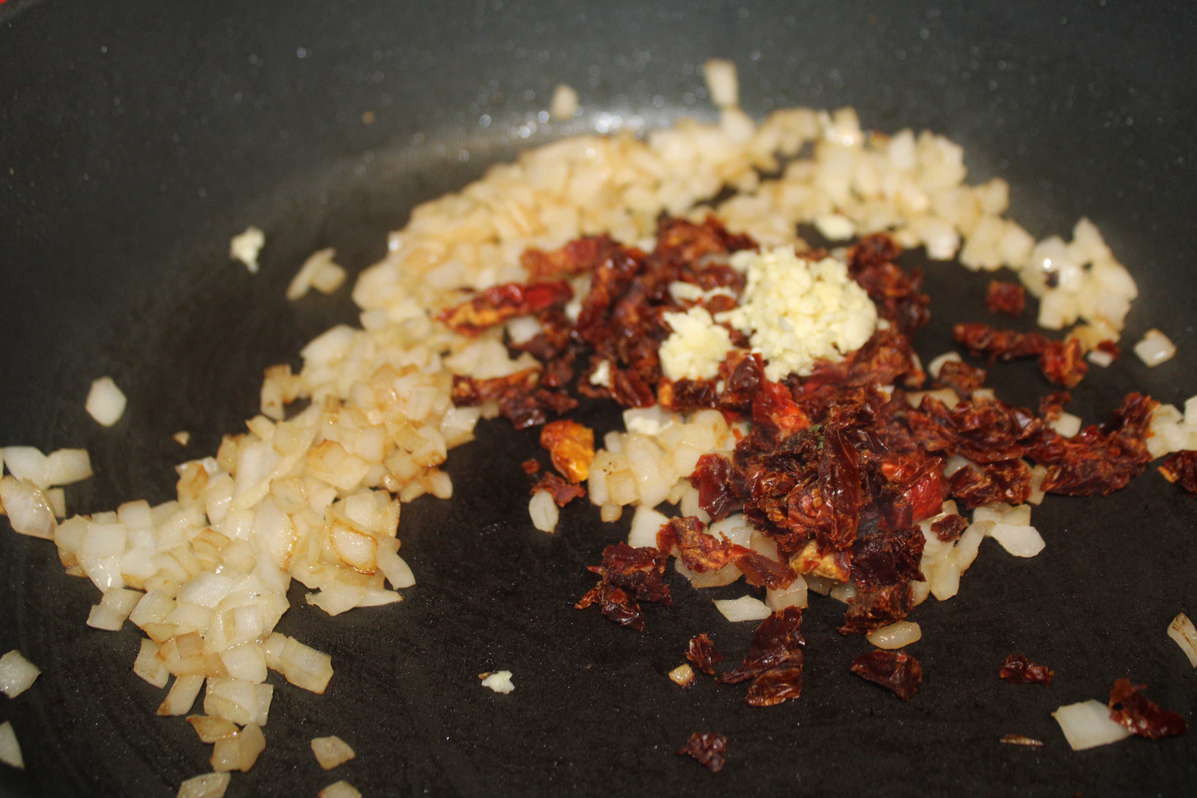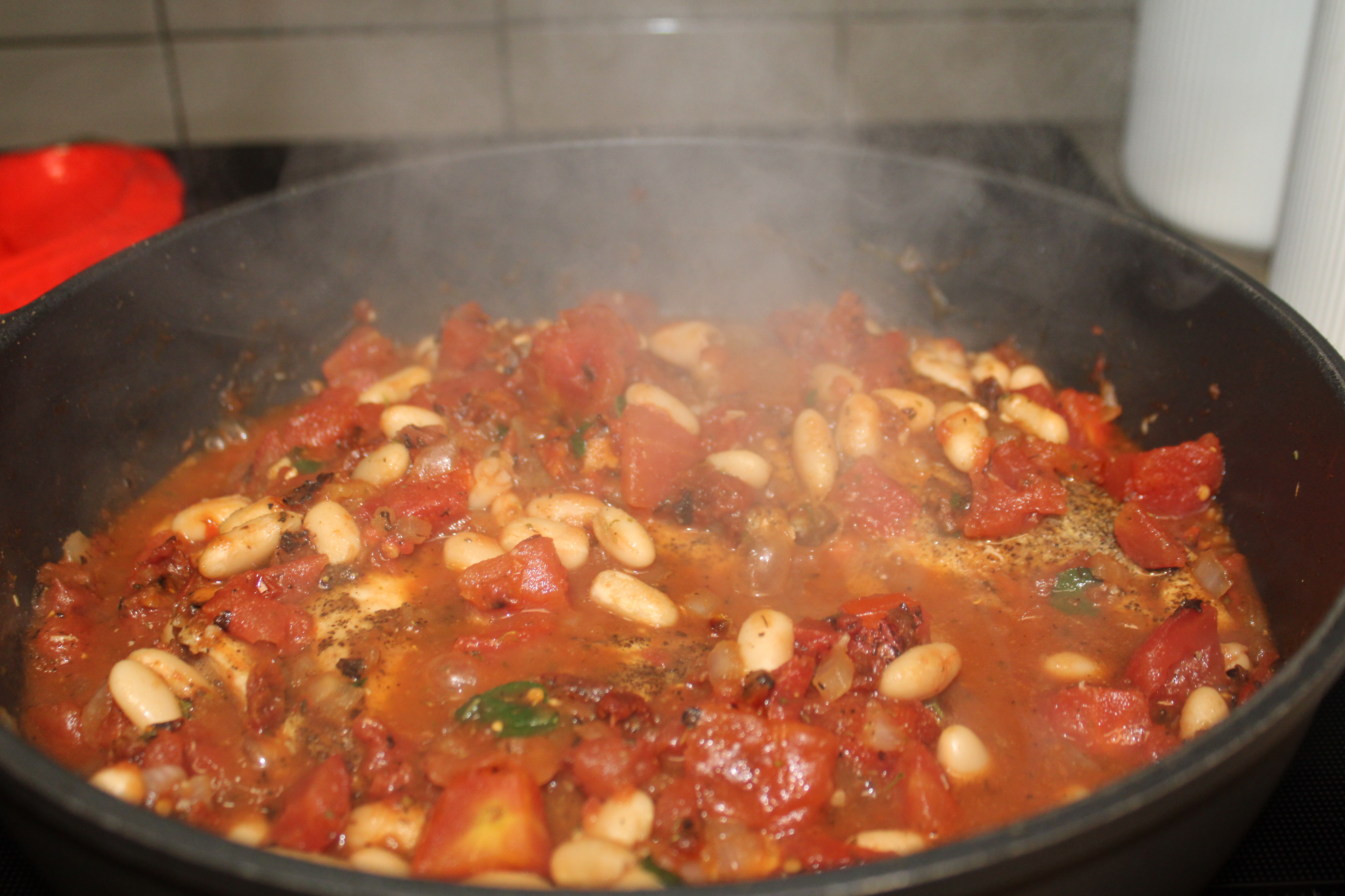 Add onions, sauté for about 3 minutes. Scatter garlic and sun-dried tomatoes over the onions. Continue to sauté for another 2 minutes. Stir in snipped oregano, dried thyme, beans, diced tomatoes and sugar. Stir to blend well.
