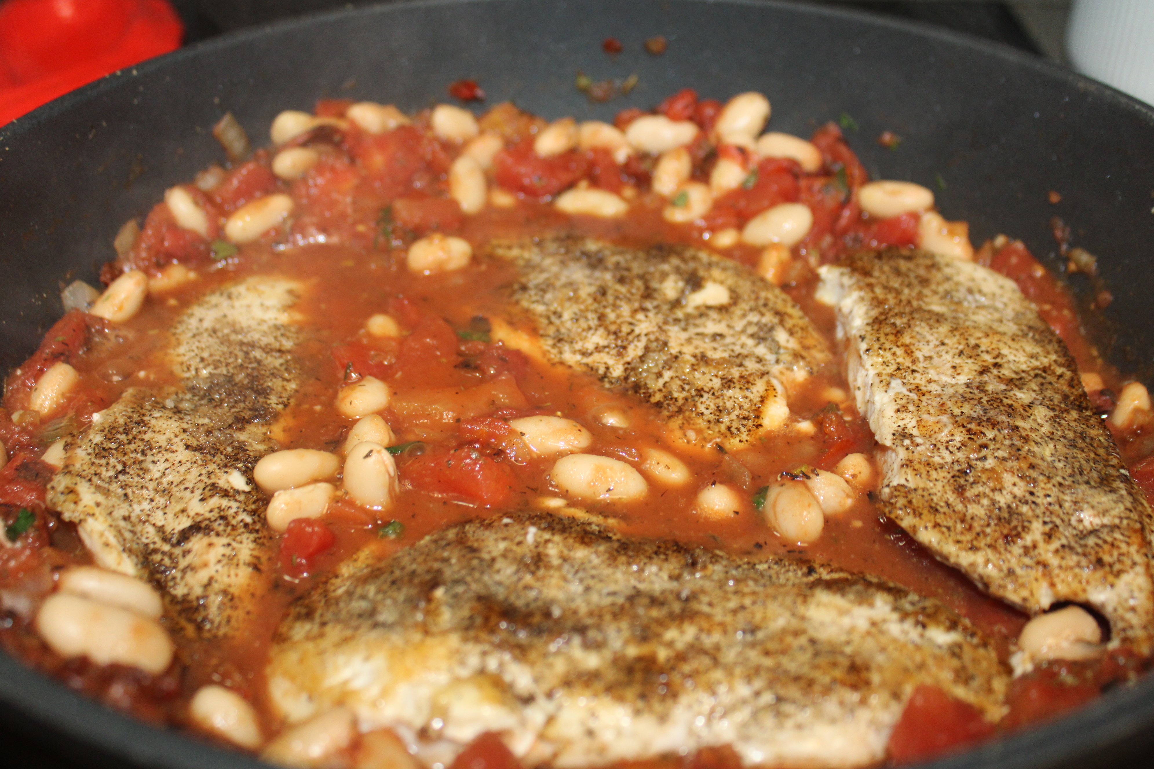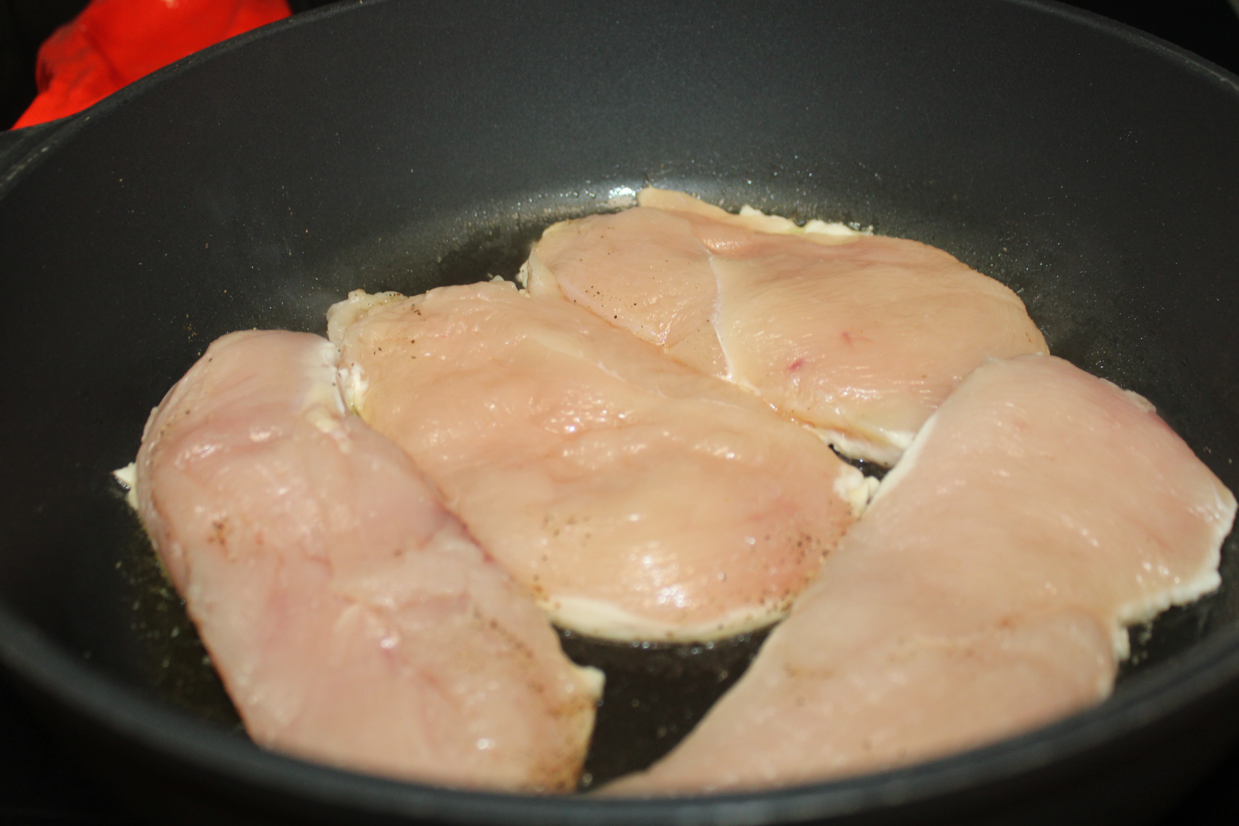 Heat 1 tablespoon olive oil in a large sauté pan or cast iron skillet over medium-high heat. Add chicken, brown for 3 minutes per side. Remove the chicken from skillet, set aside on a plate.