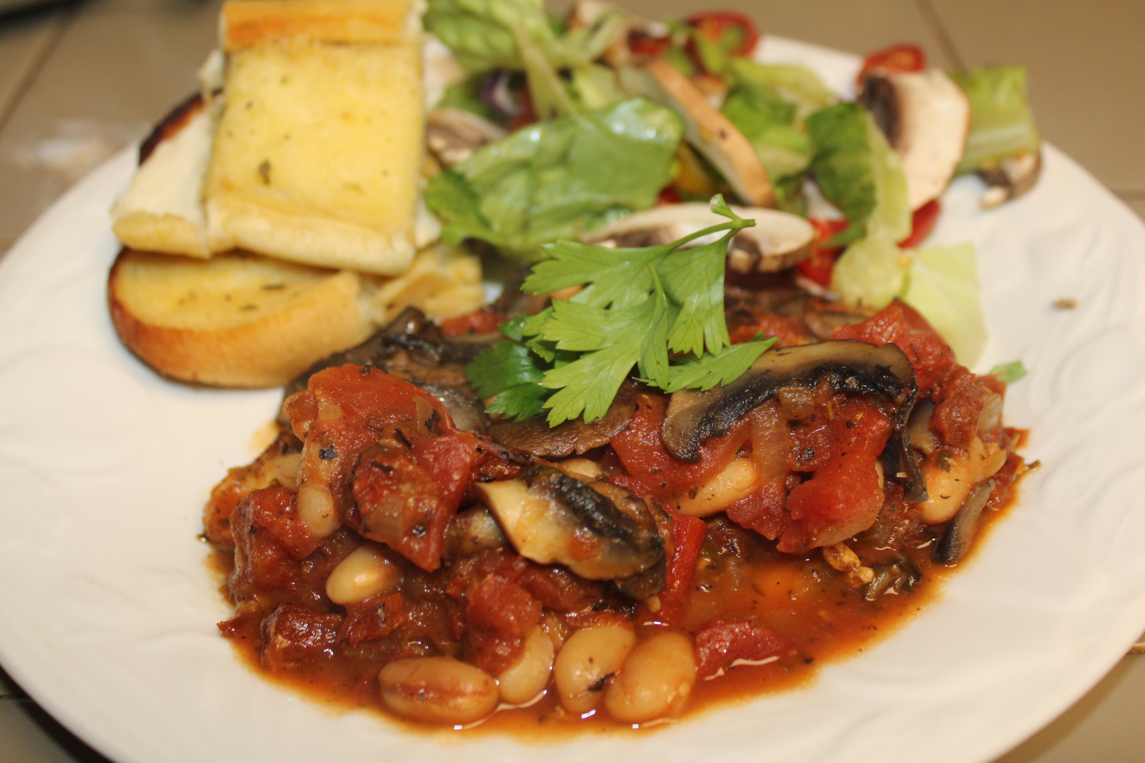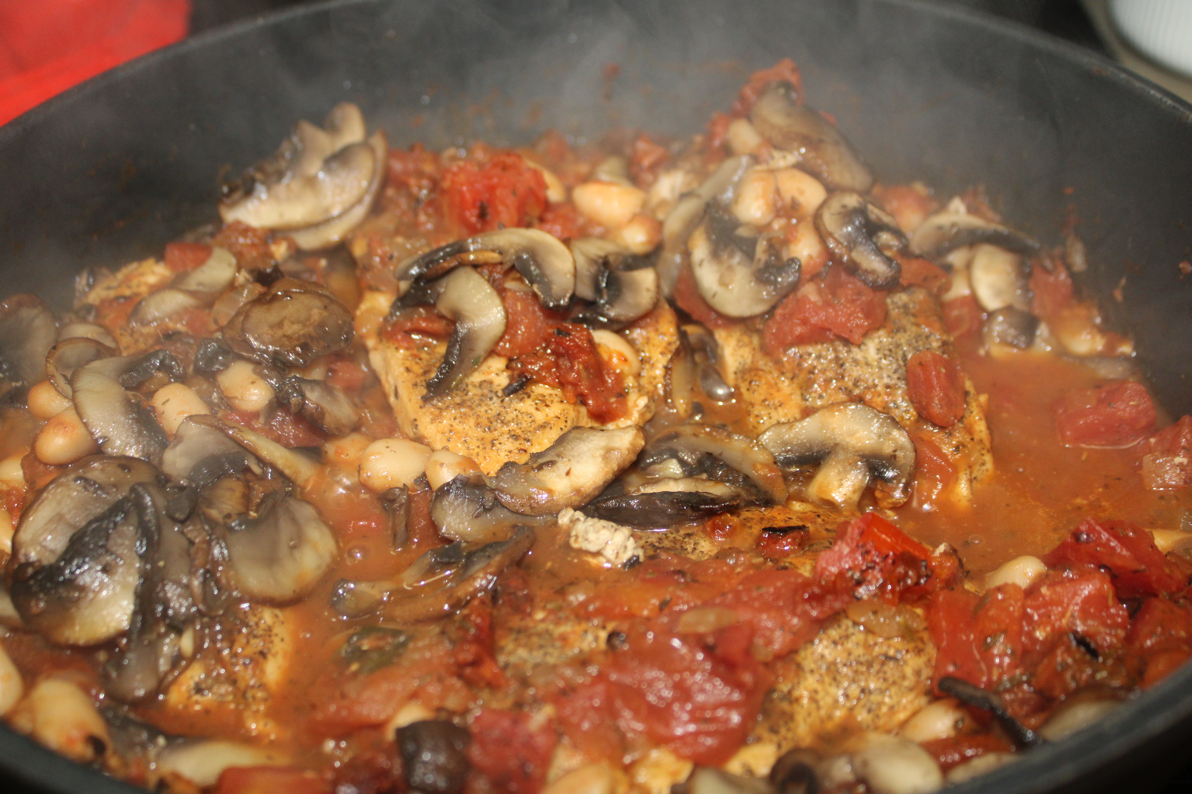 Return chicken breasts to the pan, spoon some of the sauce with vegetables over the top of the chicken. Cook, covered, over medium heat until the chicken is cooked through and the sauce is bubbling nicely, about 10 minutes. Return browned mushrooms to the pan over and around the chicken. Taste and adjust seasoning with salt and pepper as desired. Garnish with parsley just before serving.