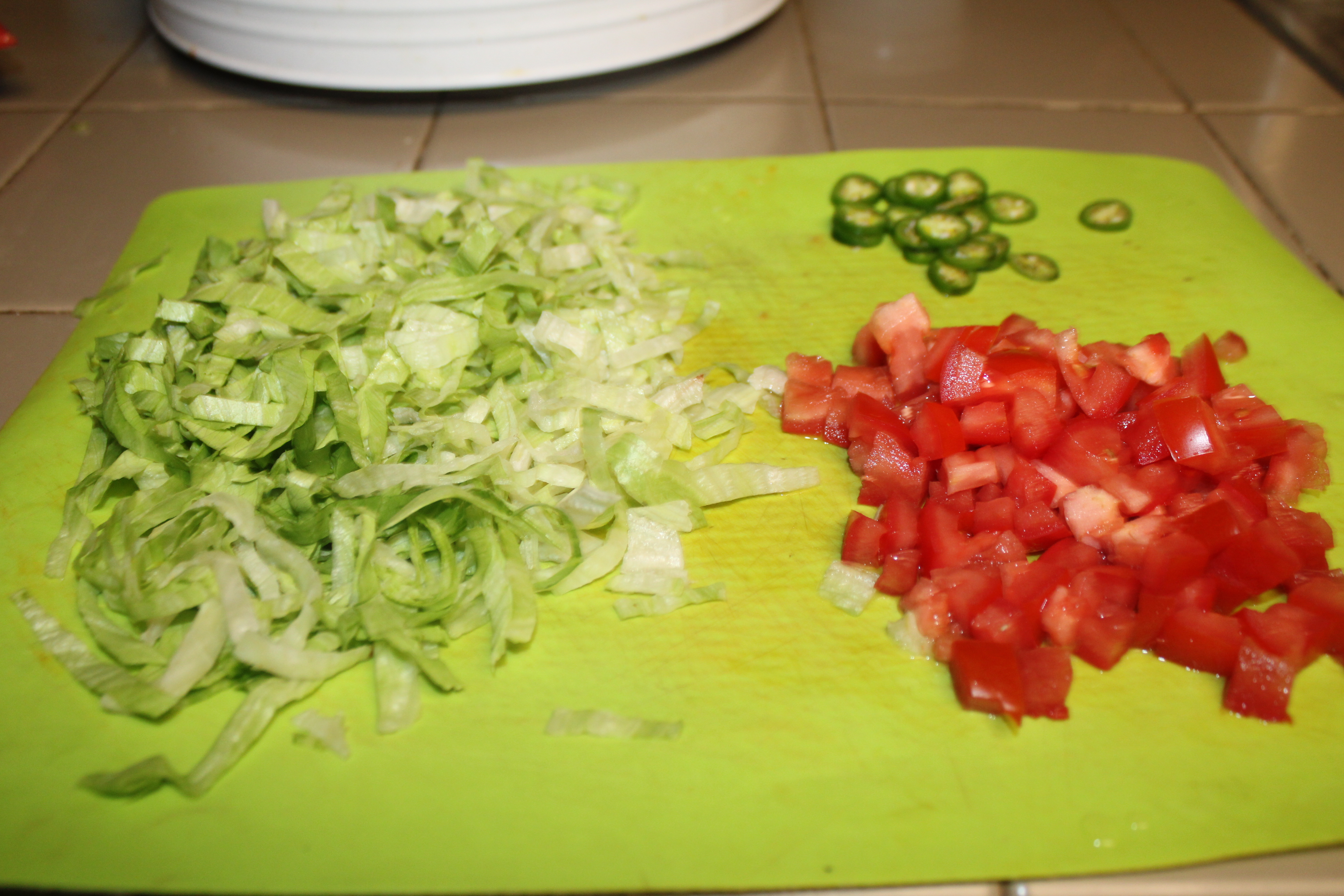 While the meats are browning, drain black beans and corn. Mix together in a bowl with the Hatch Chilies. Shred lettuce. Seed and dice tomatoes. Slice Jalapeño Pepper, set aside.