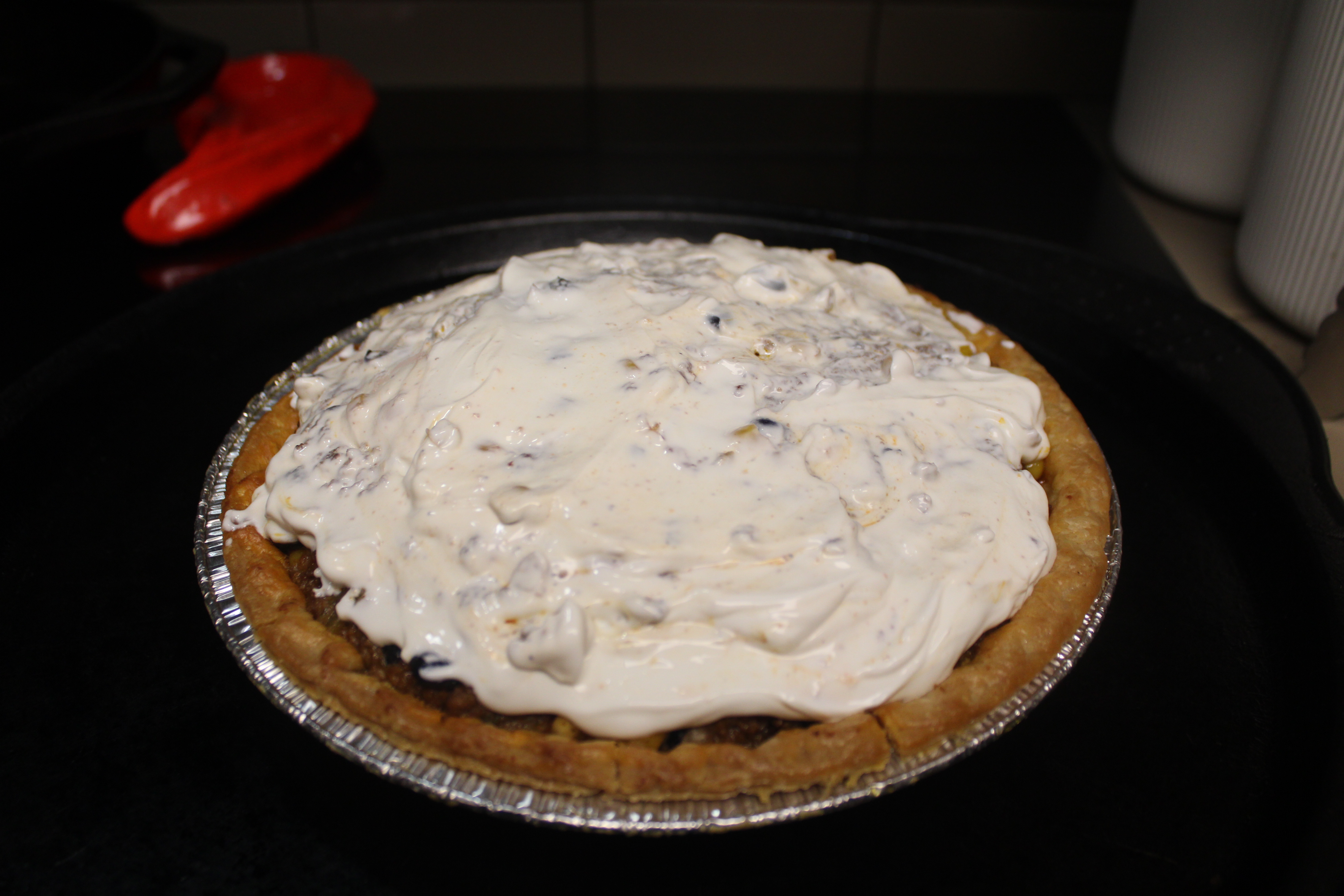 Remove Taco Pie from the oven. Let rest on the counter for a few minutes, the spread sour cream over the top. Scatter lettuce, tomatoes and Jalapeños. Let pie rest for a few minutes longer for the juices to settle.