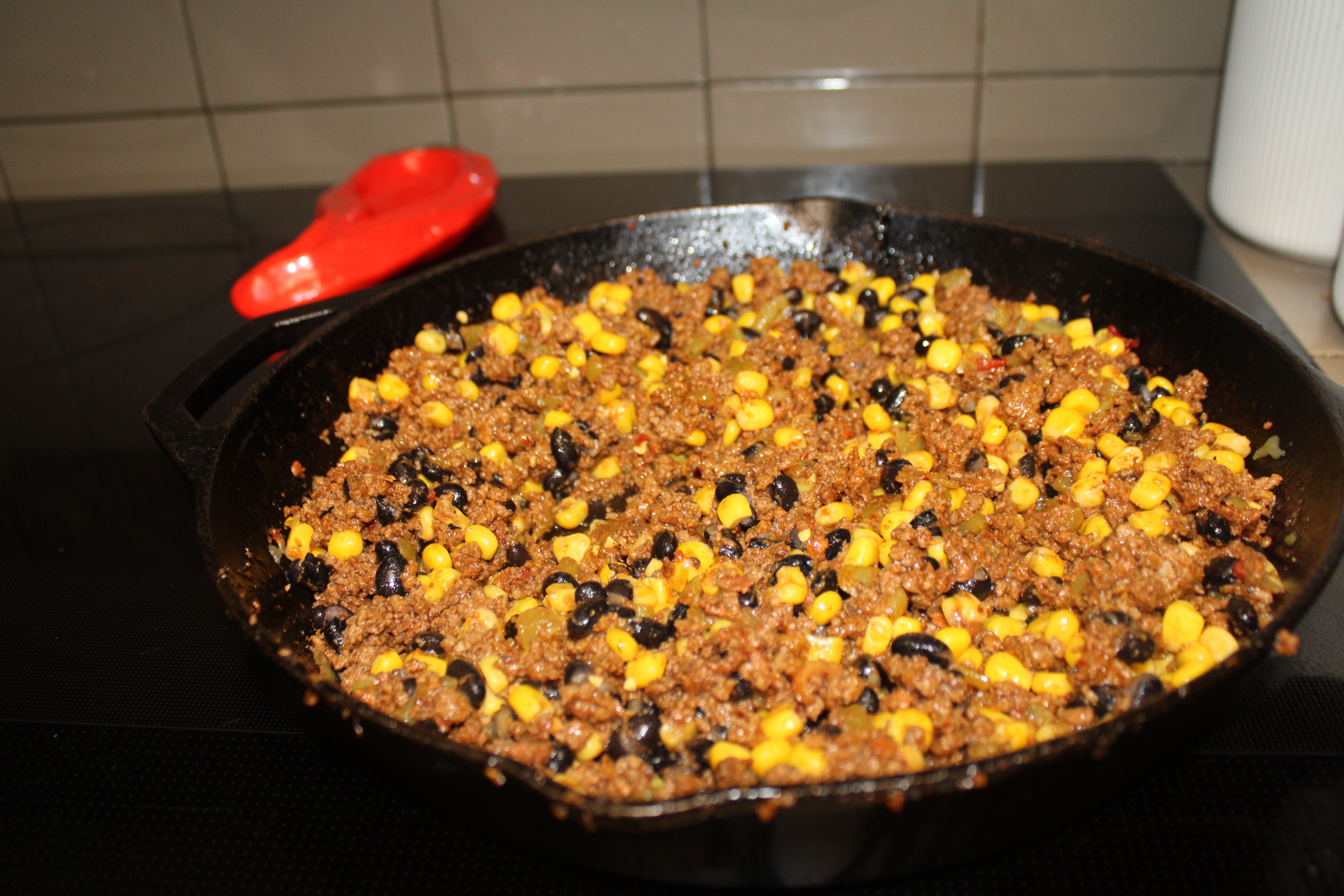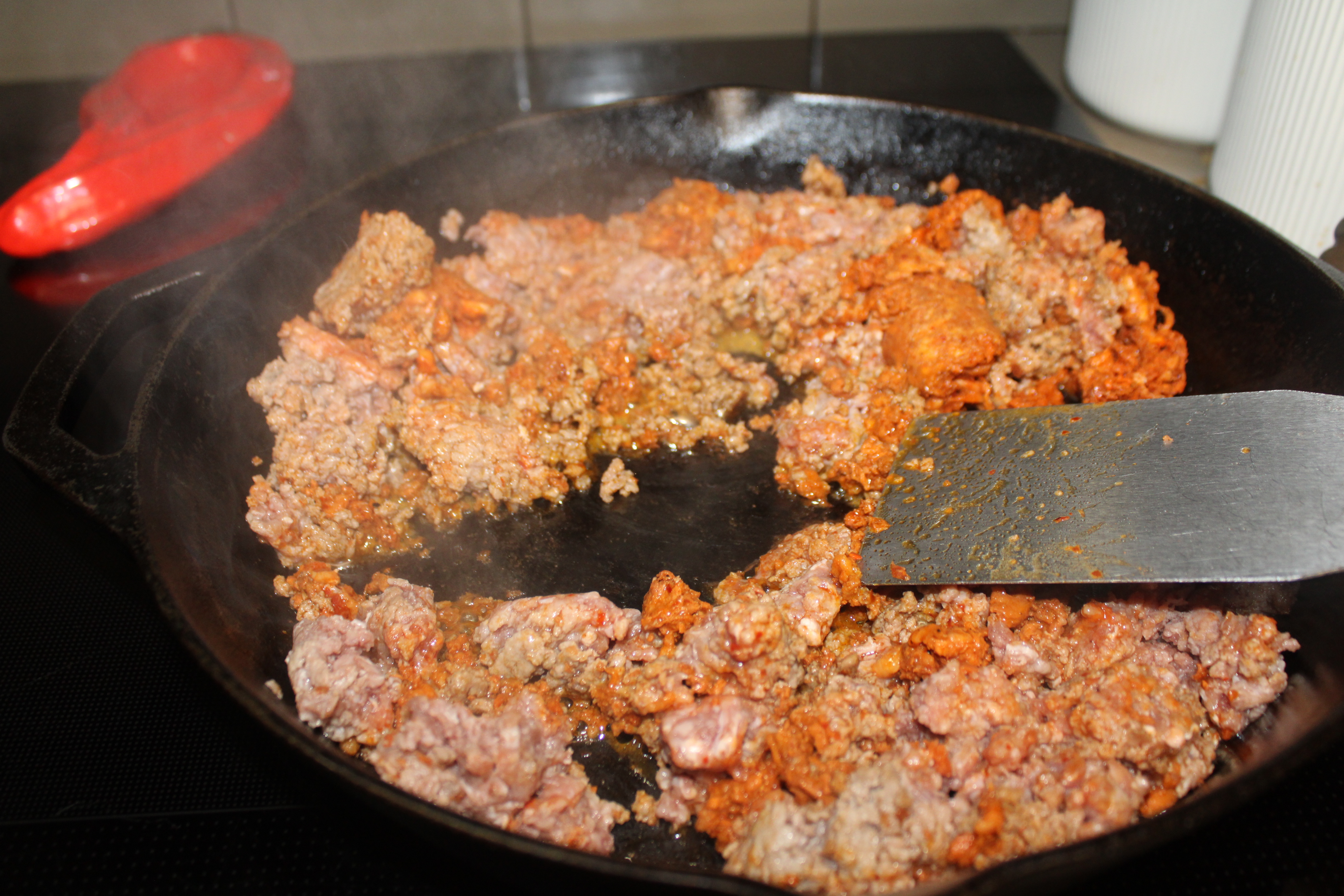 In a cast iron skillet over medium heat brown ground beef with chorizo. Break meats into smaller pieces as they brown to form crumbles of meat. Drain well.