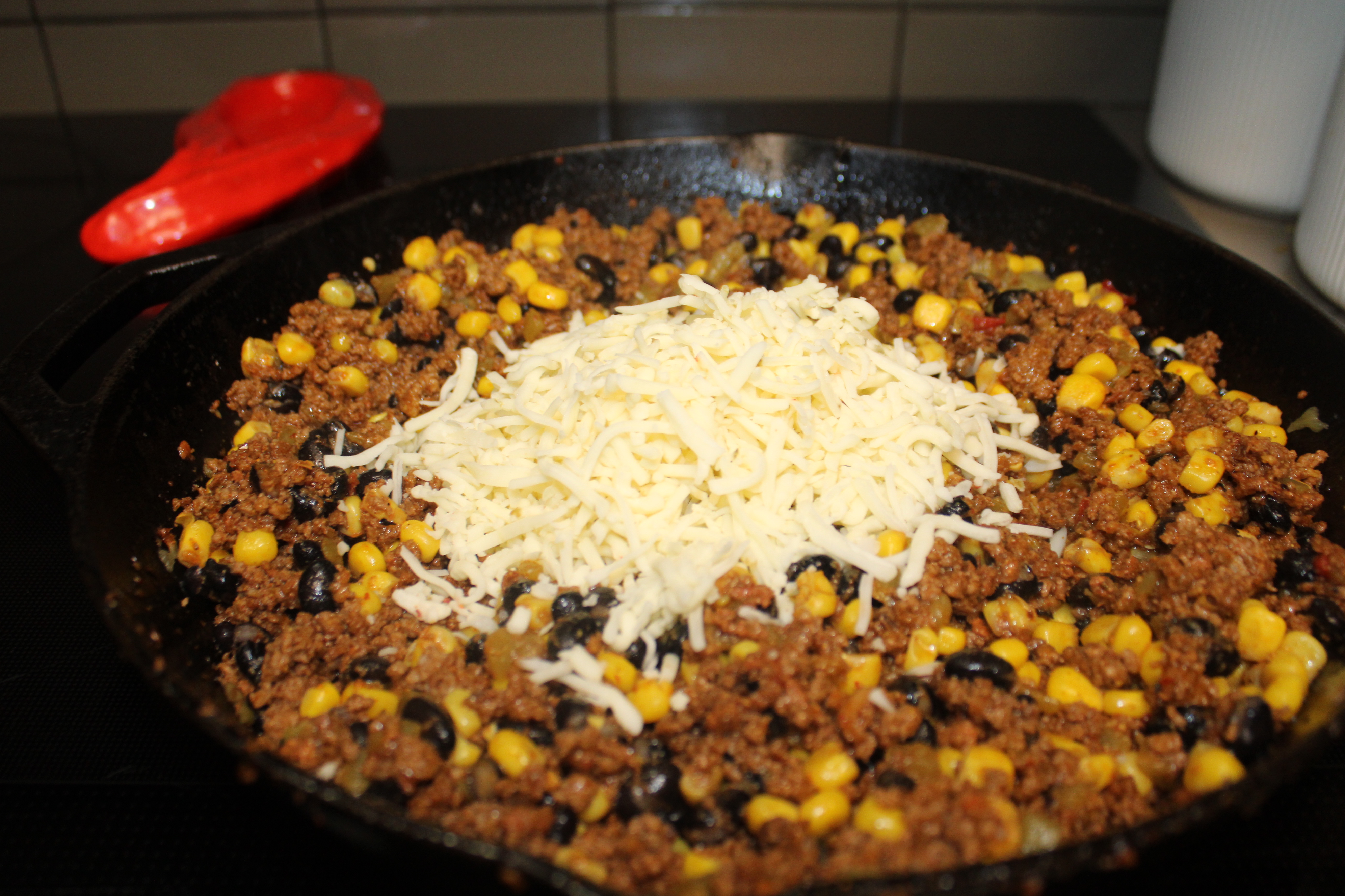 Once the meats are drained, return to skillet and season with taco seasoning. Add the black bean misture. Stir to blend and warm through. Off heat add Pepper Jack Cheese, stir as the cheese melts.