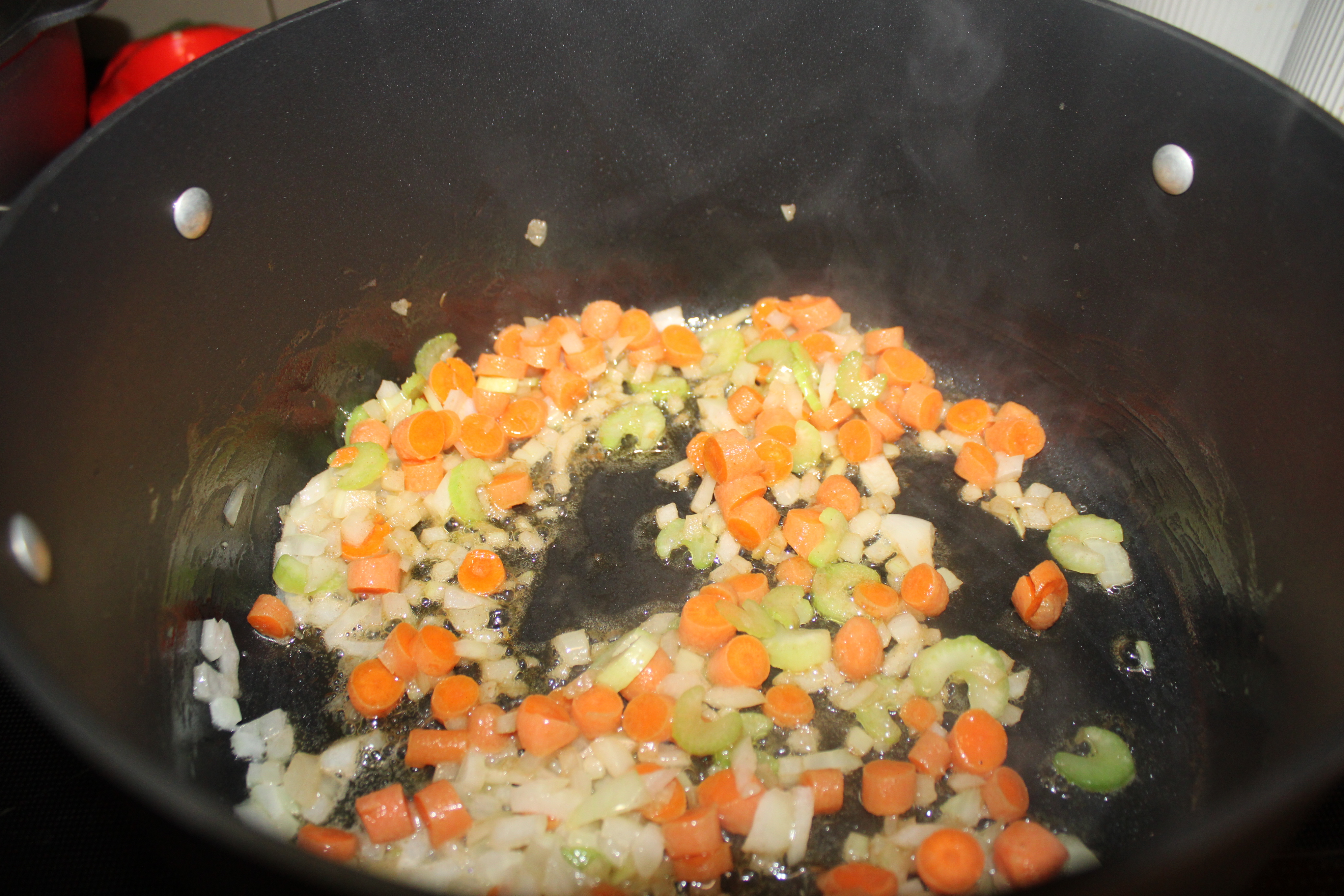 Heat the olive oil and butter in a large pot over medium heat. When the oil is hot and the butter has melted, add the onions, carrots and celery. Cook the vegetables gently for 5 minutes, stirring frequently.