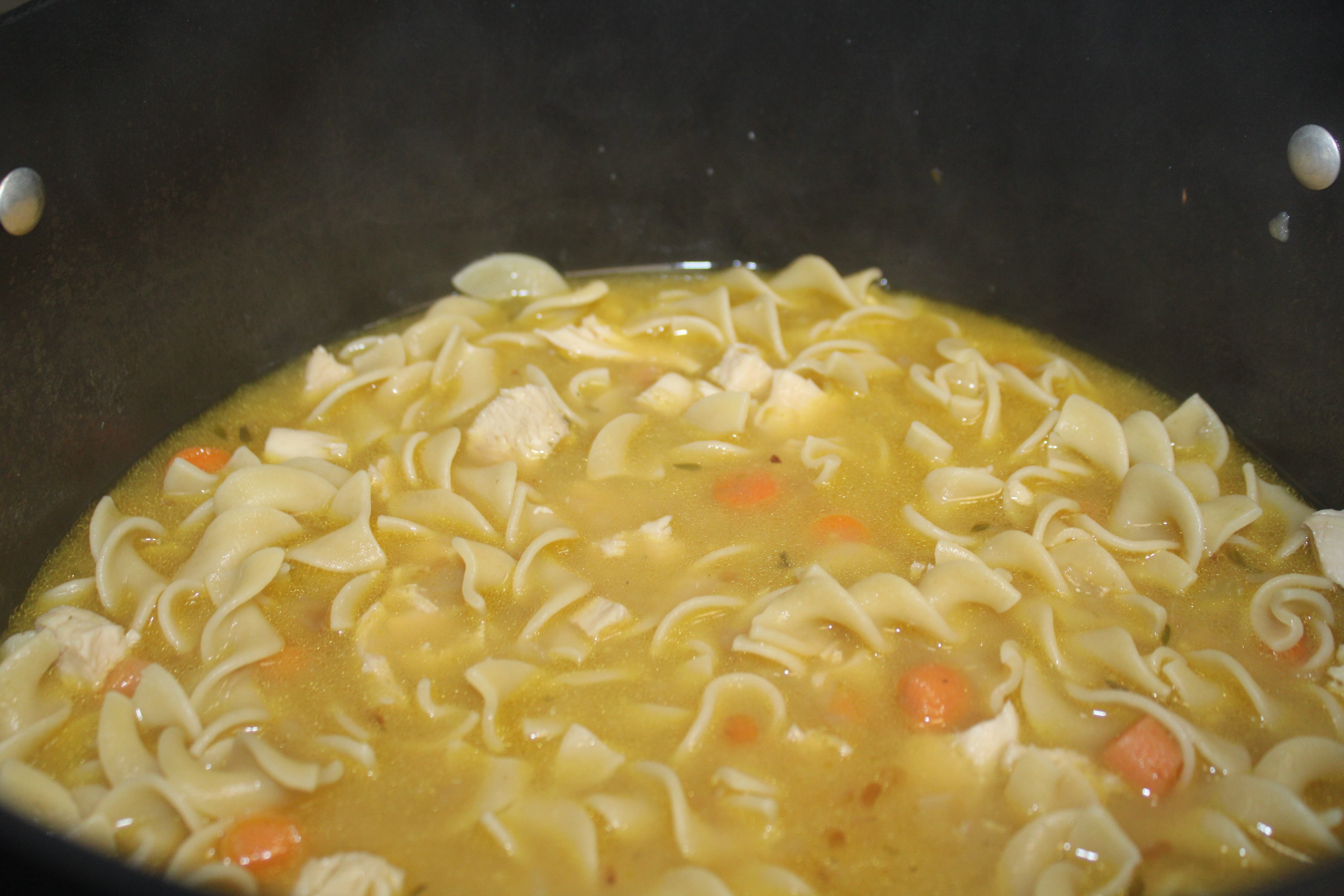 With tongs remove the thyme stems from the soup pot. Remove soup from heat, add egg noodles. Cover and let steep for a few minutes. Taste and adjust with a pinch of salt if needed.