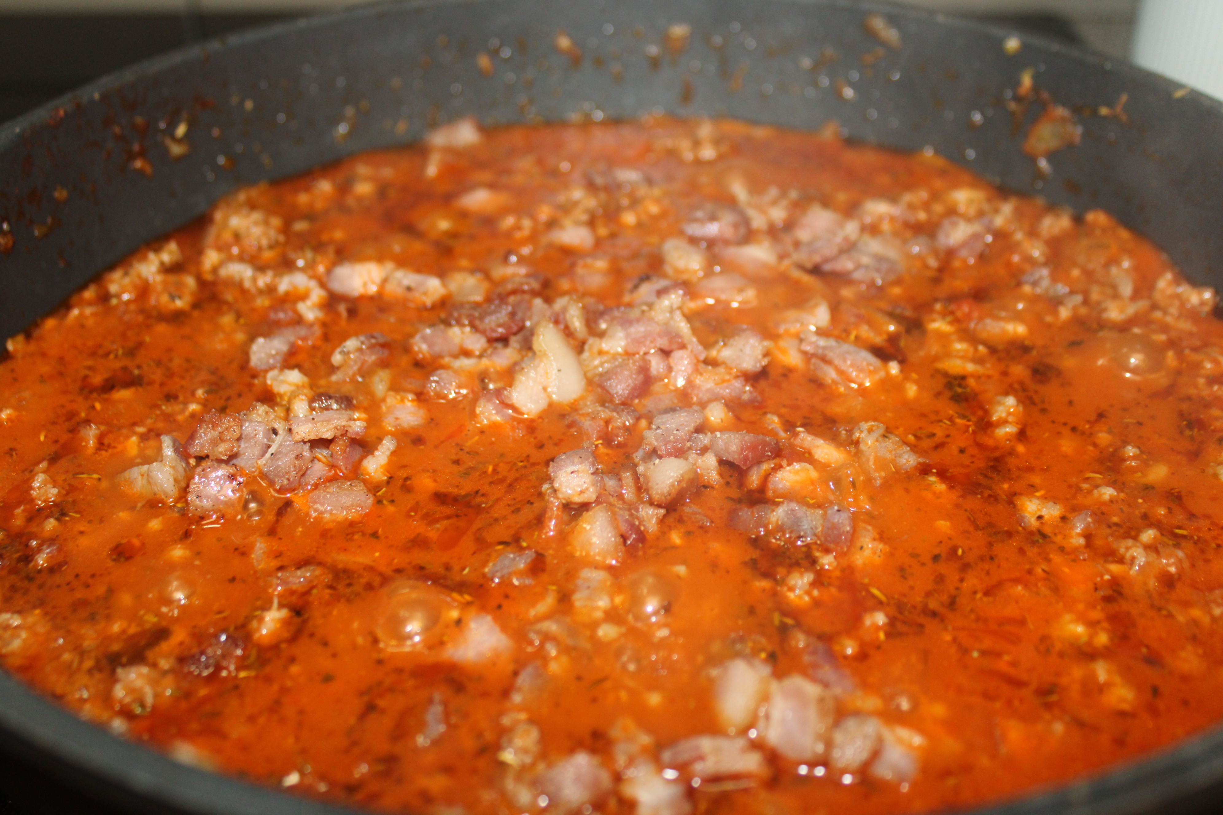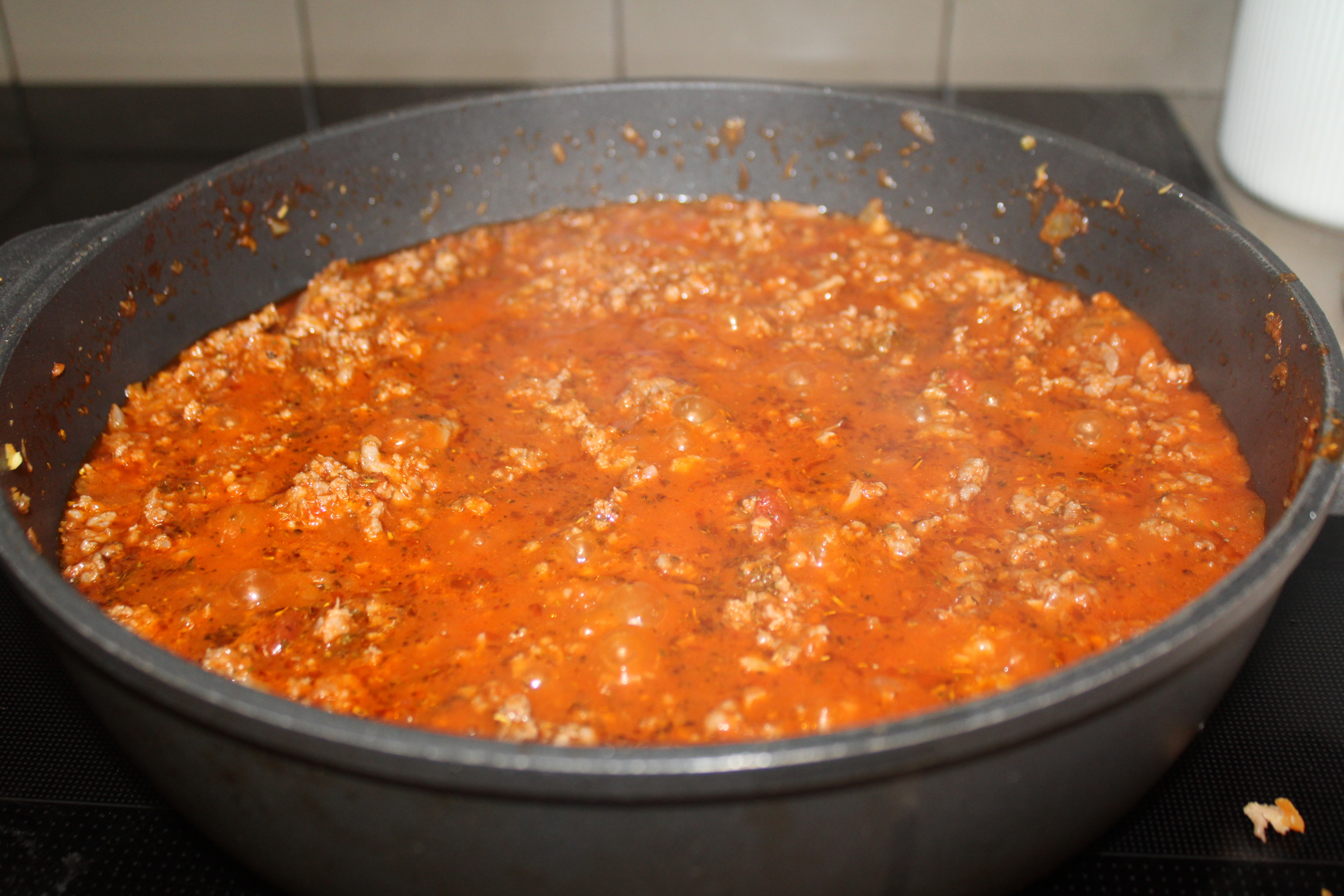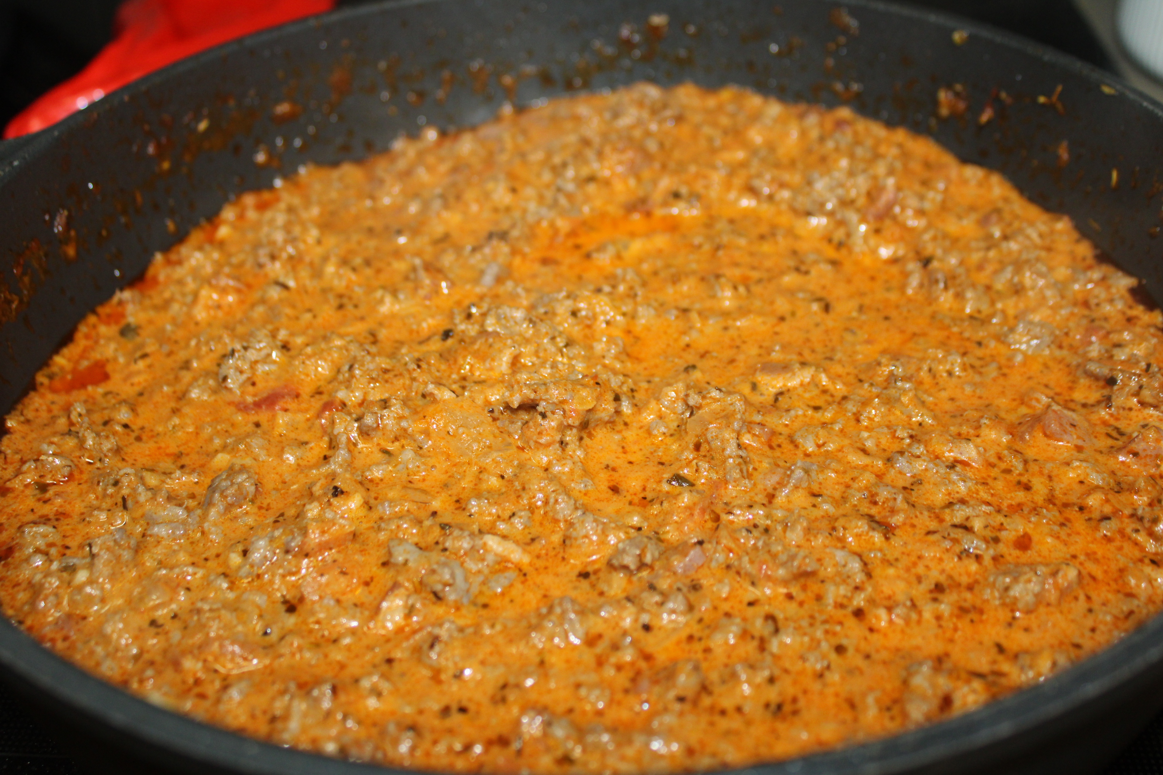 When starting the pasta, add enough heavy cream to the Bolognese Sauce to change the color to a pale reddish-pink color. Taste and adjust as needed. Sauce should be rich in flavors. Continue to simmer until hot. Serve over pasta, toss to mix.