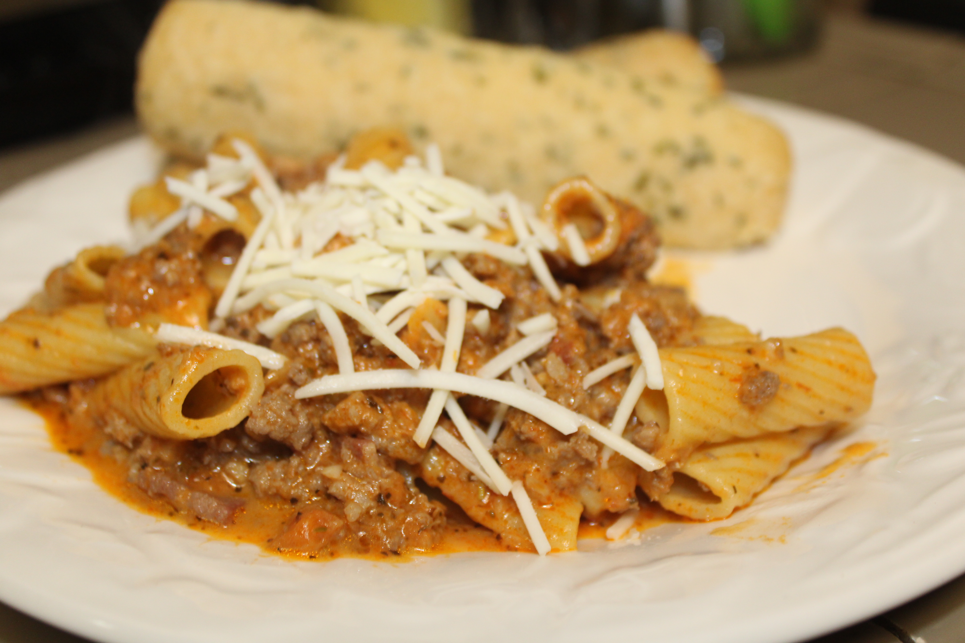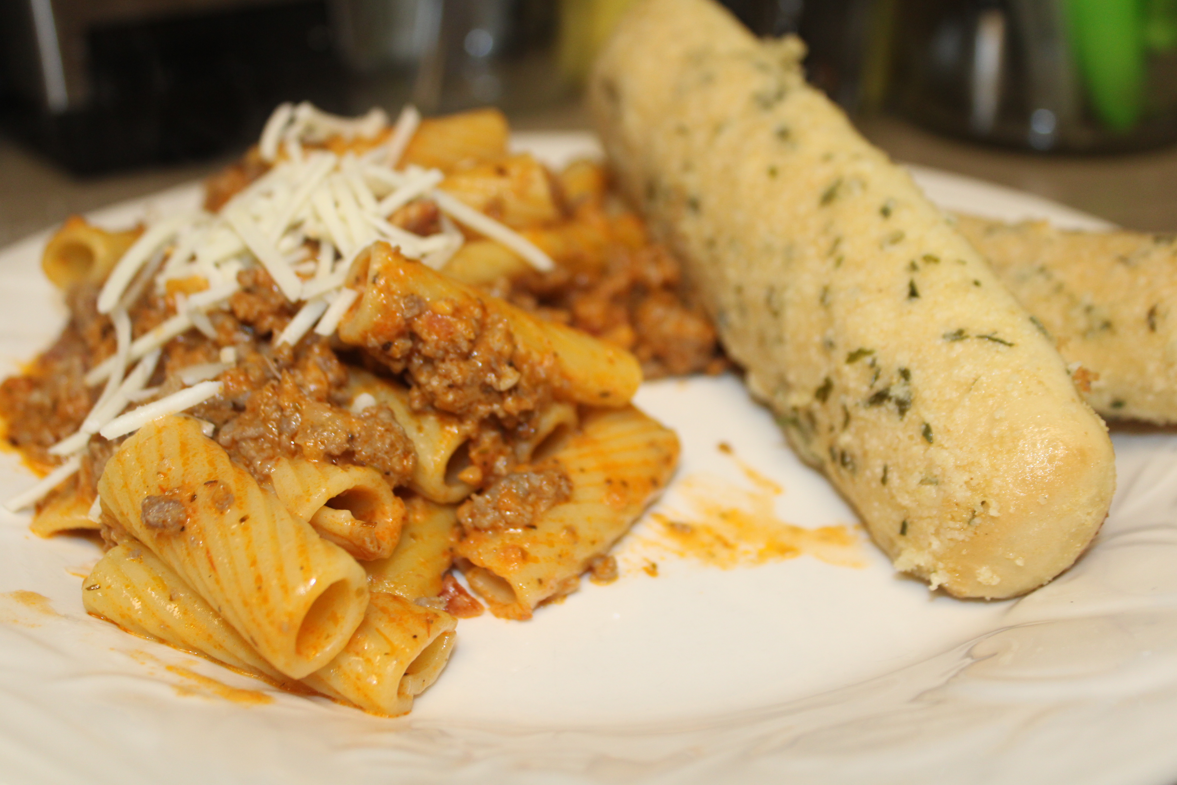 For a true “Olive Garden” experience, serve Rigatoni Bolognese with copy-cat Parmesan Bread Sticks and Garden Salad.