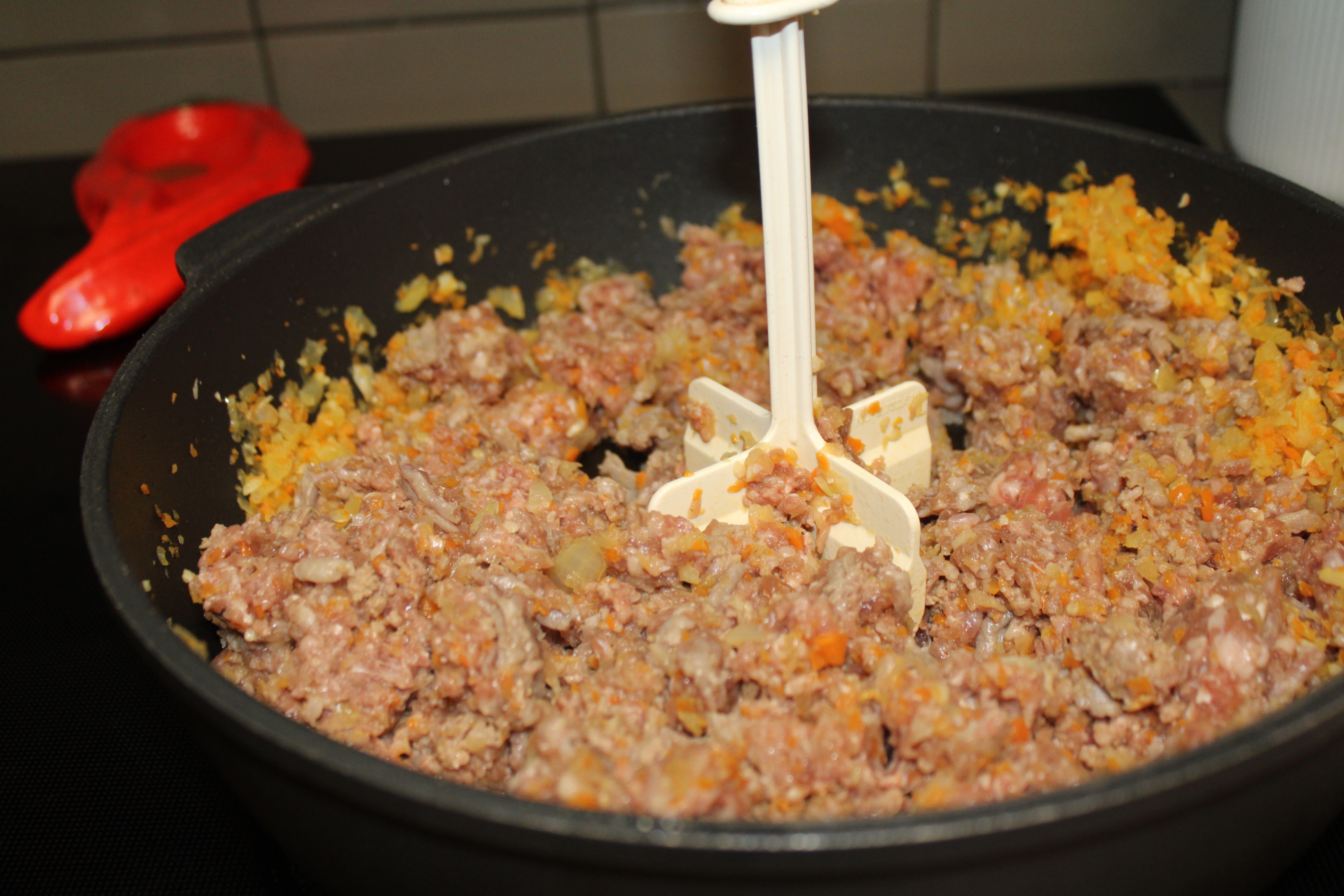 Over medium heat, sauté the onion, carrots and garlic in the bacon drippings. Cook about 3 minutes or until vegetables are tender. Add both the ground bee and ground pork to the skillet. Cook for about 15 minutes, breaking meat into smaller pieces as it browns. Drain off excess fat.