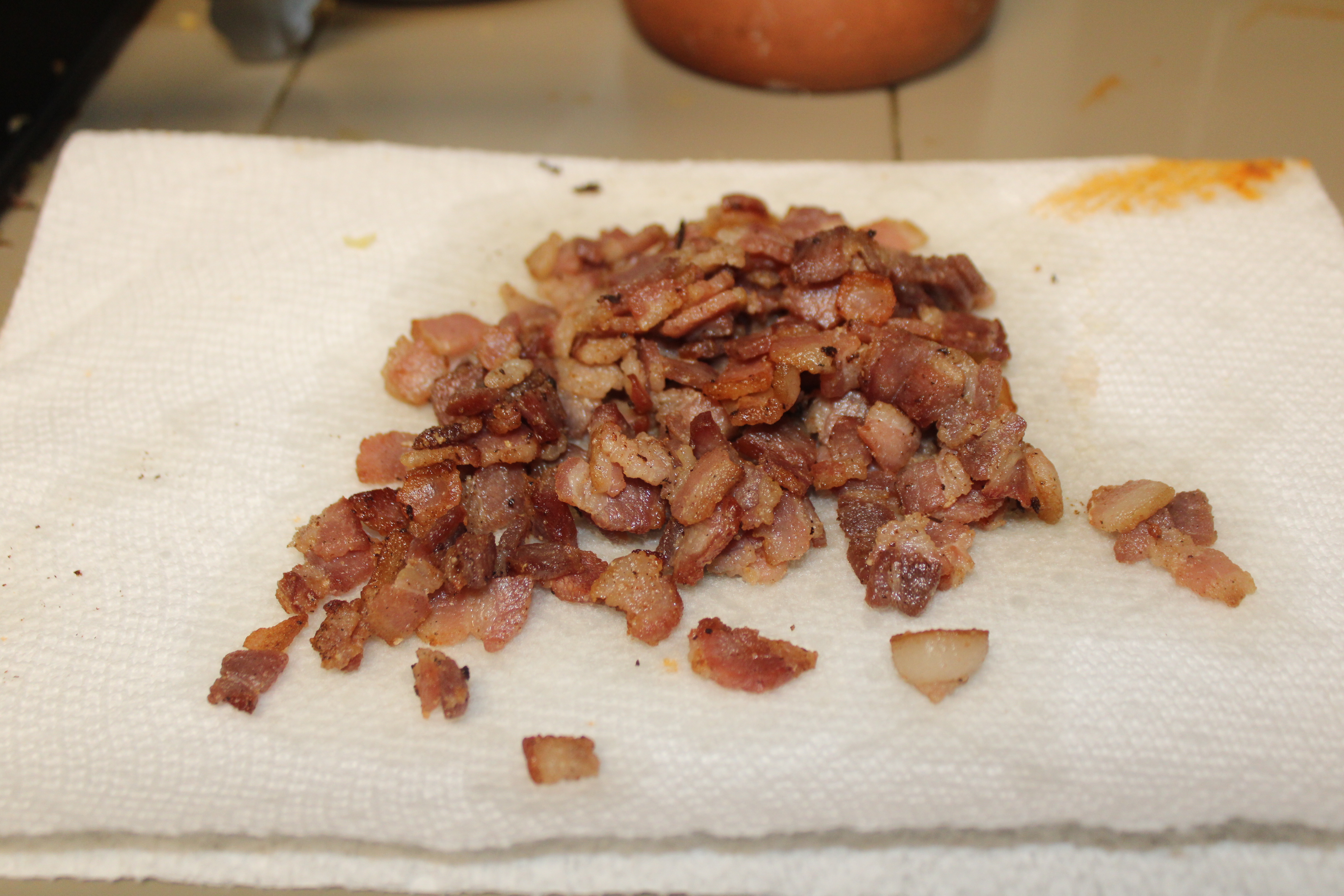 Stack bacon, cut lengthwise, then dice. Fry the bacon in a large skillet until nicely crisp. With a slotted spoon move bacon to paper towels to drain. Remove all but about a tablespoon of bacon drippings from the skillet.