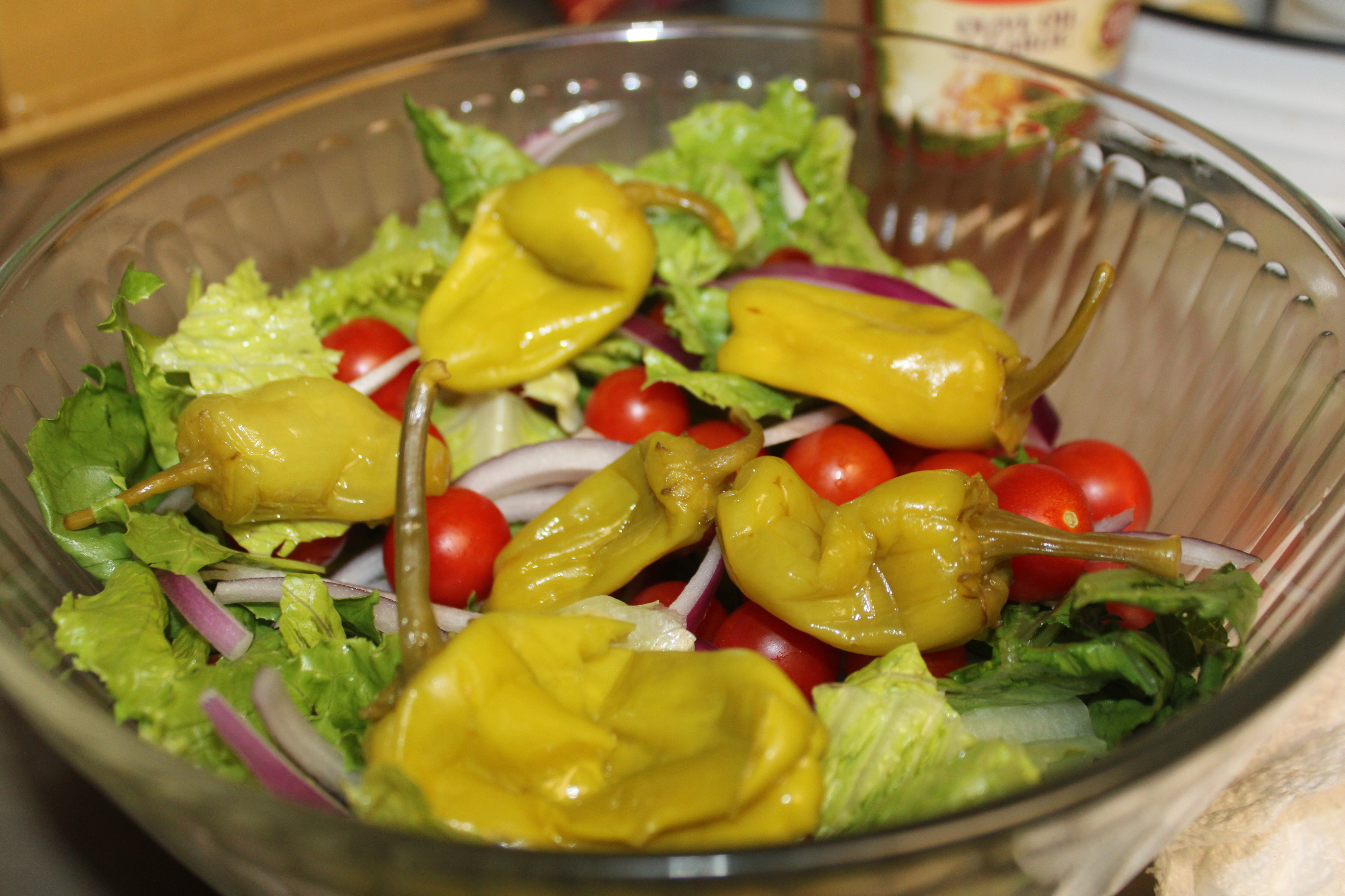 Tear lettuce, scatter into a large bowl. Cut onion in half, reserving half for another purpose. Peel and thinly slice remaining half. Drain Pepperocini Peppers on paper towels.