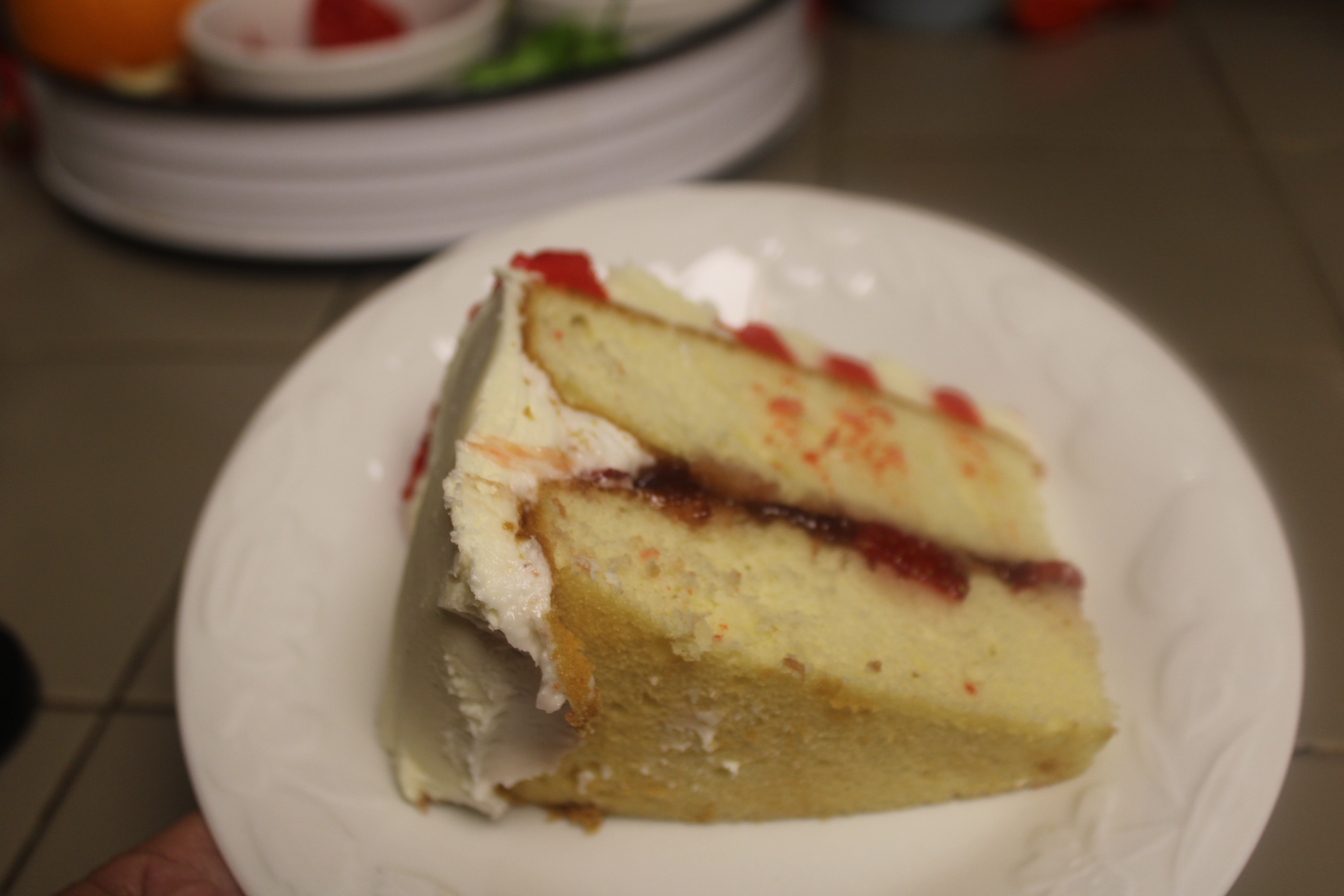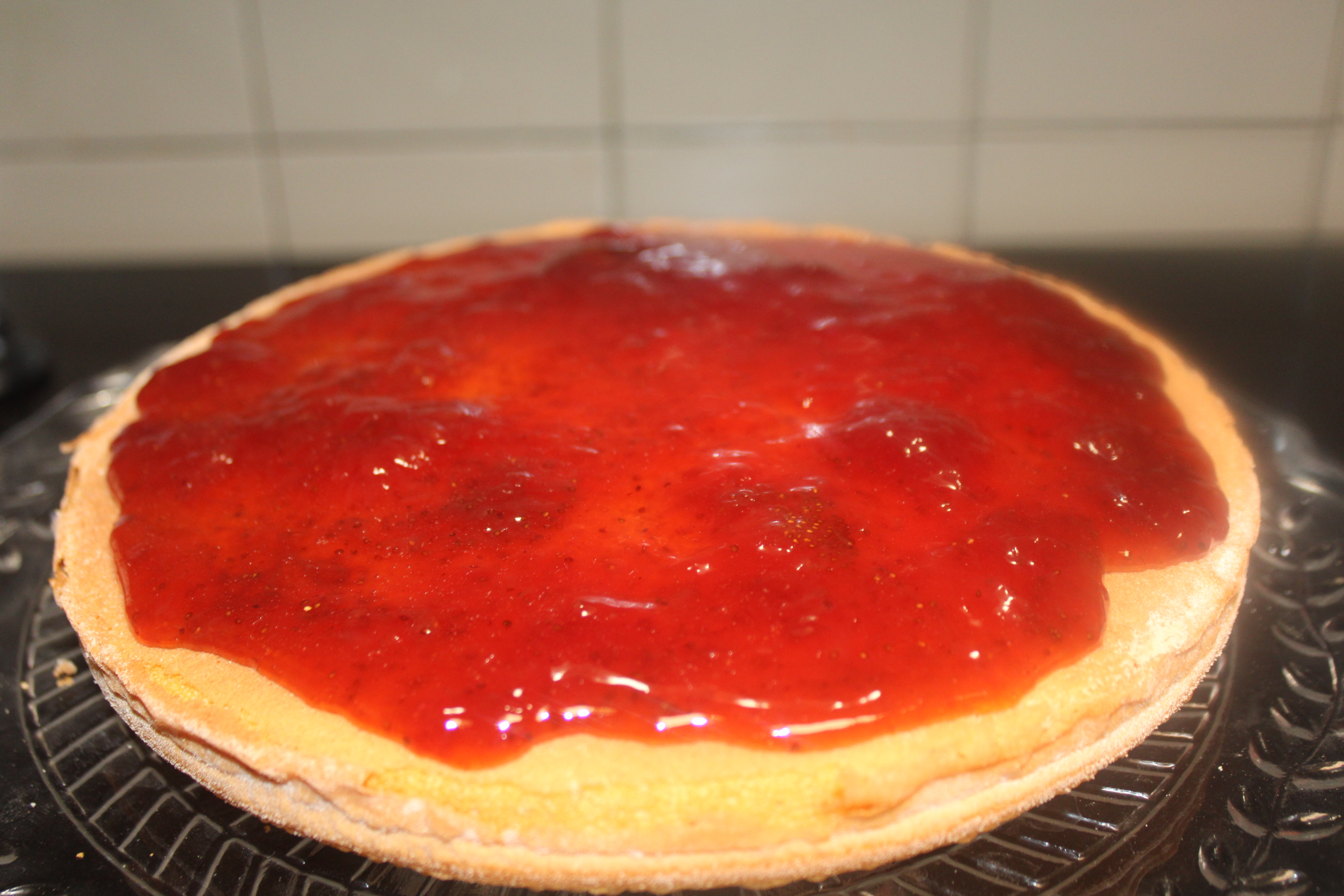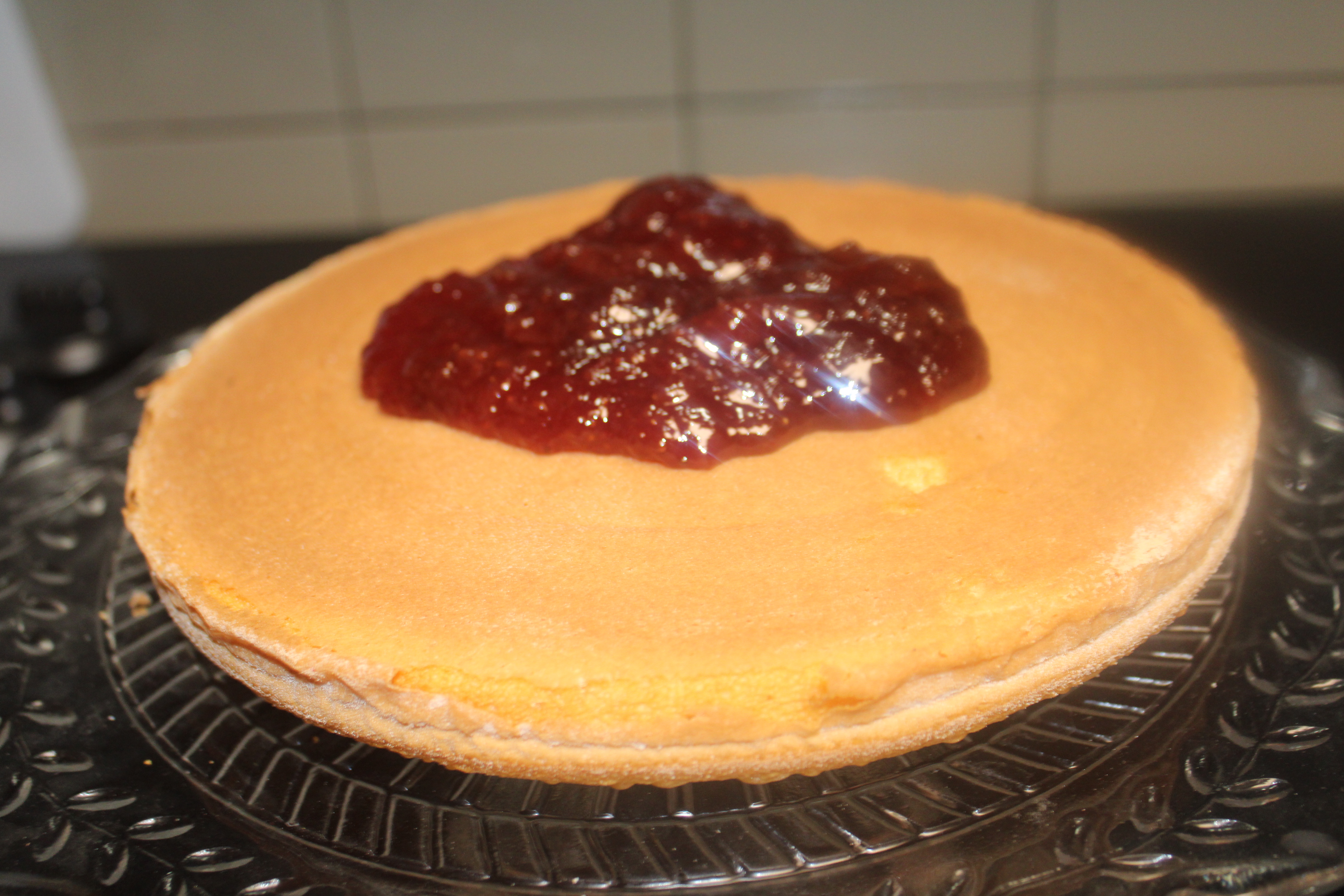 On a cake plate place the bottom layer of cake, cut side down. Spread jam over the top of the cake almost to the edge. Lay strawberries over the jam.
