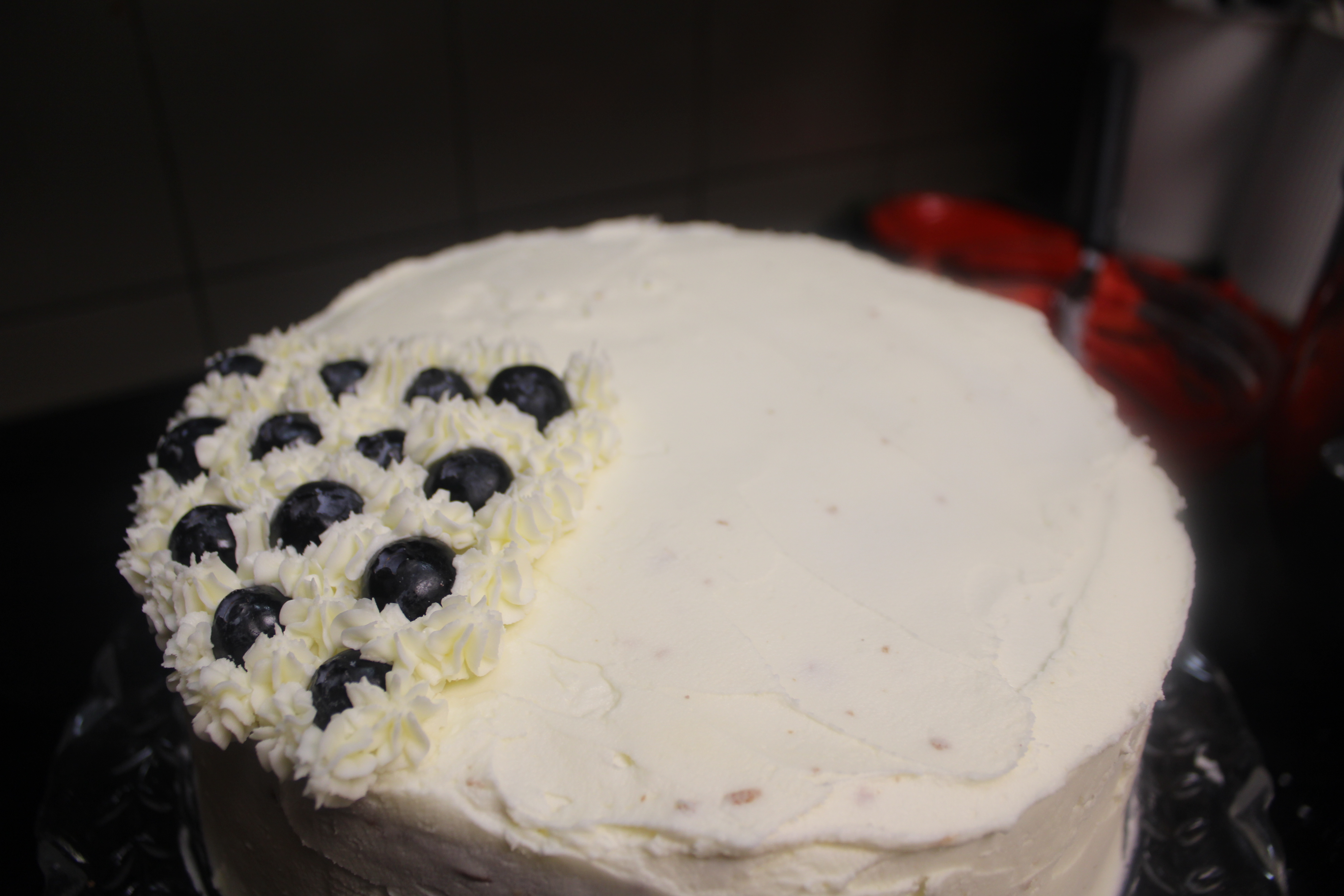 Place the top layer of cake over the bottom, cut side down. Spread white buttercream frosting all around the sides of the cake. Place remaining white frosting in a pastry bag fitted with a small star tip.