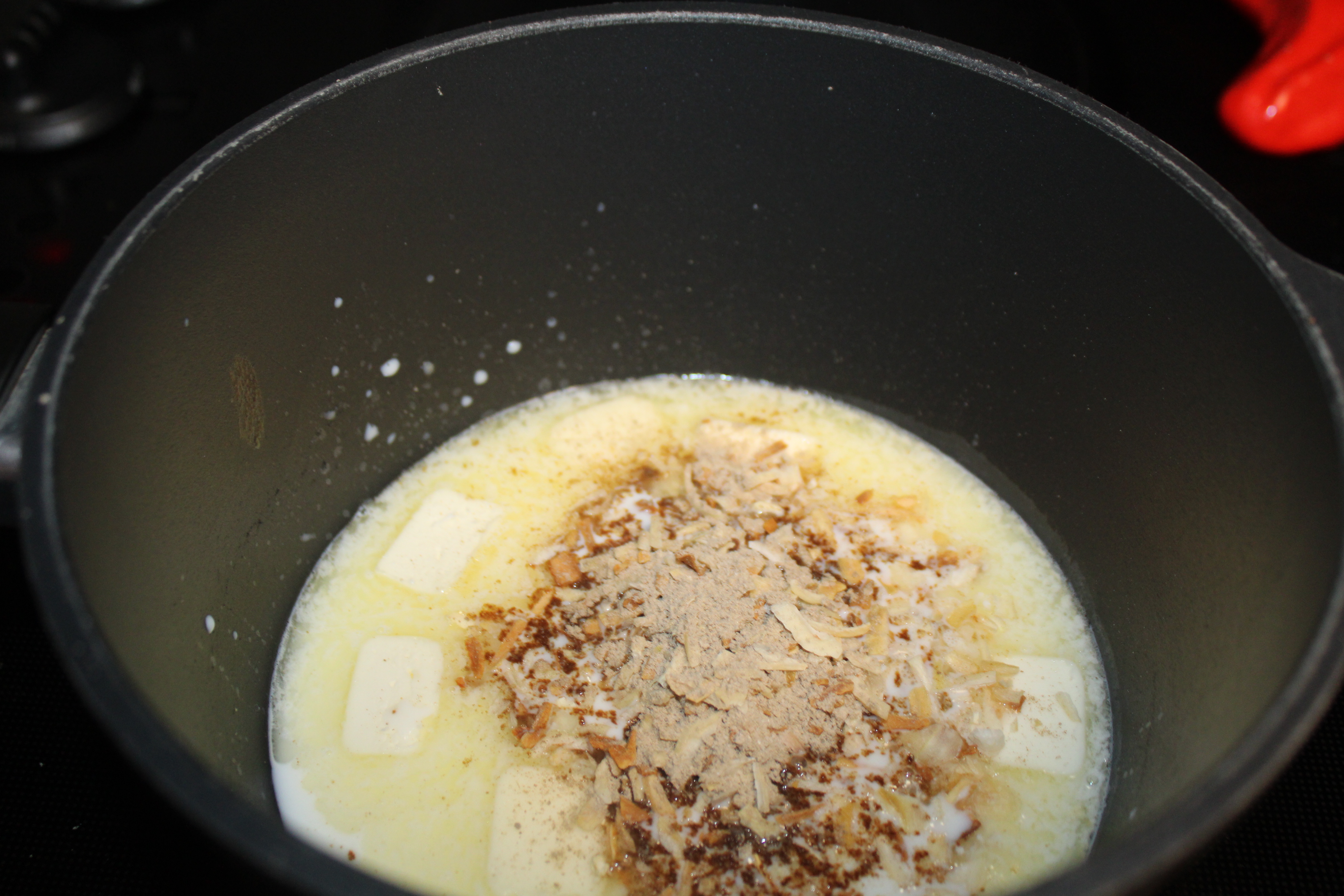 While the potatoes are boiling, heat milk to the boiling point in a small saucepan. Whisk onion soup mix and butter into the hot milk until blended and the butter has melted. Set aside.