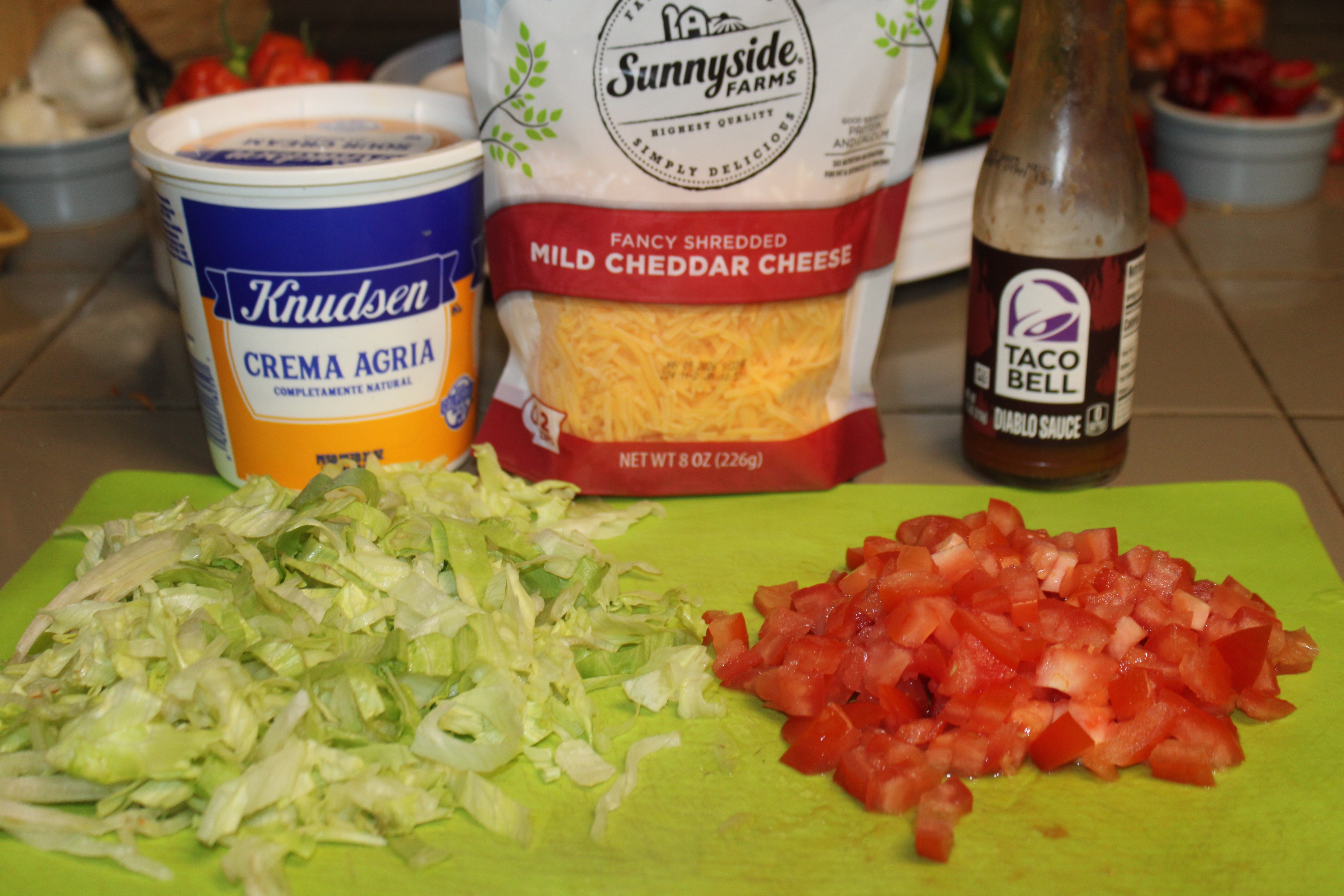 While shopping in the grocery store for all the ingredients we bought the Stand and Fill taco shells first. I placed them in the top portion of our shopping basket. Hubby (bless his heart) put them in the lower part. I explained that I wanted the shells is easy reach for when we reached the end of the aisle, where the floured tortillas were. Why? He asked. To get the right size. Are you opening the box? No. But I want to compare the box to the tortillas. We did – with a disagreement as to which way the hard shells might be in the box. We went with his way (which was wrong), and I picked out my favorite brand of flour tortillas (my mistake). When using just the tortillas, I don’t care much for the Mission brand – they are thick, and I like a thinner tortilla – more filling, less wrap. However; for the Crunch Wrap Supreme, a thicker tortilla was definitely in order. The thinner ones started to separate into even thinner layers, if that were even possible.