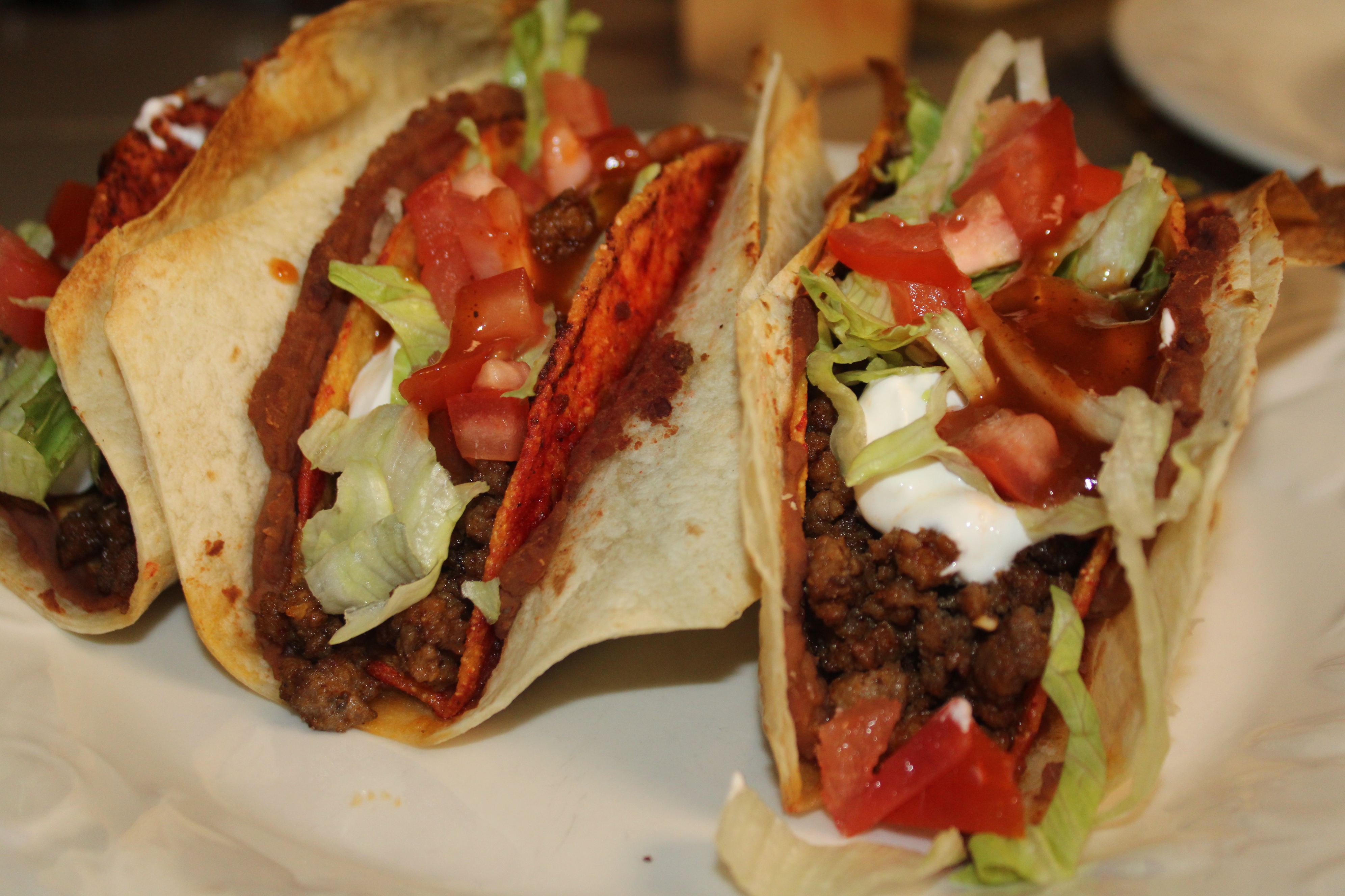 Place flour tortillas on a rimmed baking sheet. Divide refried beans among the tortillas. Place a corn shell in the center of each tortilla, gently press to adhere, lifting the sides of the tortilla up so the taco is standing upright. Spoon a few tablespoons of meat filling into each shell. Place in the oven to warm through.