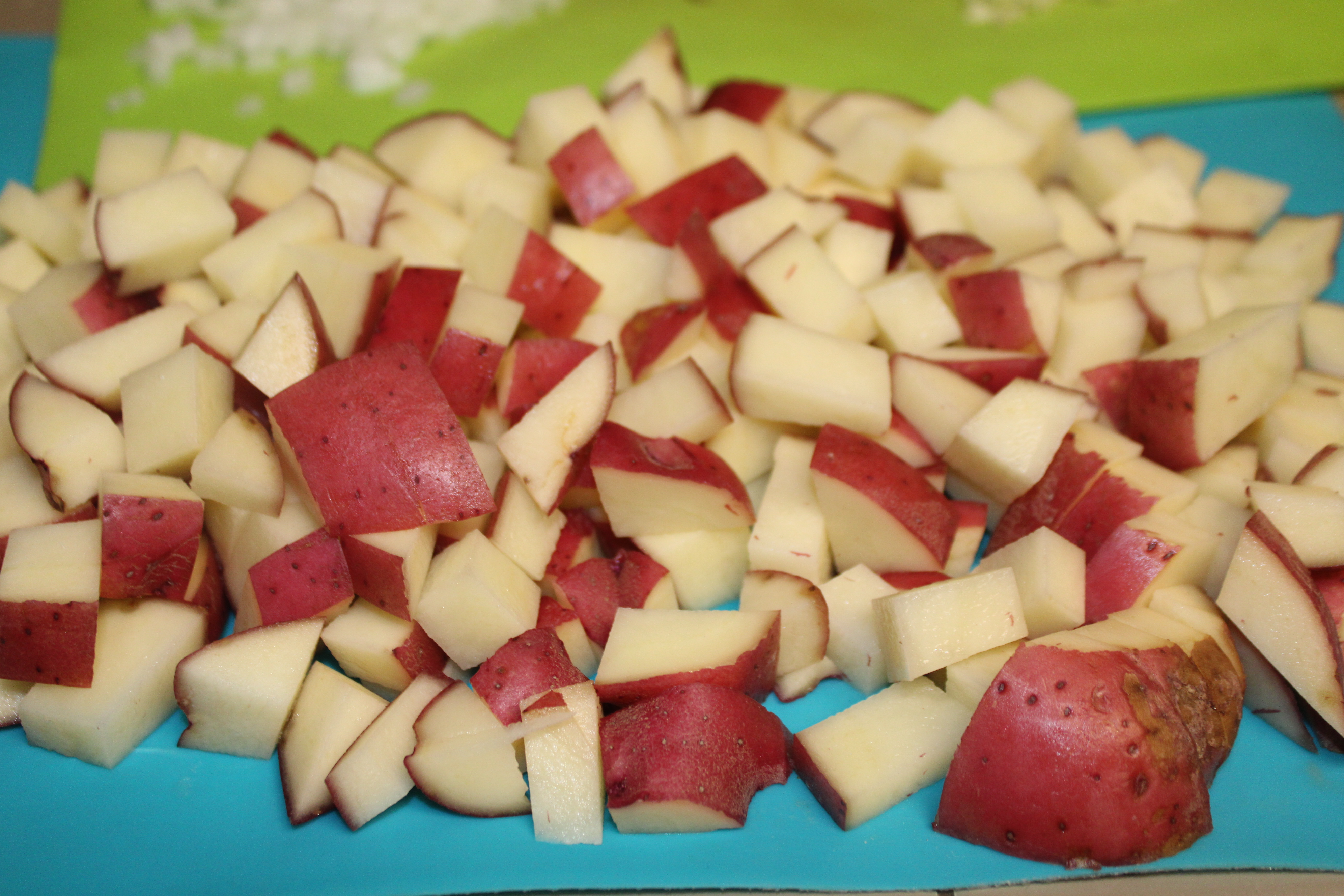 Stack bacon, dice into pieces. Cut onion in half from root to tip, reserve half for another purpose. Peel and dice remaining half. Peel and mince garlic. Scrub potato skins, dice potatoes into bite-size pieces. Slice carrots into small rounds and set aside.