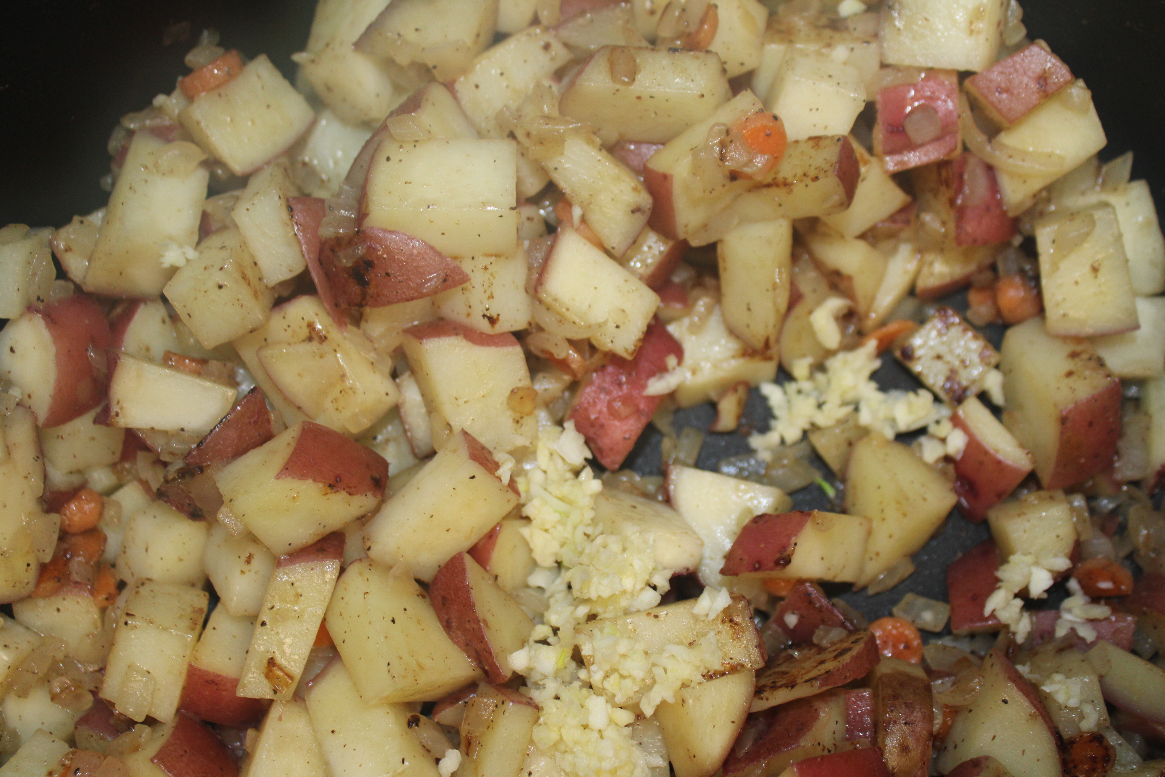 Add the diced onion to the soup pot; sauté for about 3 minutes, until onions are translucent. Add the diced potatoes and carrots, sauté for about 5 minutes to bring out their individual flavors. Stir in the minced garlic; continue to cook for another minute.