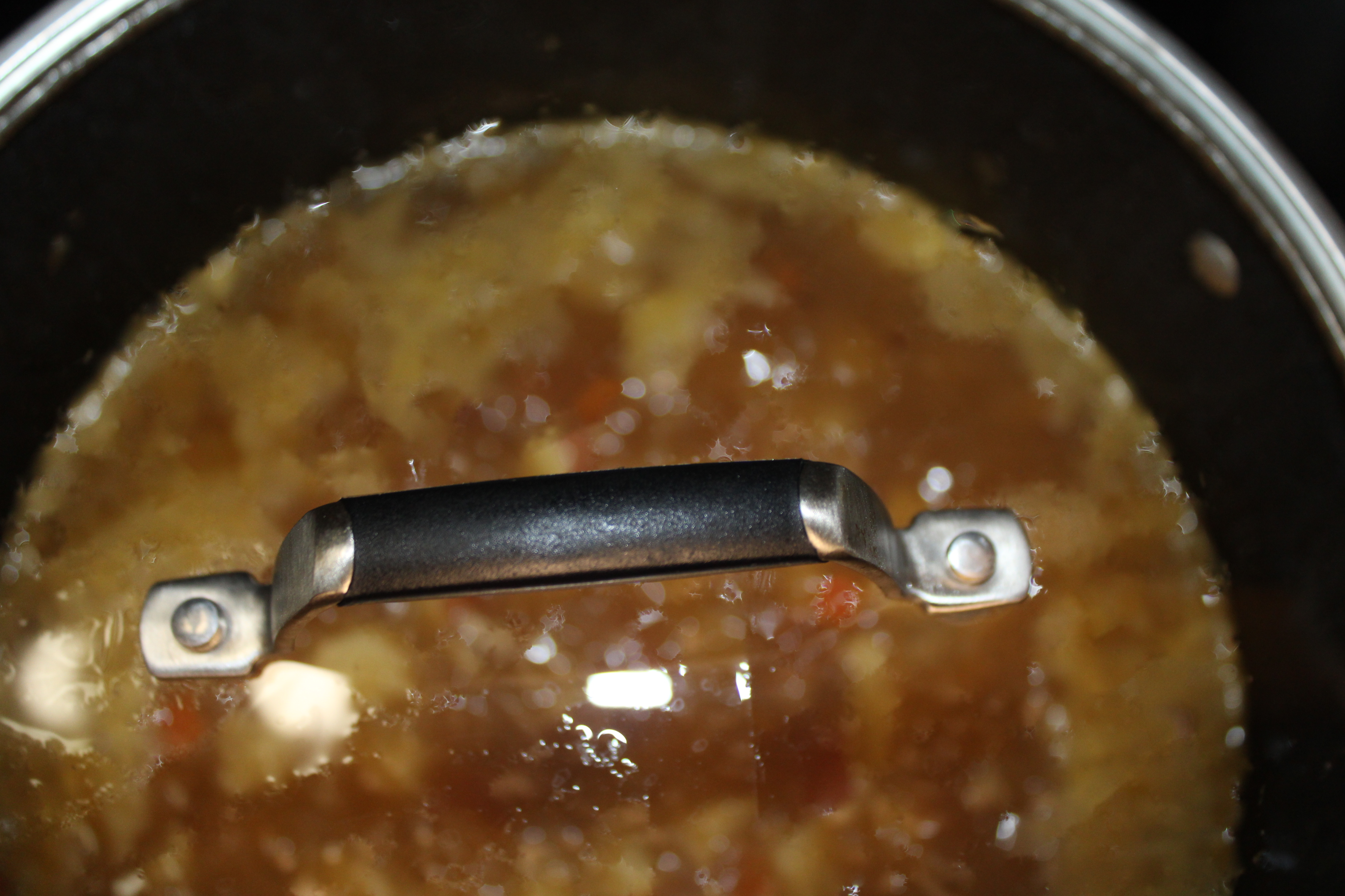 Pour the chicken and vegetable stocks into the pot, bring the mixture to a boil. Reduce heat, cover, and let it simmer for 20 minutes, or until the potatoes and carrots are tender.