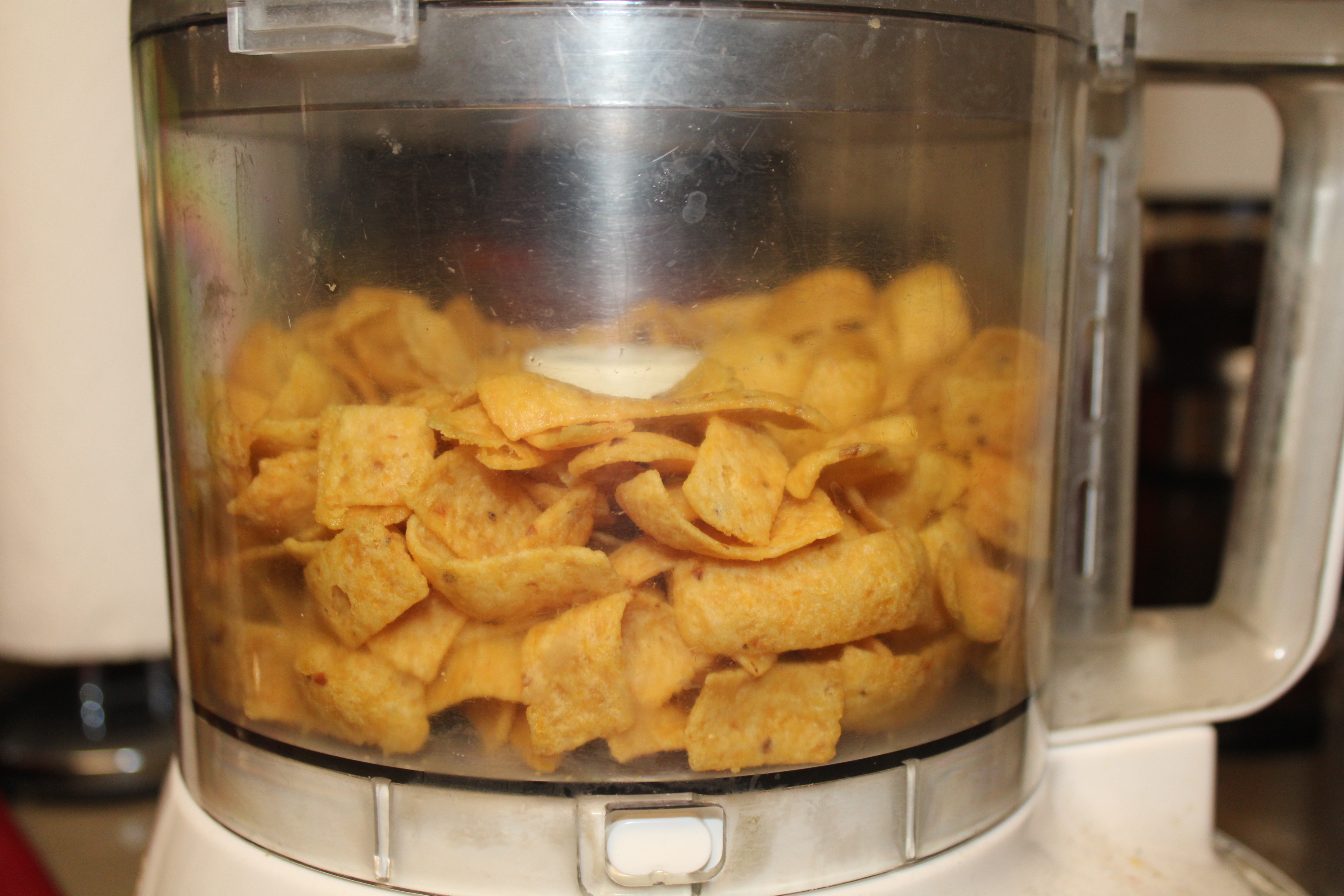 In a food processor fitted with a blade, grind corn chips to create a corn chip meal. Transfer the meal to a mixing bowl; set aside.