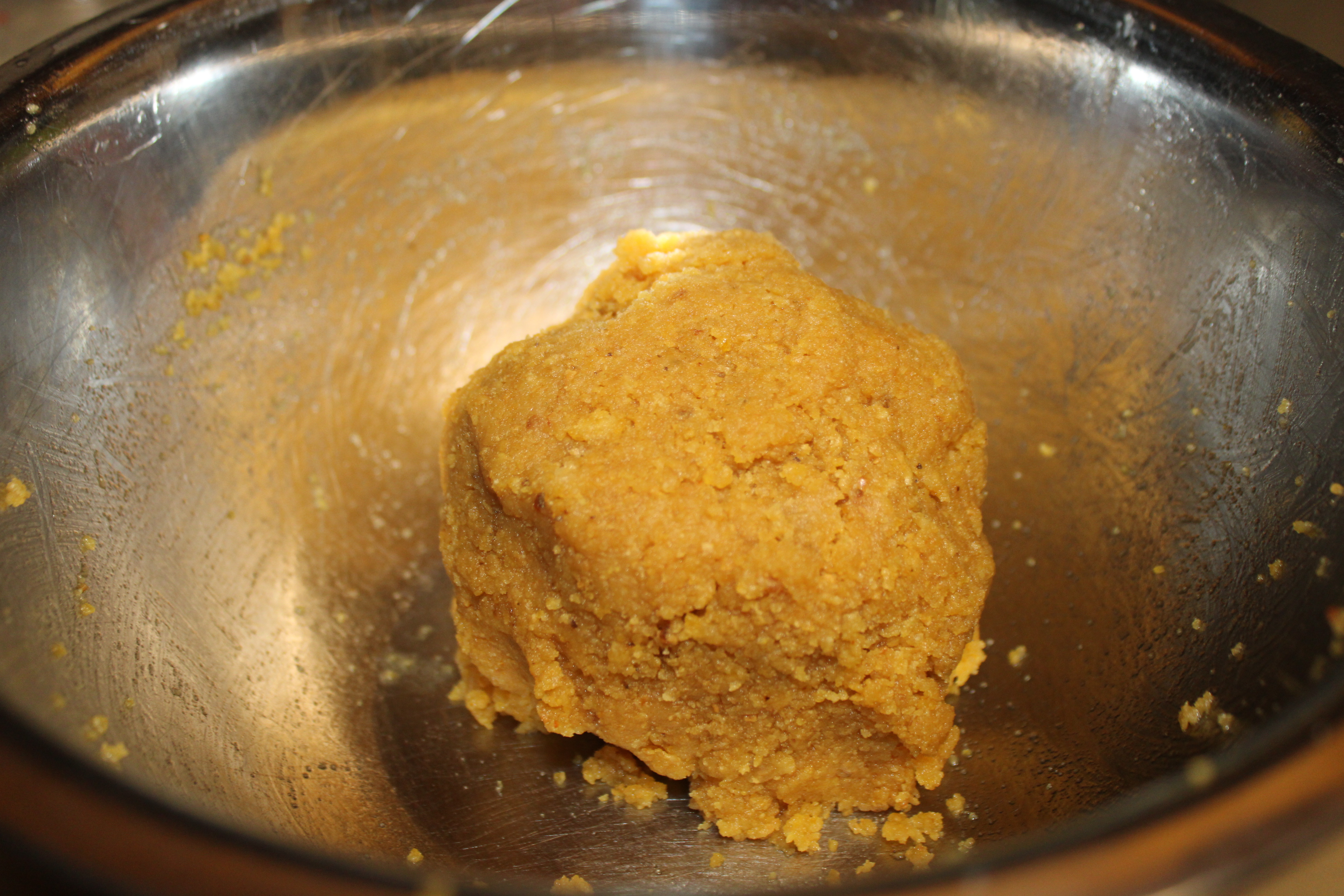 Separate egg whites from yolks. Discard or reserve yolks for another purpose. Lightly beat whites with water. Melt butter. Add the egg whites and butter to the corn meal. With a fork work into a dough-like ball.