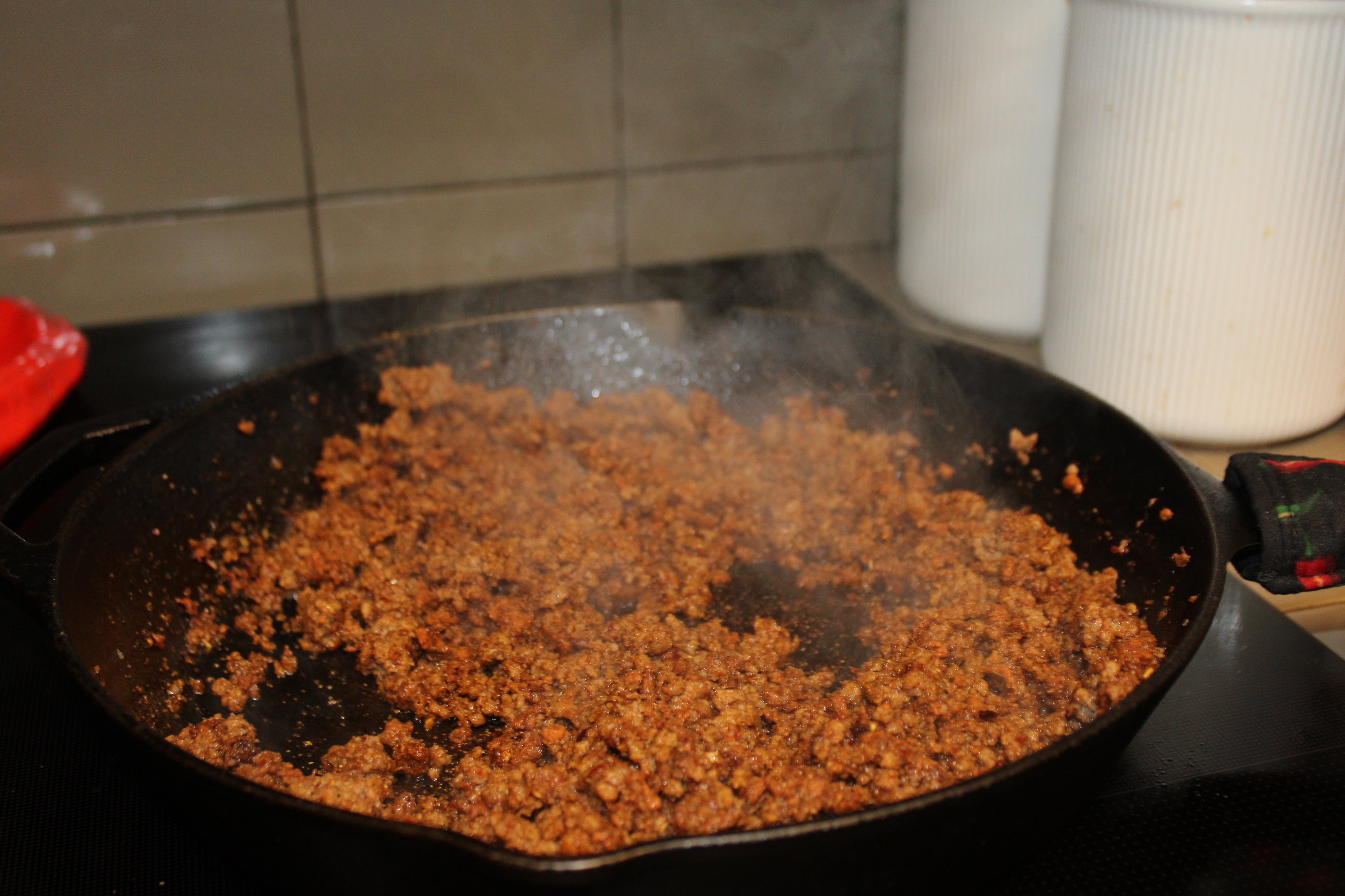 In a cast iron skillet over medium heat brown ground beef with chorizo. Break meats into smaller pieces as they brown to form crumbles of meat. Drain well.