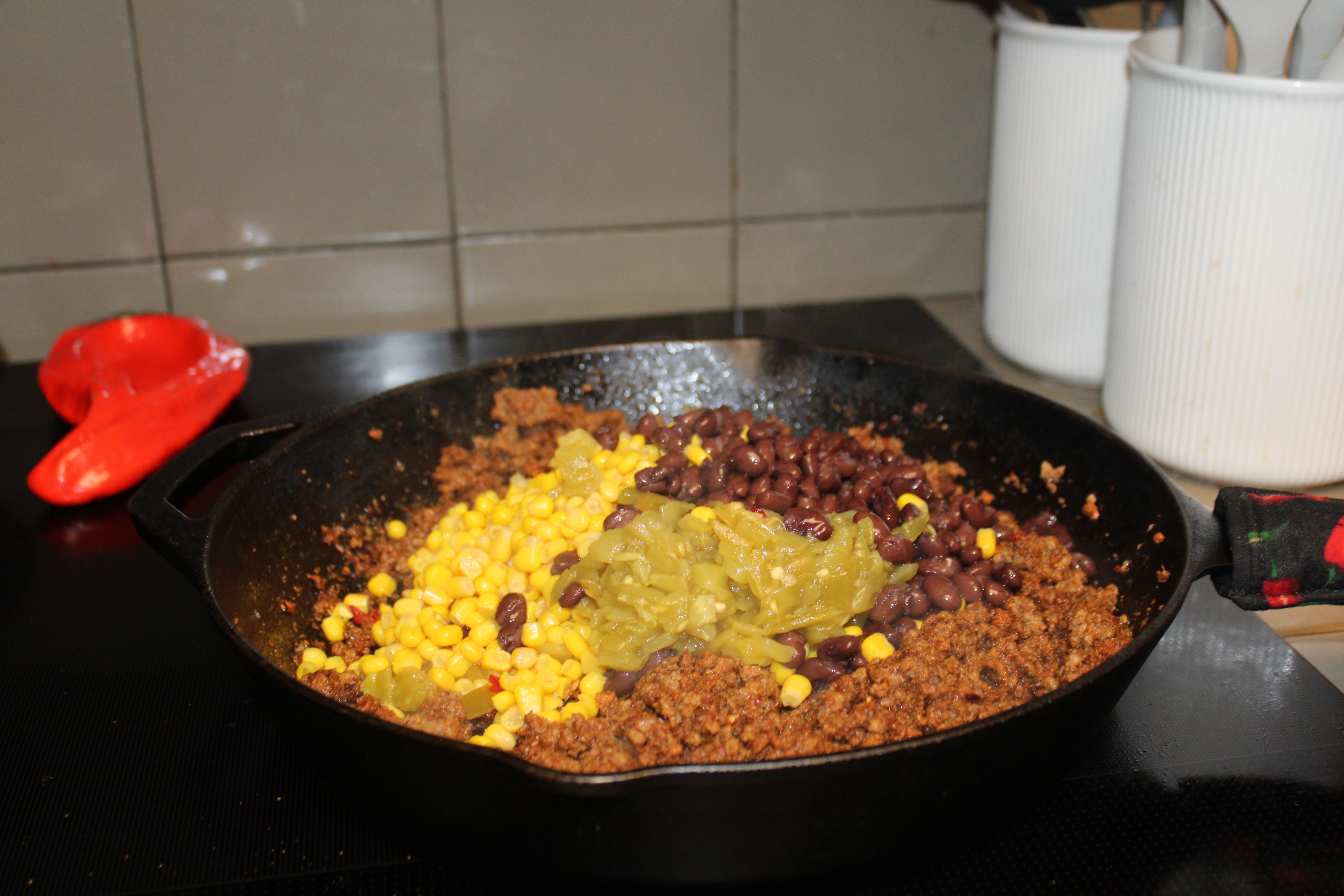 While the meats are browning, drain black beans and corn. Mix together in a bowl with the Hatch Chilies. Shred lettuce. Seed and dice tomatoes. Slice Jalapeño Pepper, set aside.