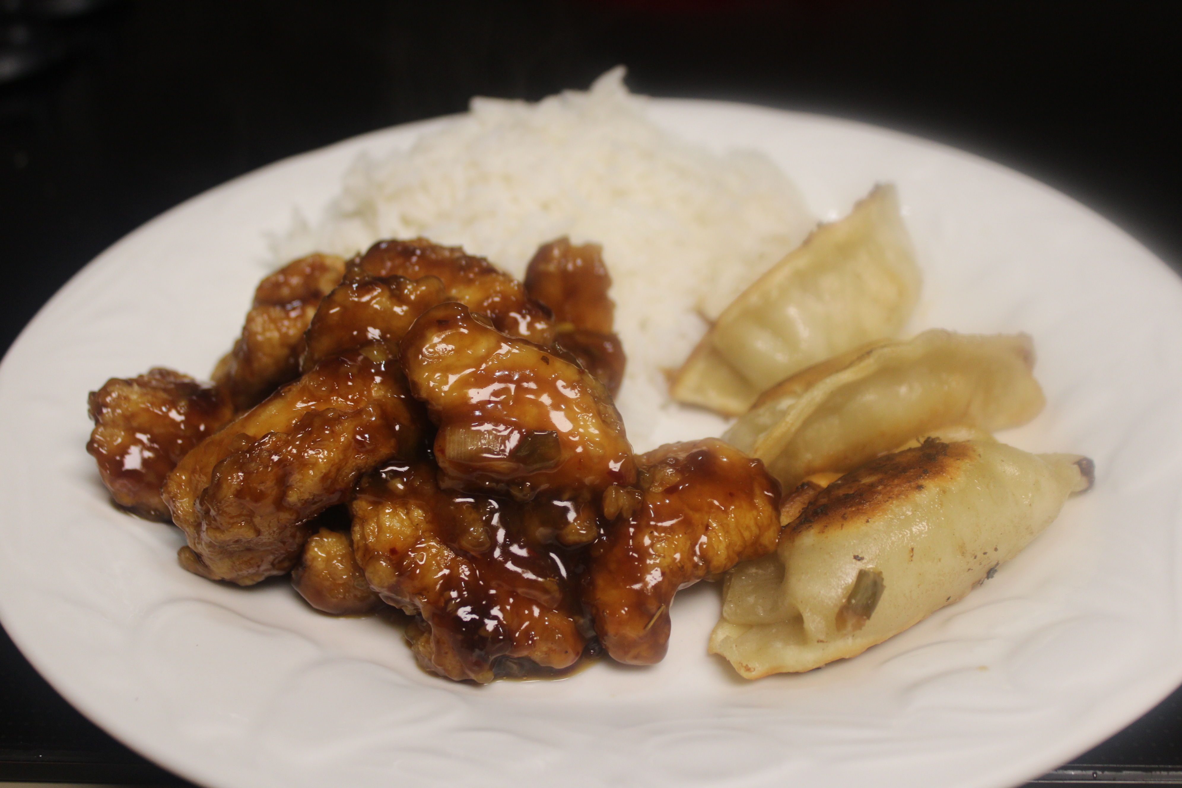 Serve Orange Chicken with Sticky Rice and Steamed Pork Pot Stickers. Great with Tea, hot or cold.
