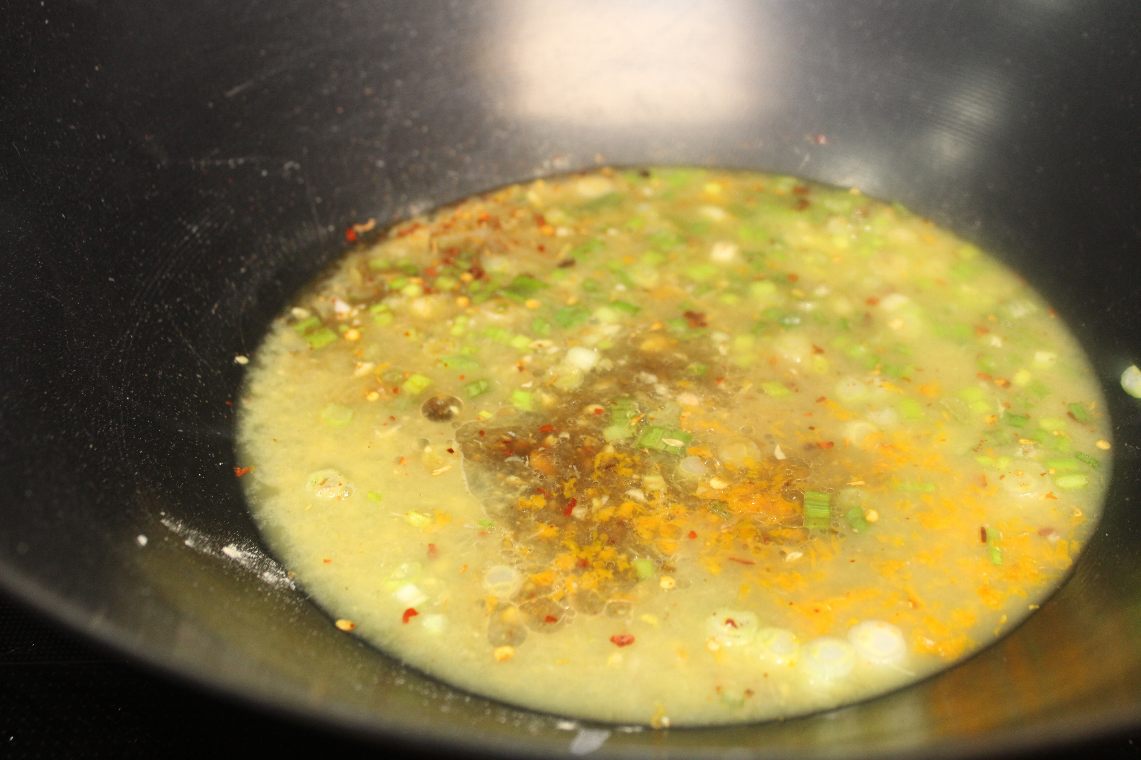 In a wok, whisk green onions, garlic, ginger, orange juice, zest, brown sugar, soy sauce, vinegar, lemon juice and sesame oil. Season with red pepper flakes, salt and white pepper. over medium-high heat. Bring to a simmer, cook 4-5 minutes.