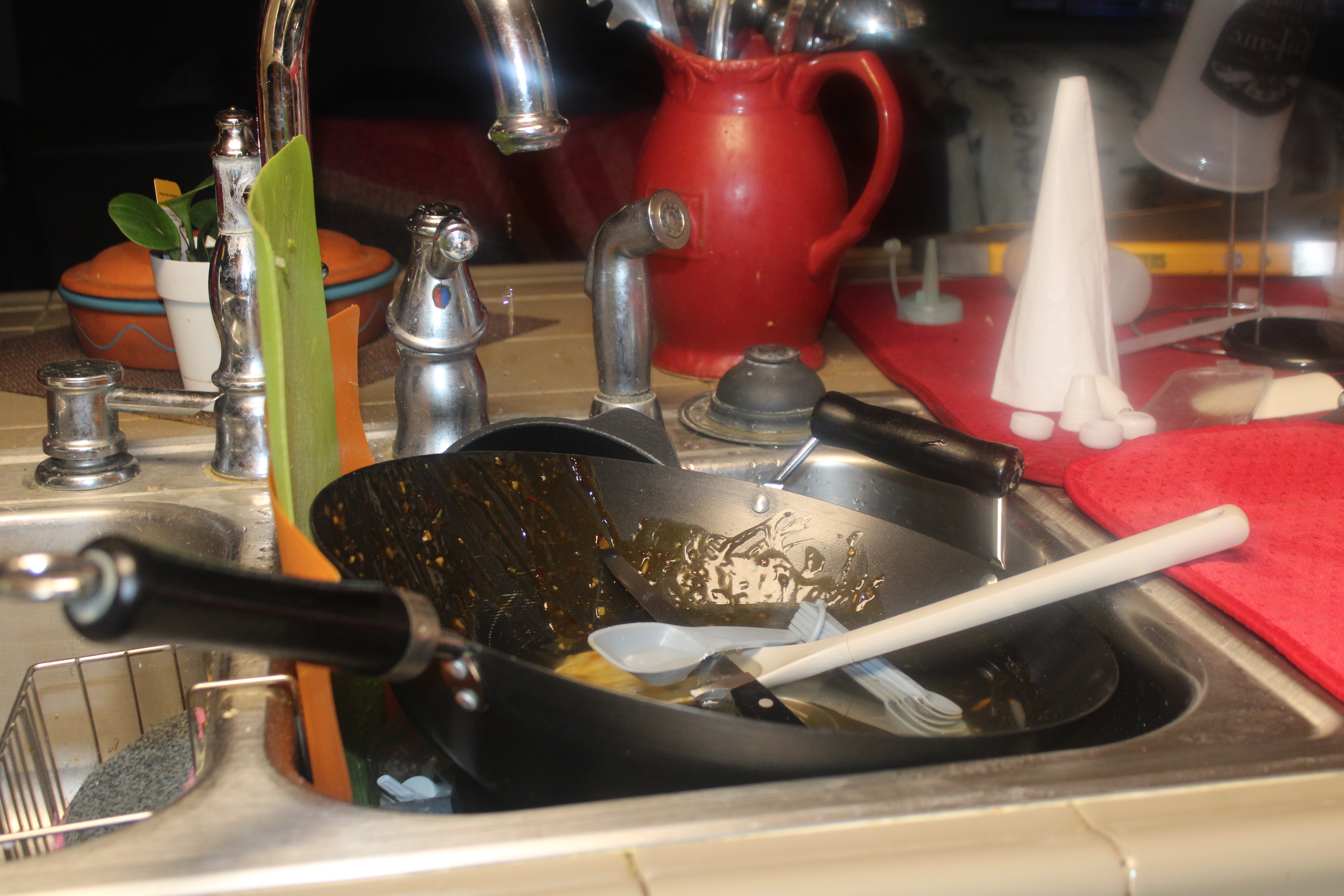 So we agree, take out gives you variety that is difficult to recreate in the home kitchen. Another advantage to take out is there’s no mess to clean up. Just look at my kitchen – all I made was Orange Chicken, Rice and warmed up Pot Stickers from the frozen section. There’s a pot for the rice, a wok for the sauce, a skillet for the chicken and another skillet for the pot stickers. And of course, knives, measuring spoons, measuring cups, cutting boards – you get the idea.