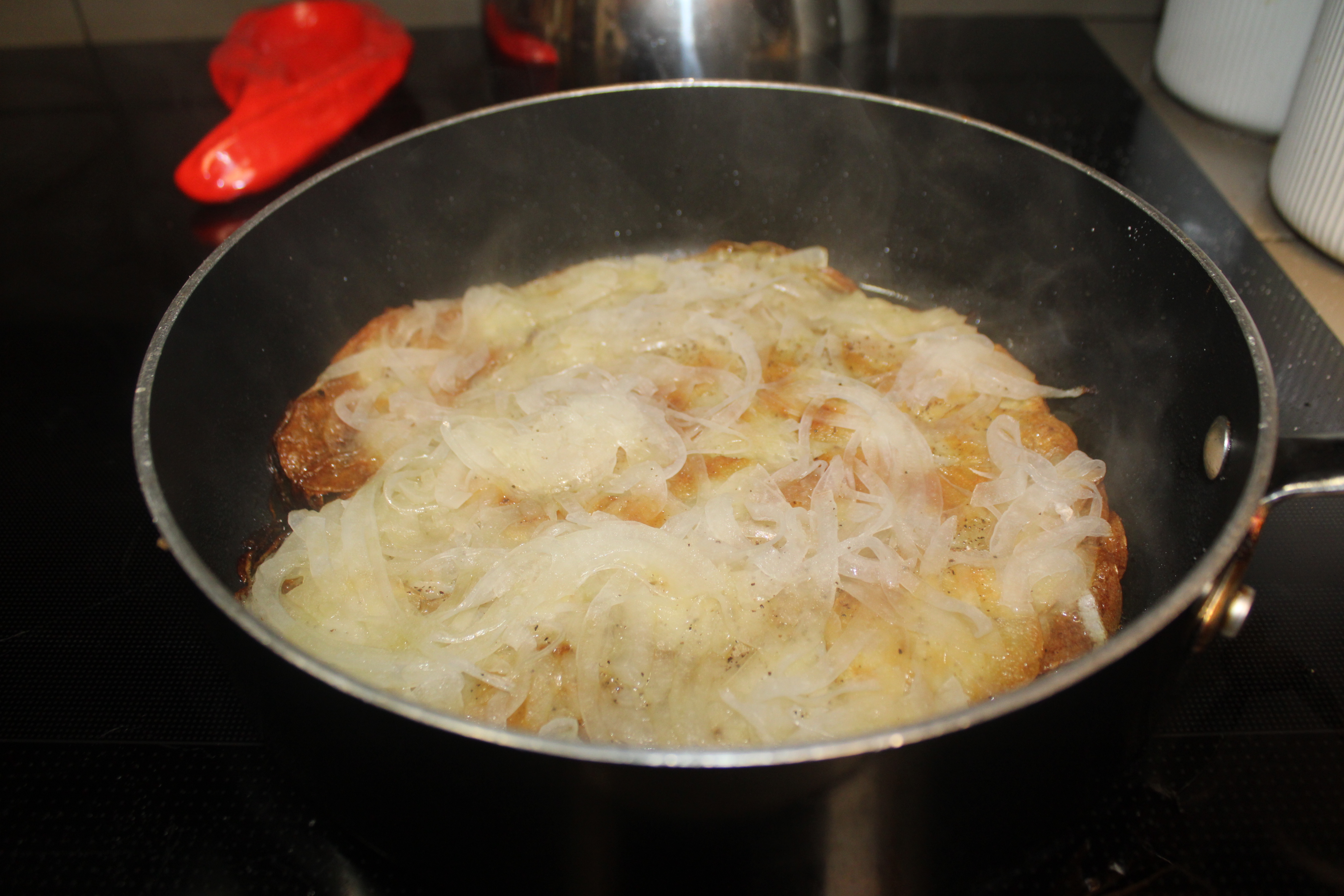 Heat oil over medium-high heat in a large skillet. Layer potatoes overlapping; season lightly with salt and pepper between layers. Fry potatoes, undisturbed until the underside is golden brown, about 10 minutes. Carefully turn potatoes over either with a large spatula or invert onto a plate, then slide back into the skillet browned side up. Scatter the onions over the potatoes, reduce heat to medium; cover and continue to cook until the onions are soft, about 7 minutes longer.
