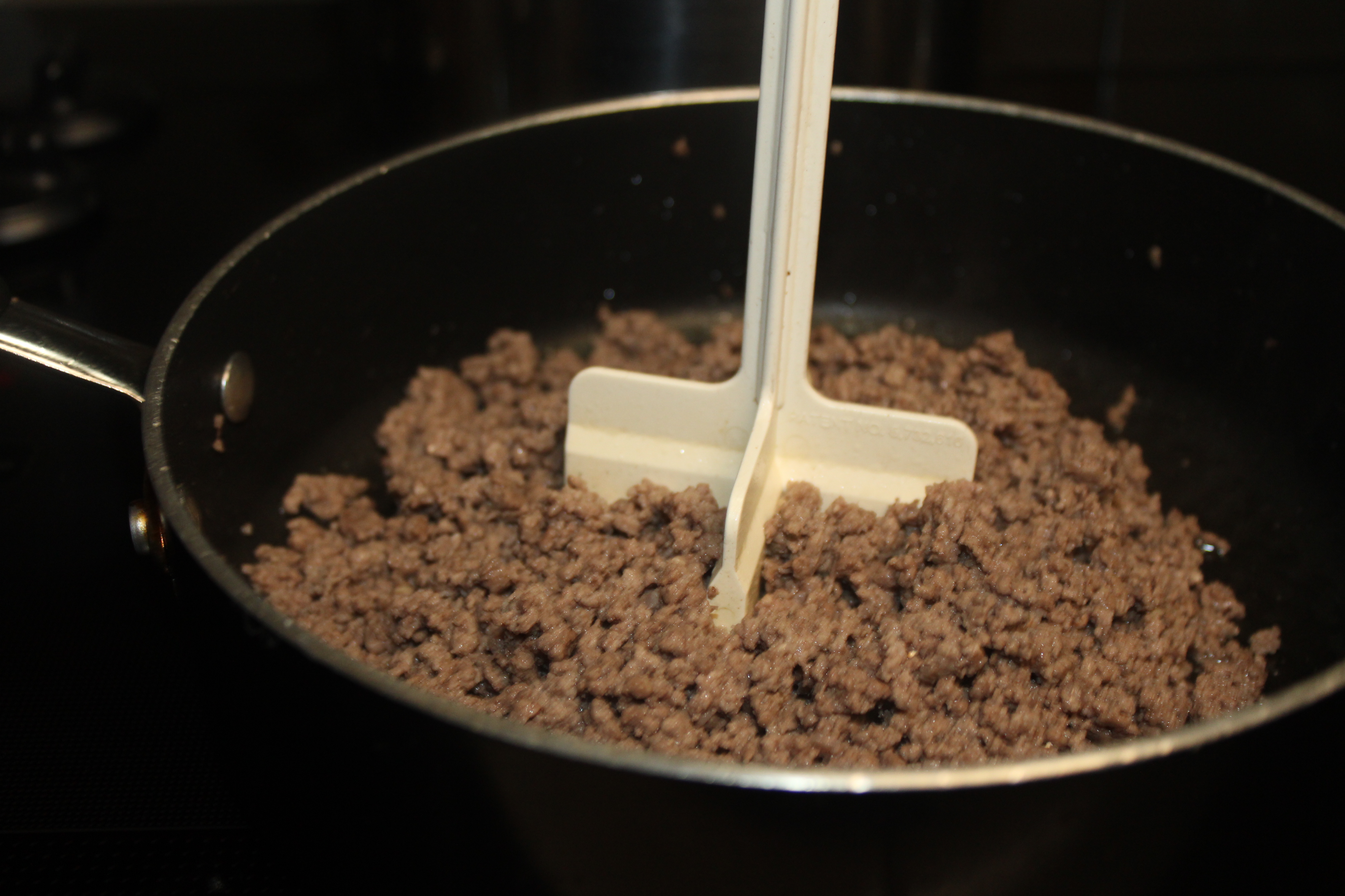 In a large bowl mix together the sour cream, cream cheese, and mushroom soup. Pour into the skillet with the ground beef.