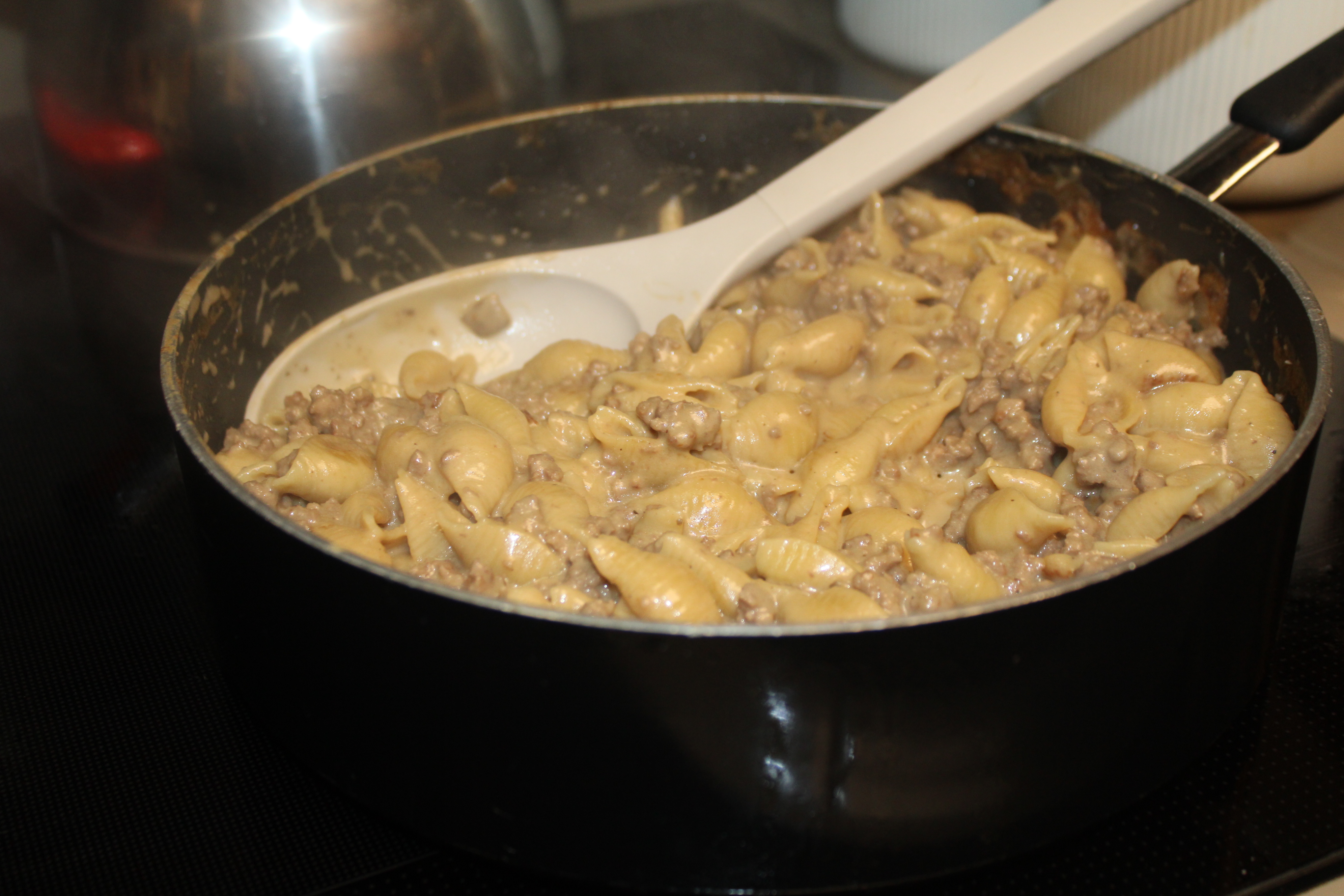This recipe was suppose to be finished as a casserole; not a skillet supper. It used egg noodles (which we didn’t have in the cupboards); several different cheeses and at least one other cooking vessel. The box of pasta shells had been in the pantry for a while. We really needed to use it up. And the mushroom soup – that’s a good place to get some inspiration. So I began gathering ingredients and spreading them out on the kitchen table. This will work, but not with that. Eventually fond memories of Hamburger Helper from my college days with small children to feed came floating back. Yeah, a box supper without the box, just with the ingredients we had on hand. The only thing this meal added to our shopping list was the Brown Gravy Mix. Gravy is something I make from scratch; not from a package. I wanted the mix for two reasons – enhancing the beefy flavor and as a thickening agent. My guys gobbled it up.
