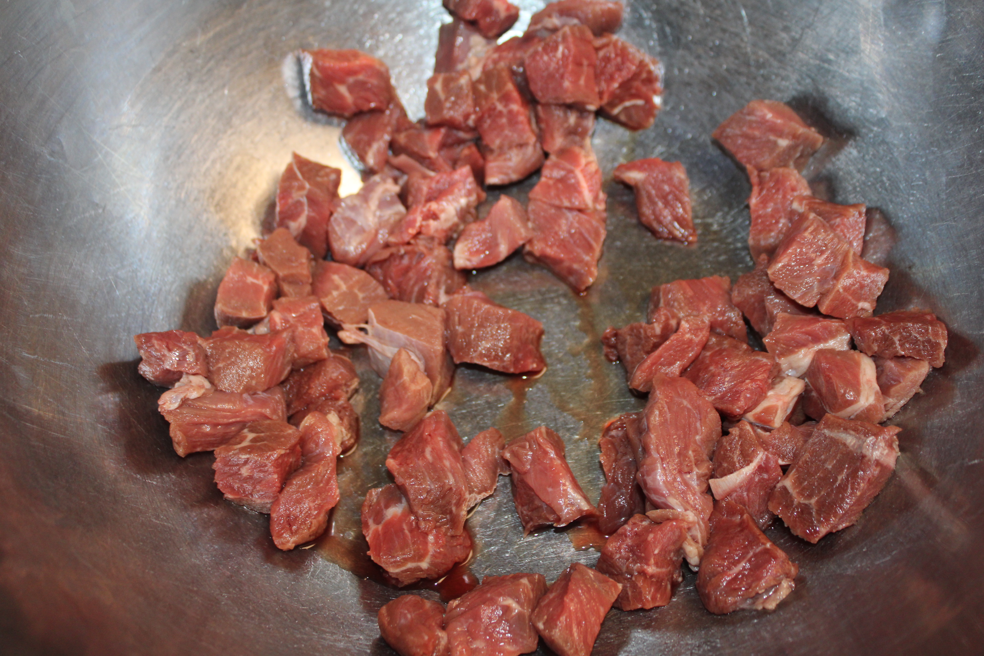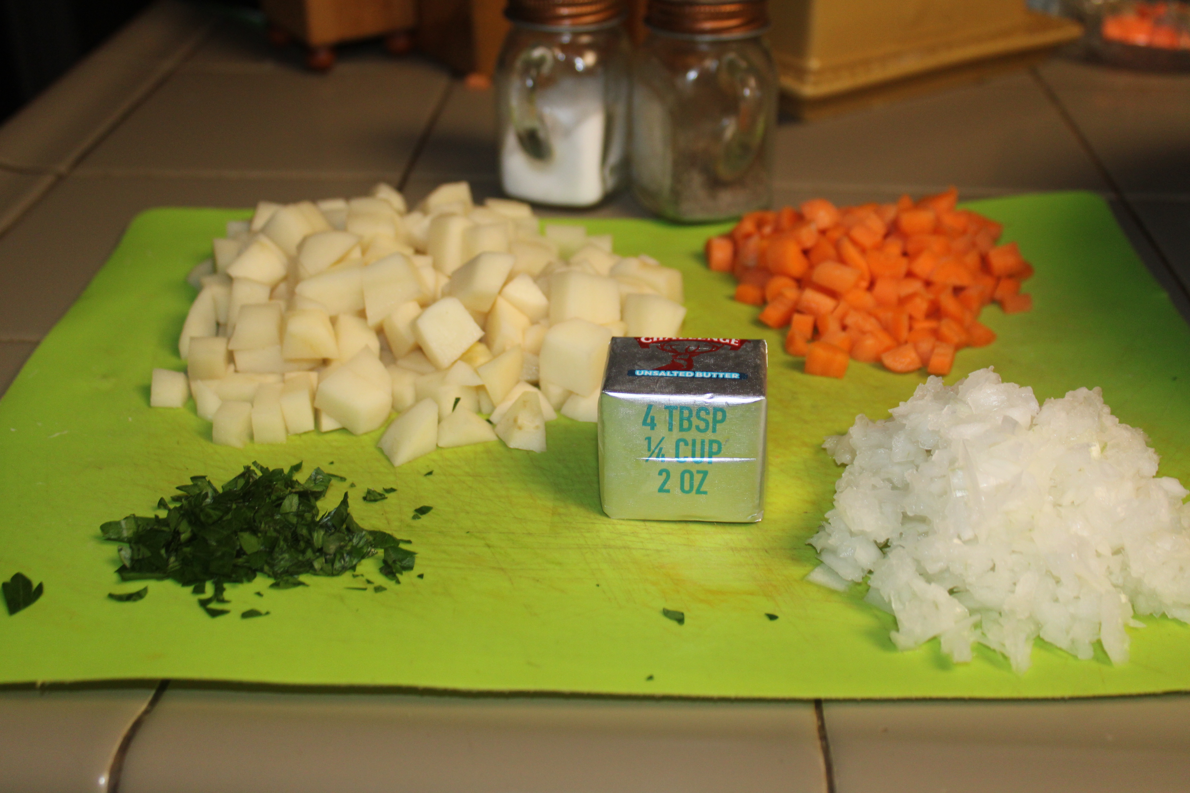 Cut steak into half-inch pieces. Peel potatoes, cut into half-inch cubes. Peel and dice the carrots. Peel and finely chop onion. Mince parsley.