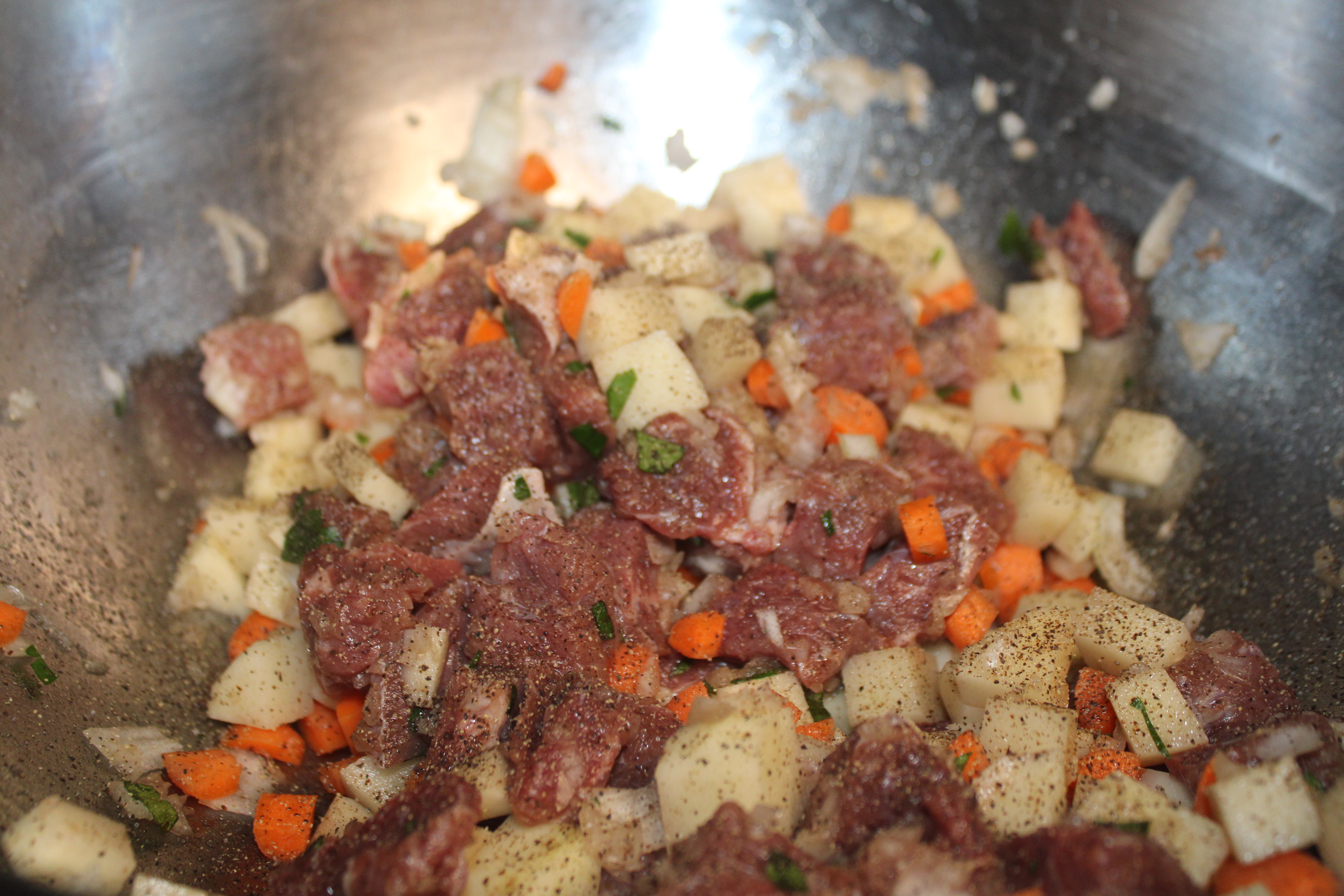 In a large bowl combine the steak, potatoes, carrots, onion and parsley. Season with salt and pepper. Melt butter, pour over meat mixture, toss to coat; set aside.