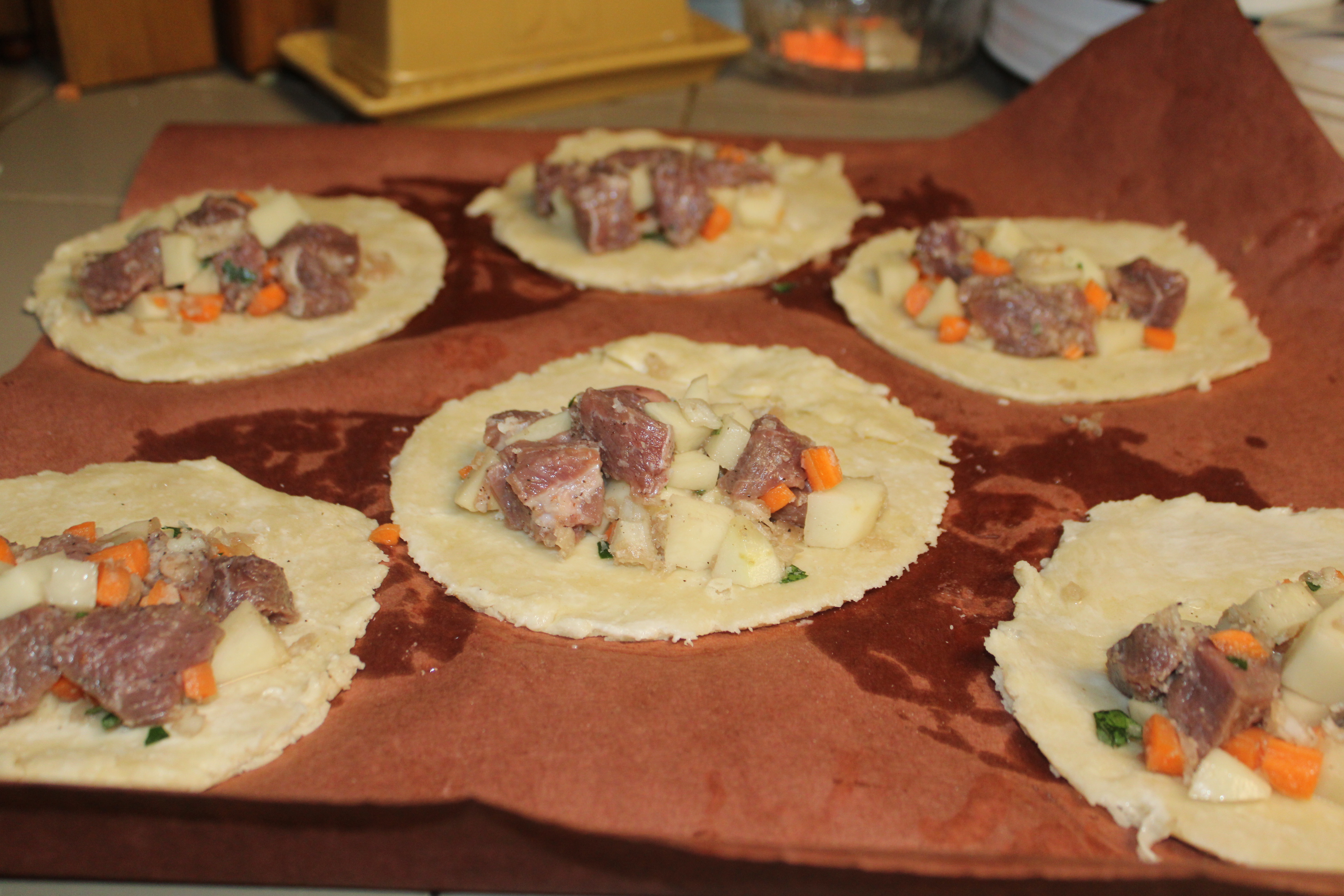 Divide dough in 6 portions. Roll out one portion at a time into a 8-inch circle. Transfer to the prepared baking sheet. Divide the filling amont the pastry circles, mounding slightly on half of each circle. Moisten edge with water; fold dough over the mixture, press to seal edges with a forl. Repeat with remaining pastry and filling.