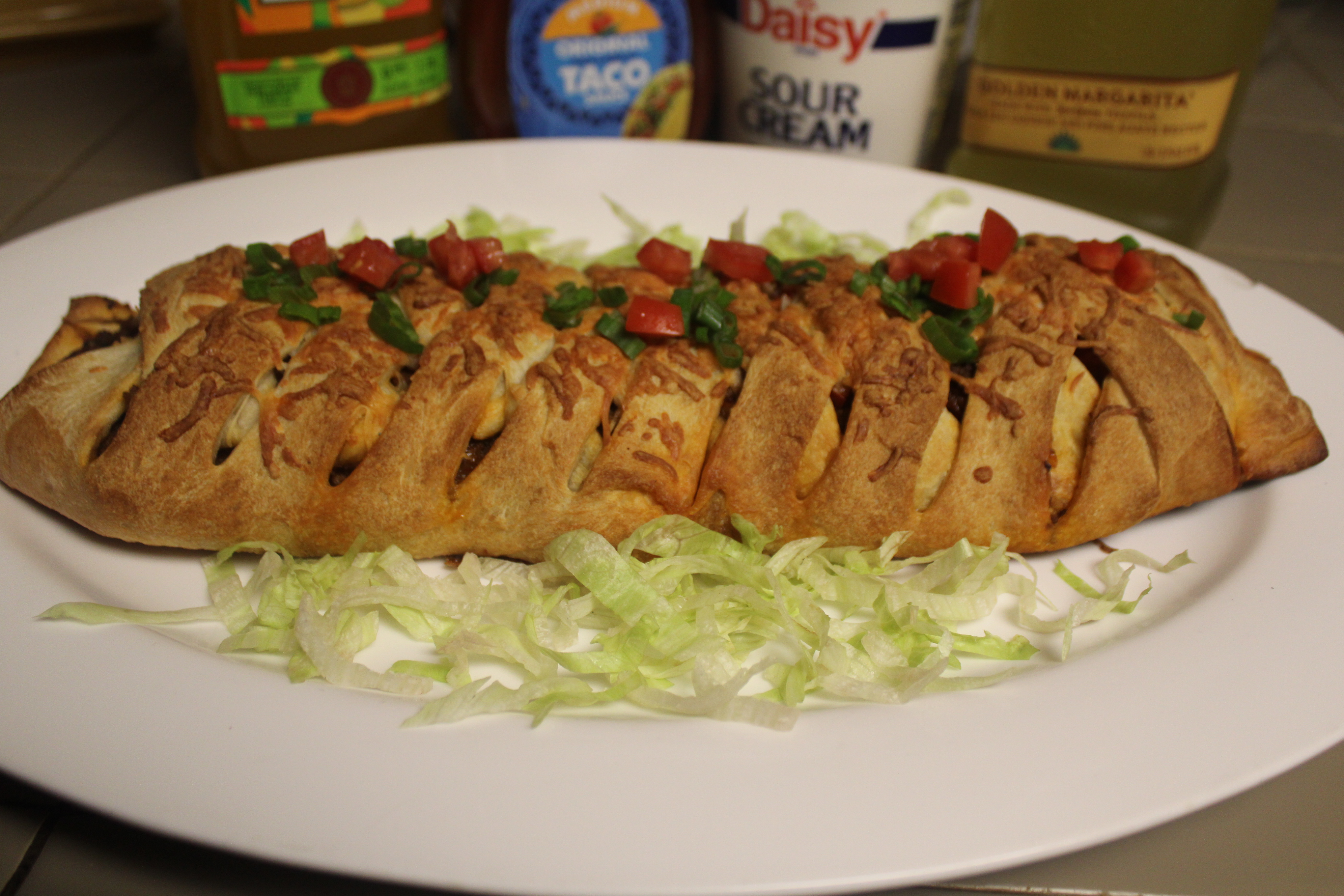 Remove from oven and allow to cool for 5 minutes. Carefully lift taco braid with the parchment paper and slide onto a large serving platter. Scatter half of the shredded lettuce around the braid, reserving the remaining half to use as desired once the braid has been served. Garnish with remaining tomatoes and green onions. Serve with sour cream and taco sauce to pass around the table. Don’t forget the margaritas!
