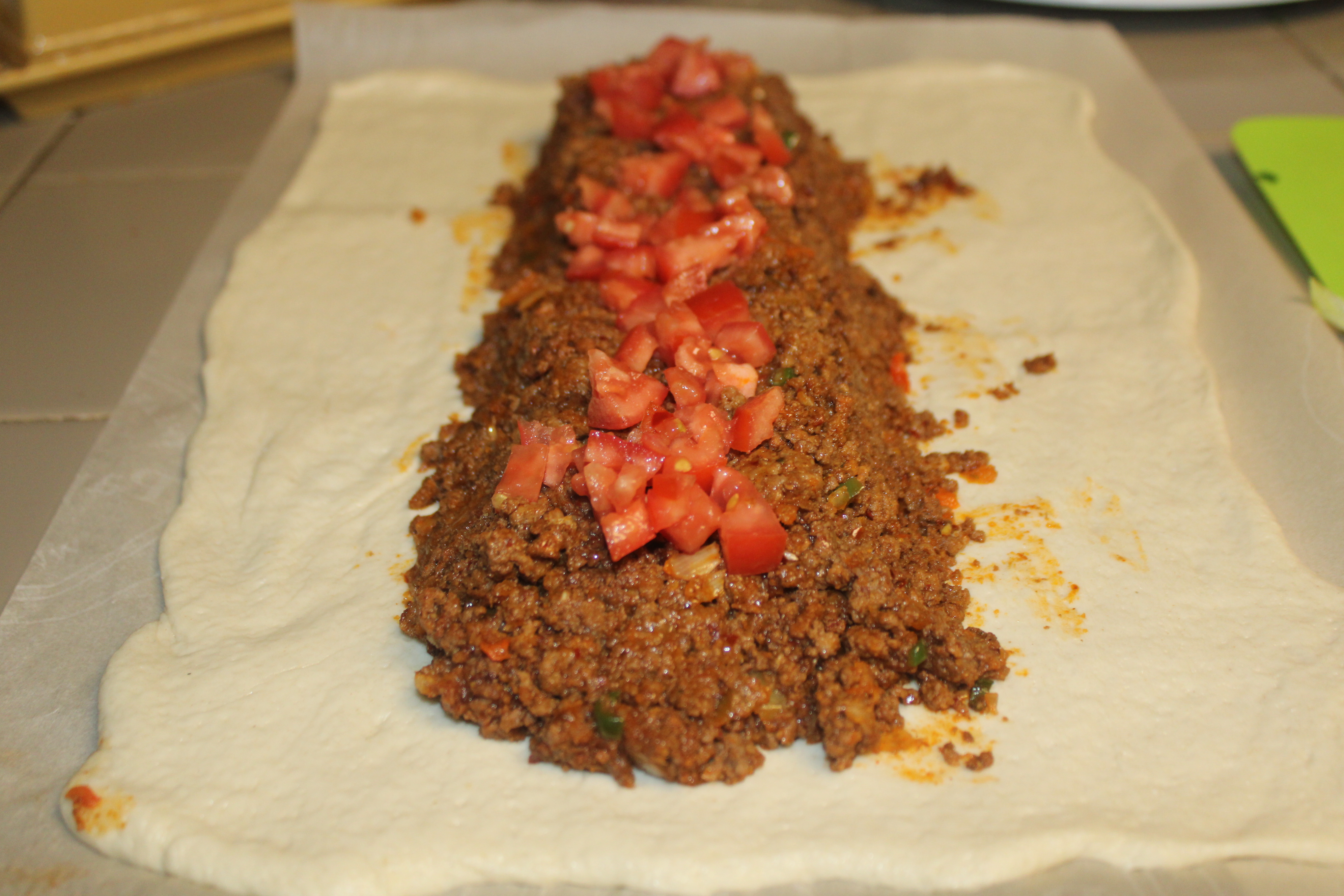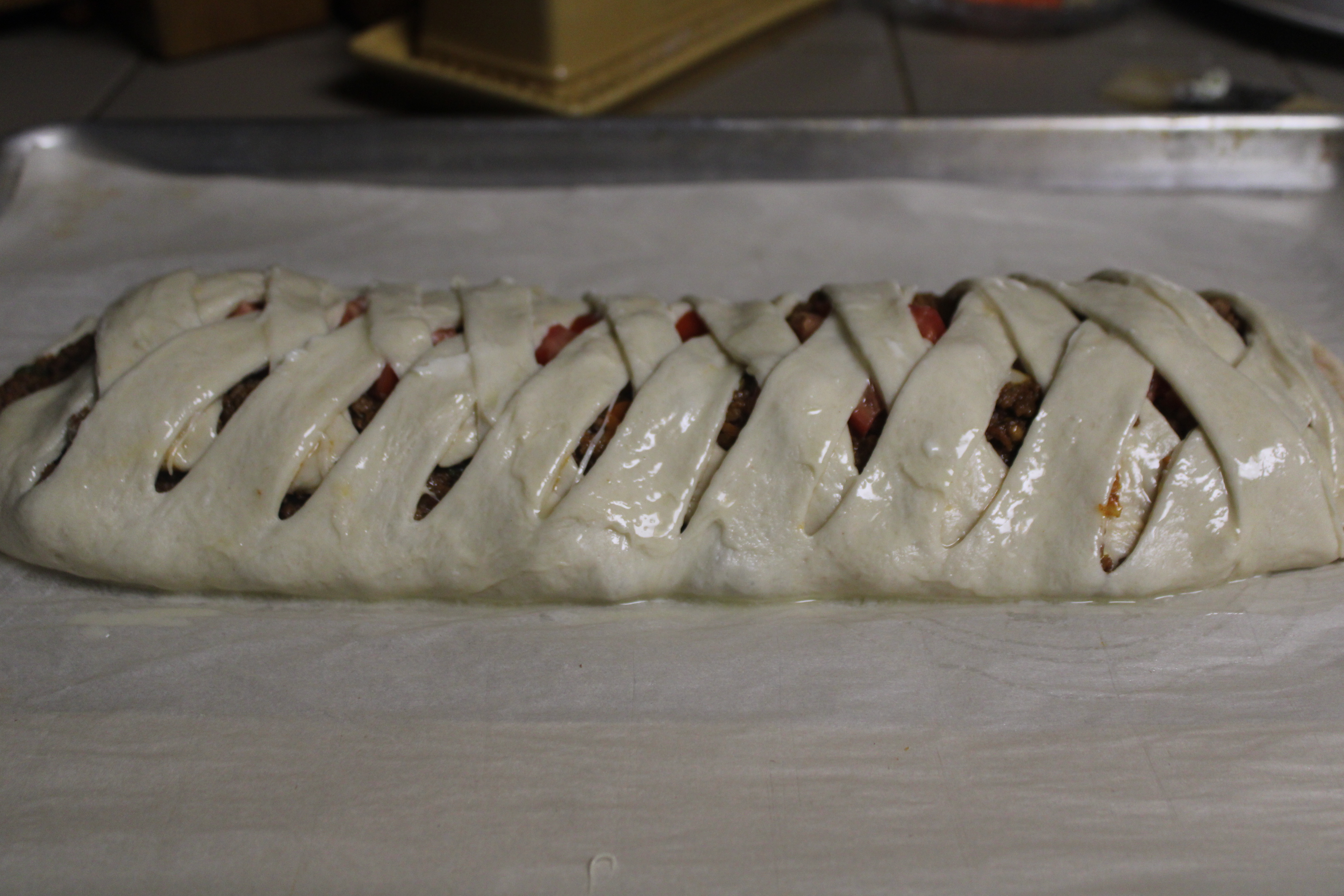Transfer the piece of parchment to your work surface. Place the pizza dough on the parchment and roll it so that it measures 10 inches by 15 inches. Mound the ground beef mixture down the center of the dough with a large spoon. Scatter about half of the diced tomatoes over the meat filling. With a pizza cutter, make slices in the dough about 1-1/2 inches wide and 3 inches long on either side of the meat. Beginning at end closest to you, lift strips up and over filling, crossing in the middle. Press ends at next two strips, lift next strips and repeat, moving forward. Repeat the wrapping until the last two. Bring last two over end of braid, tuck and secure with a pinch. Return taco braid on parchment paper to the baking pan.