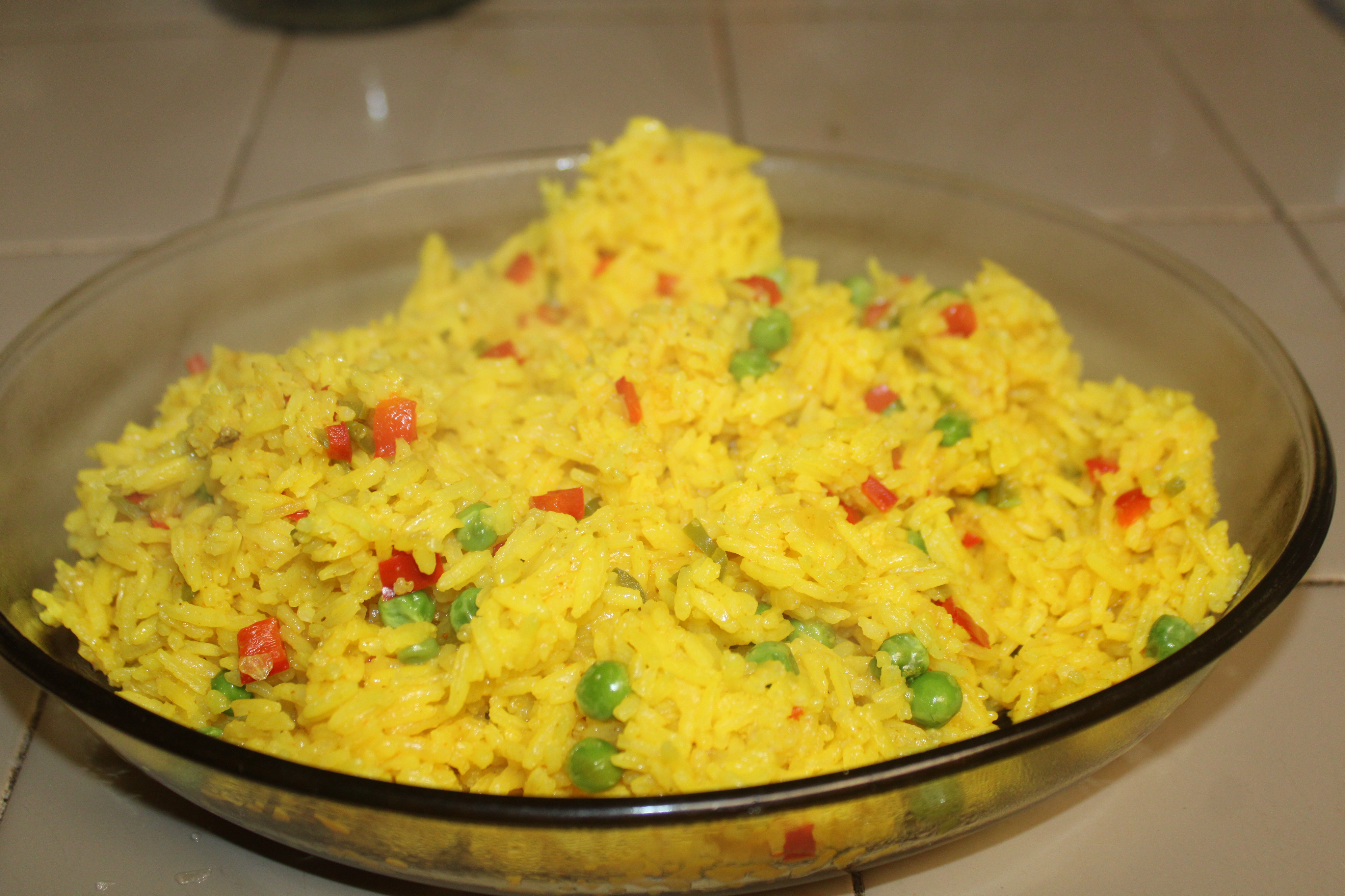 Heat the olive oil in a pan over medium heat. Toss the bell pepper, onion, and Jalapeño into the oil in the pan. Sautee for a few minutes. Press the whole garlic into the pan then add garlic powder, paprika, cayenne and turmeric, sauté for another minute. Add rice, cook for 2 minutes, stirring constantly.