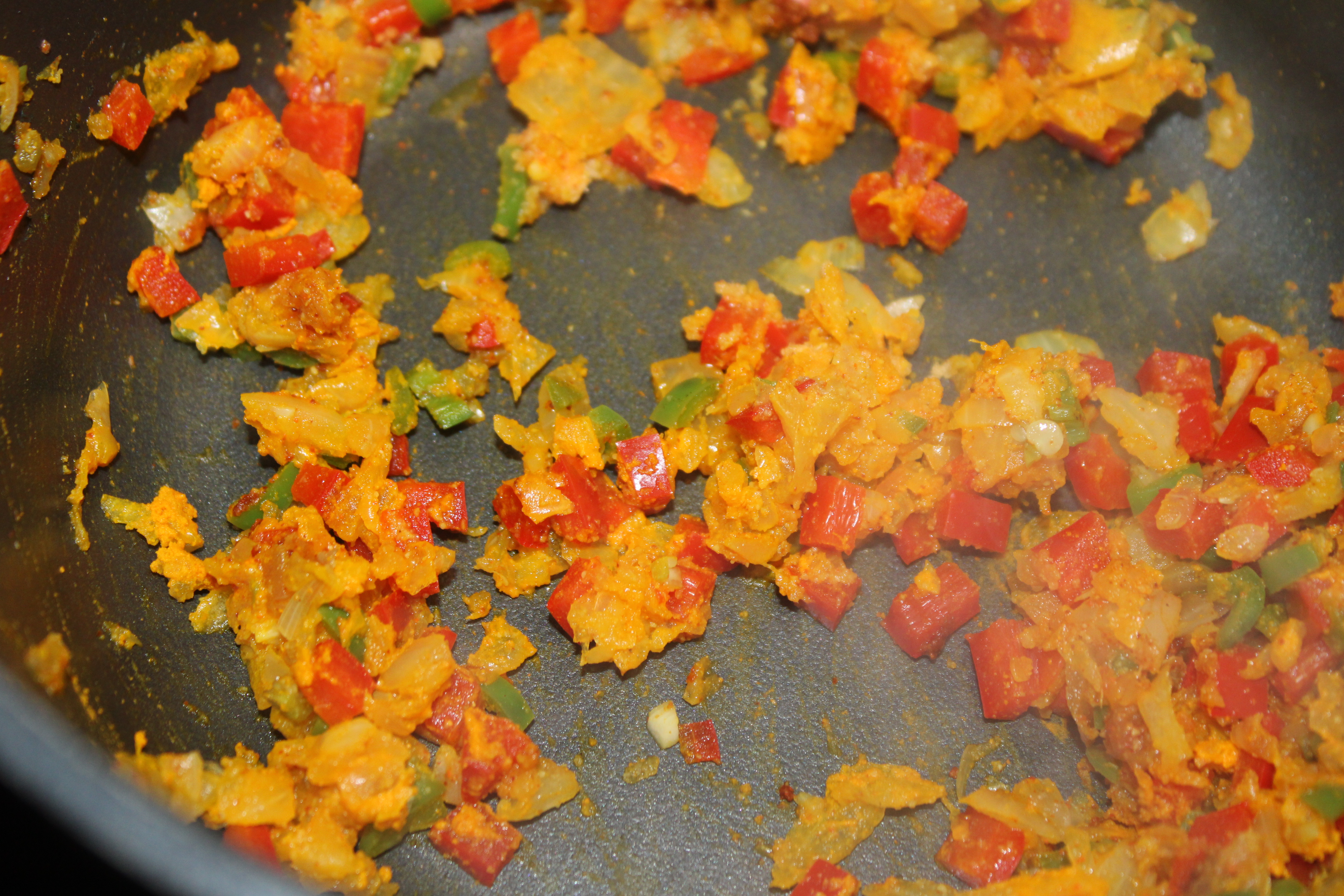 Cut bell pepper in half, core. Reserve half of the pepper for another purpose. Dice remaining half. Cut onion in half from root to tip. Reserve half for another purpose. Peel and dice remaining half. Peel the garlic. Stem and dice Jalapeño. Set aside.