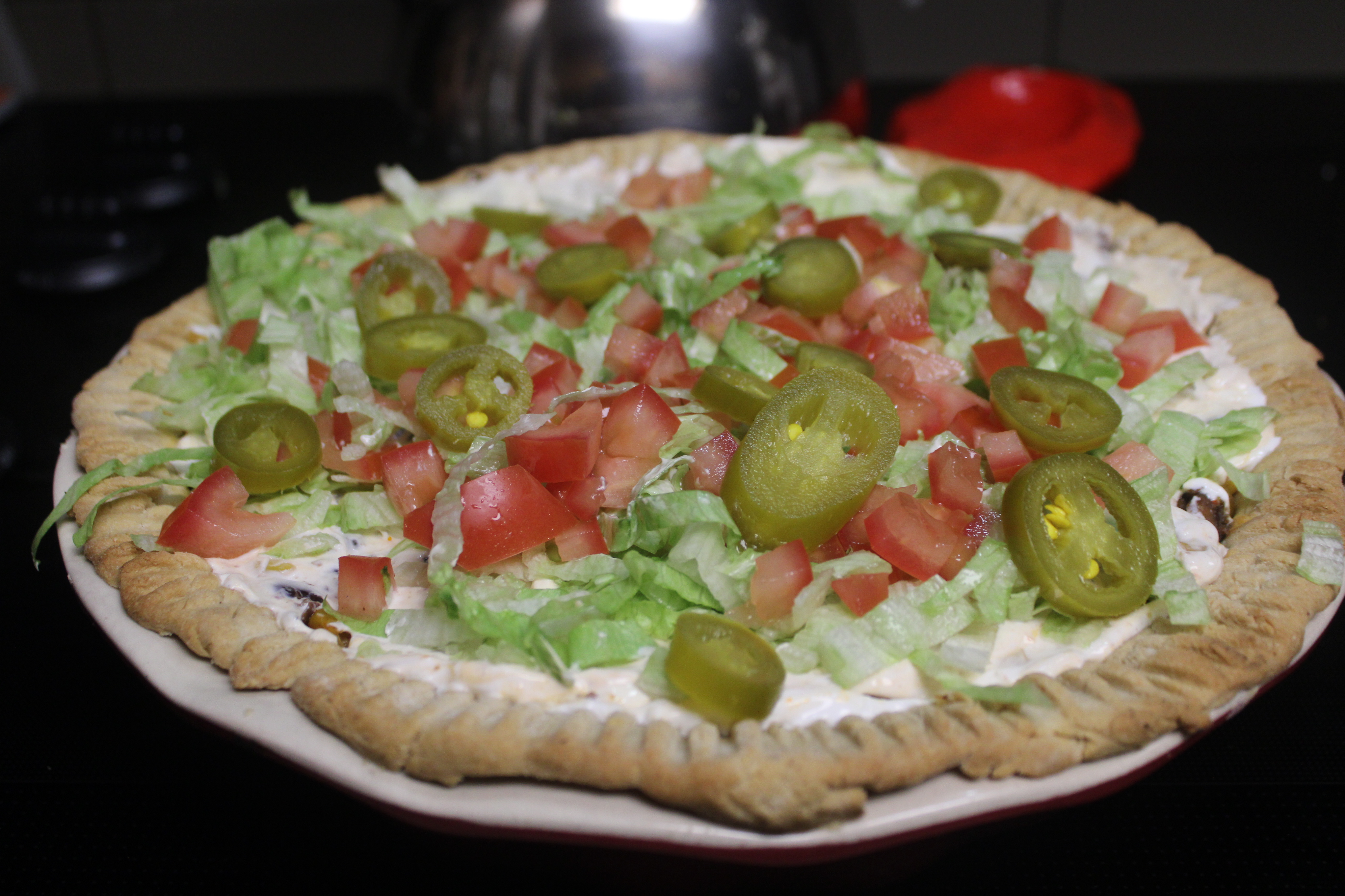 Remove Taco Pie from the oven. Spread sour cream over the top, then scatter lettuce, tomatoes and Nacho Jalapeños. Let pie rest for a few minutes for the juices to settle. Crush chips, scatter over the top then slice, serve and enjoy with your favorite Margarita.